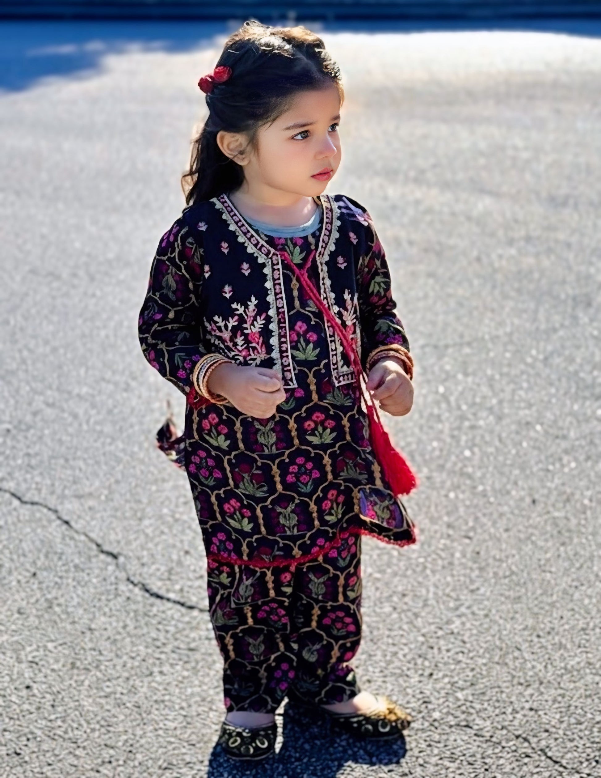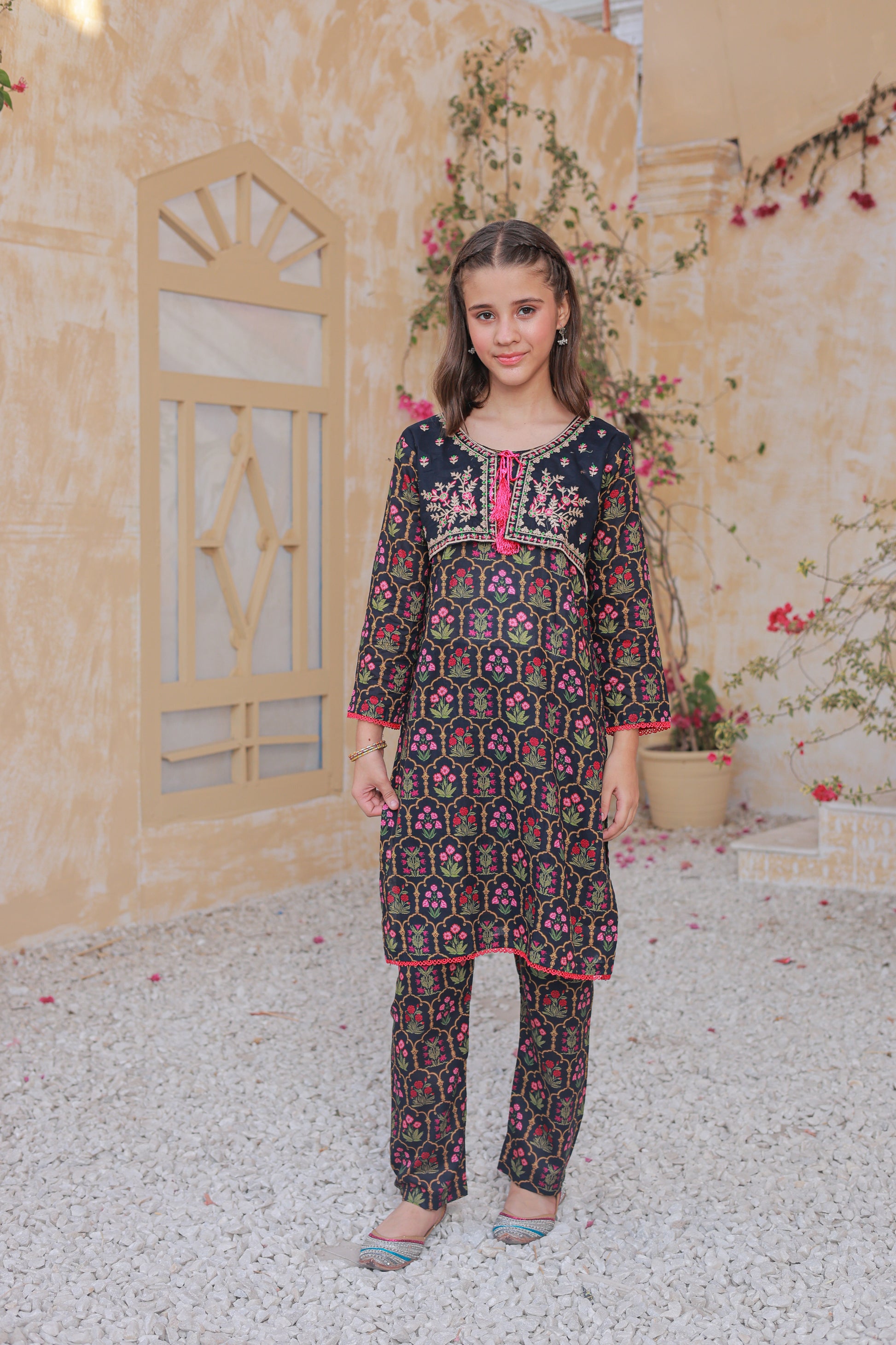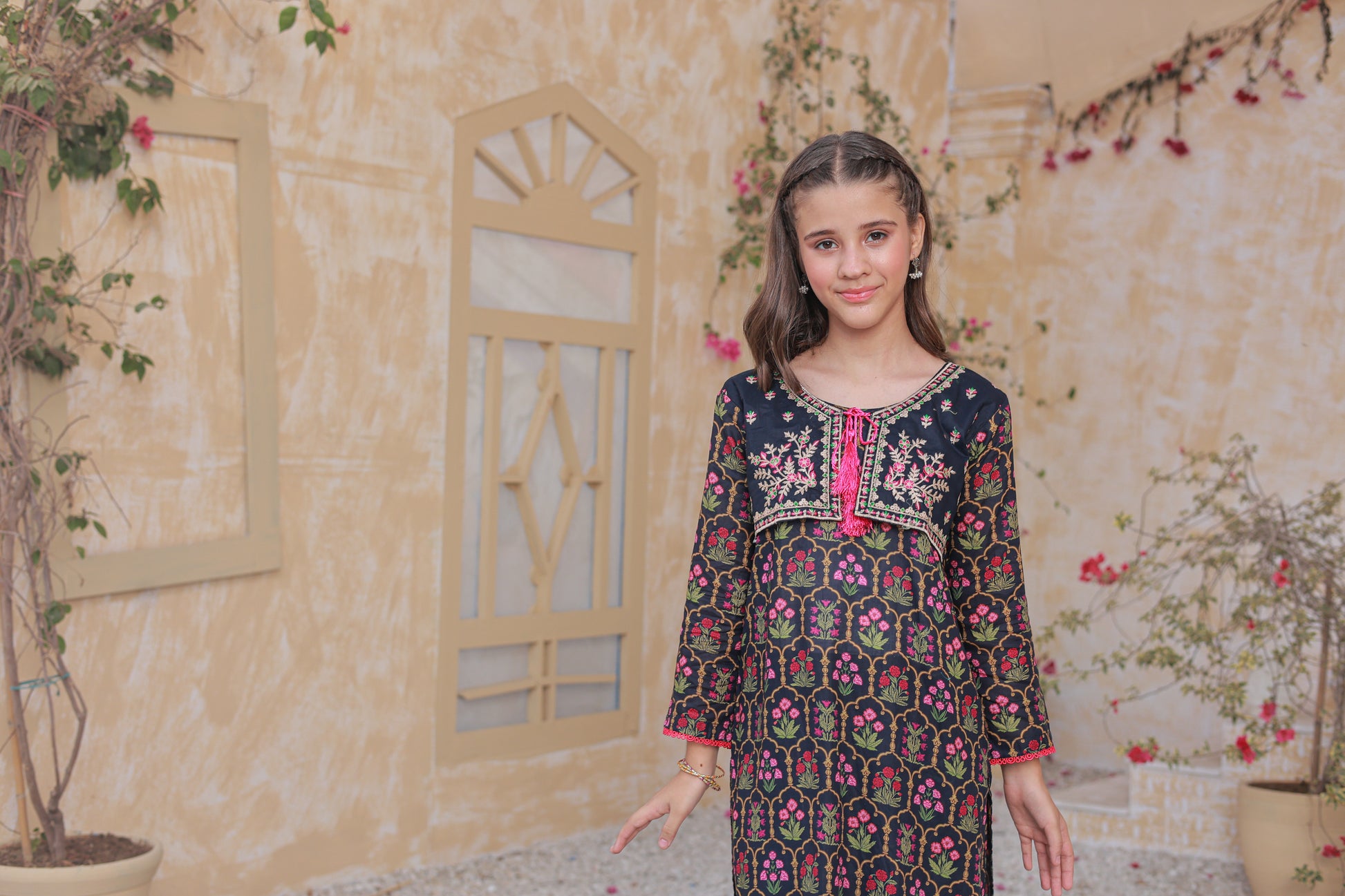 Enhance your child's wardrobe with Khanak's Printed and Embroided Lawn Stitched 2-Piece set. This stylish ensemble includes a digitally printed shirt and cozy trousers, making it the ideal choice for casual outings or fun-filled adventures.