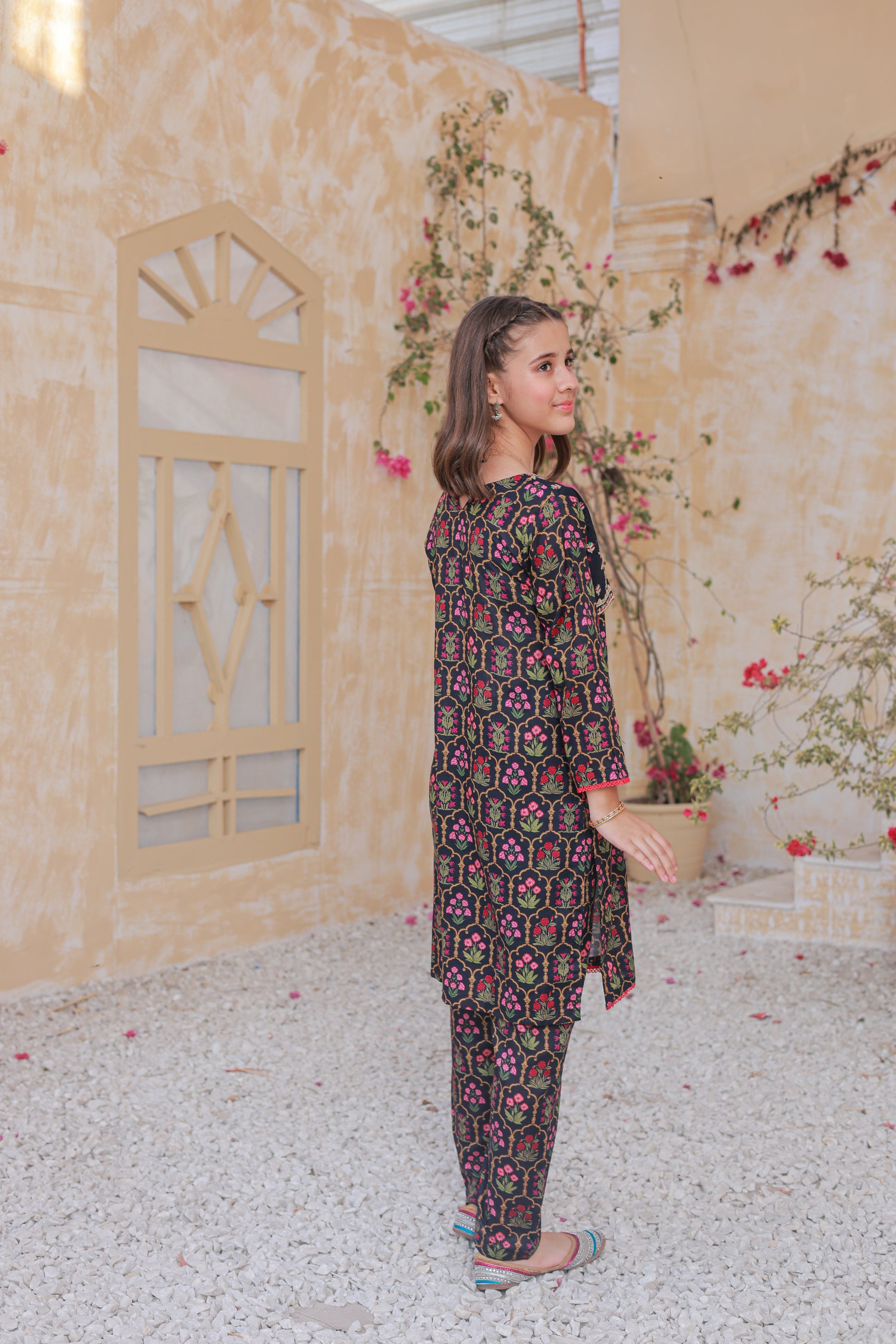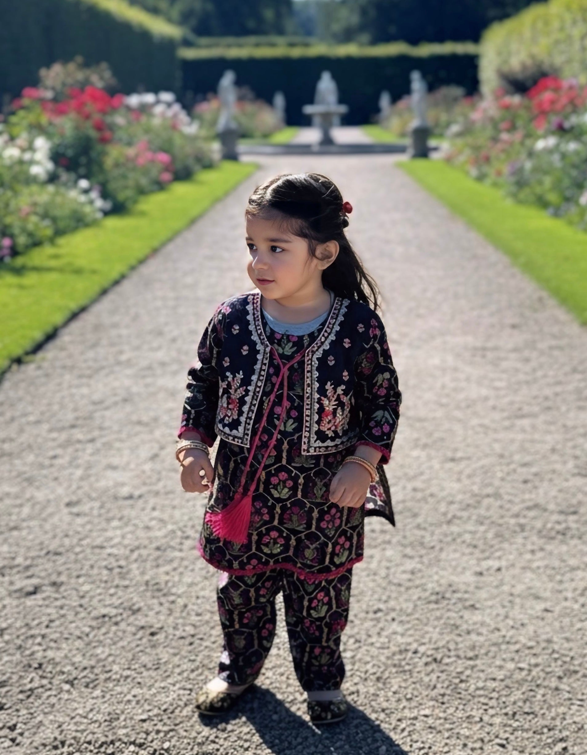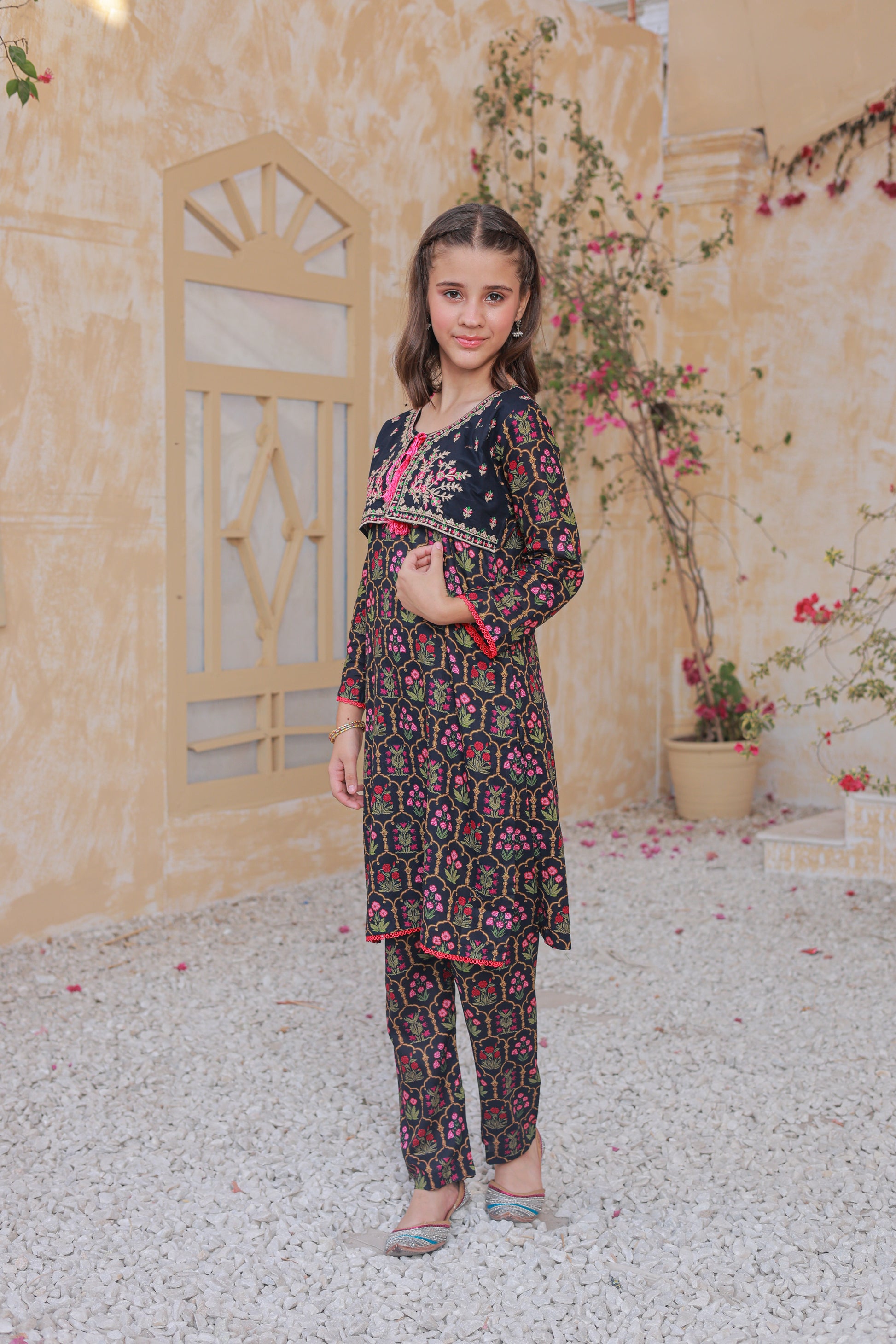 Enhance your child's wardrobe with Khanak's Printed and Embroided Lawn Stitched 2-Piece set. This stylish ensemble includes a digitally printed shirt and cozy trousers, making it the ideal choice for casual outings or fun-filled adventures.