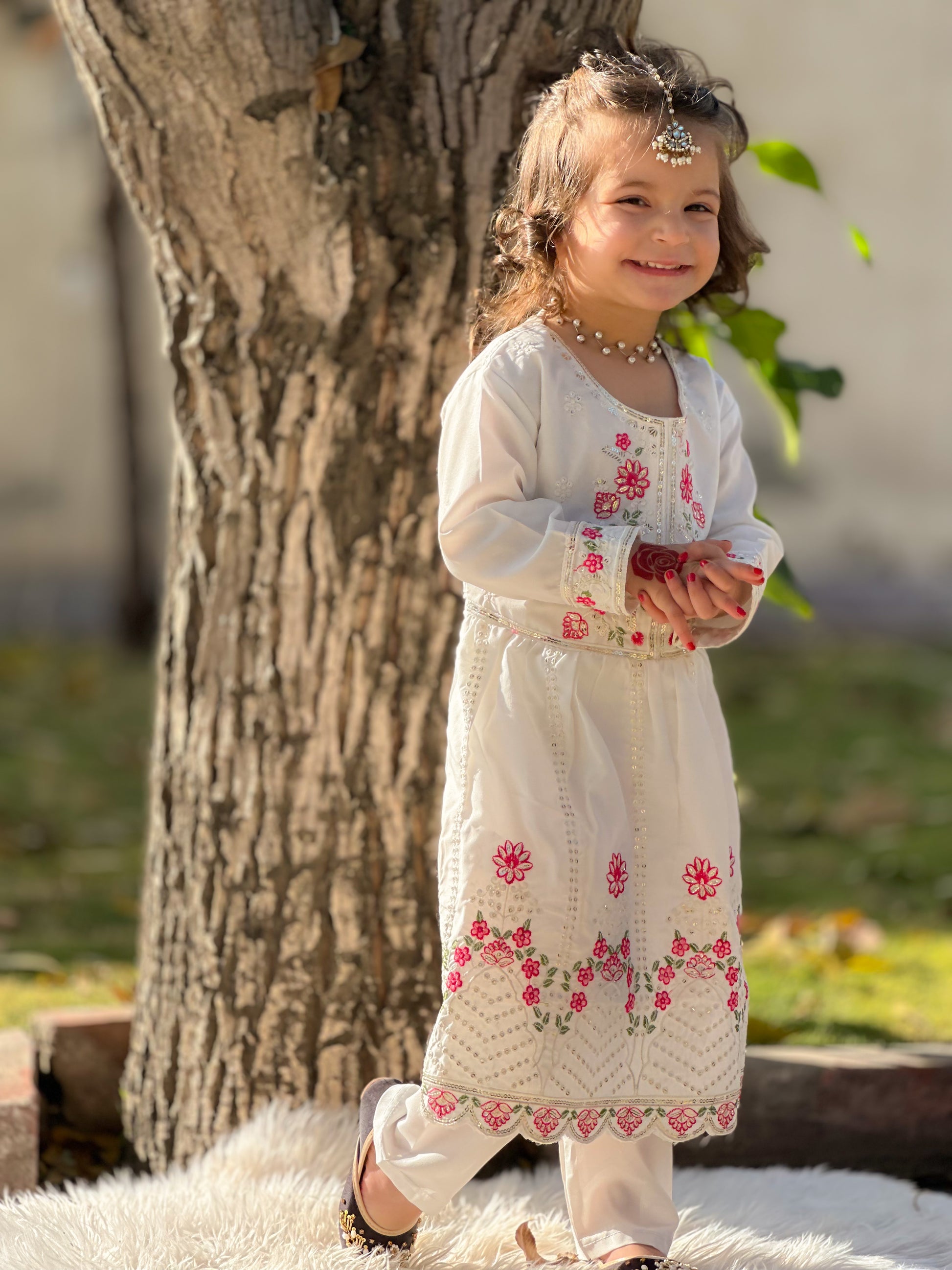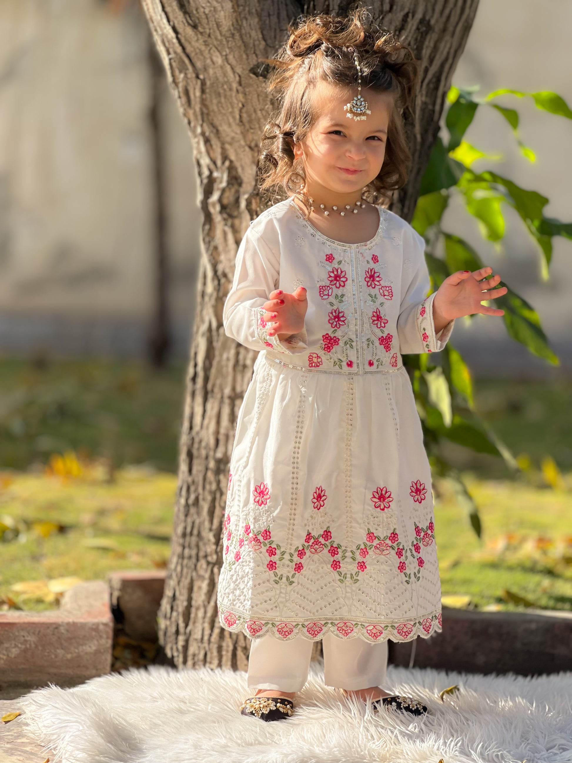 Elevate your child's fashion game with Khanak's Stitched Cotton Frock and Trouser set. Crafted specifically for kids, this sophisticated ensemble showcases high-quality cotton jacquard fabric, offering a perfect blend of style and comfort. Ideal for both casual and semi-formal events, it’s a must-have addition to their wardrobe. This product is designed for all seasons.