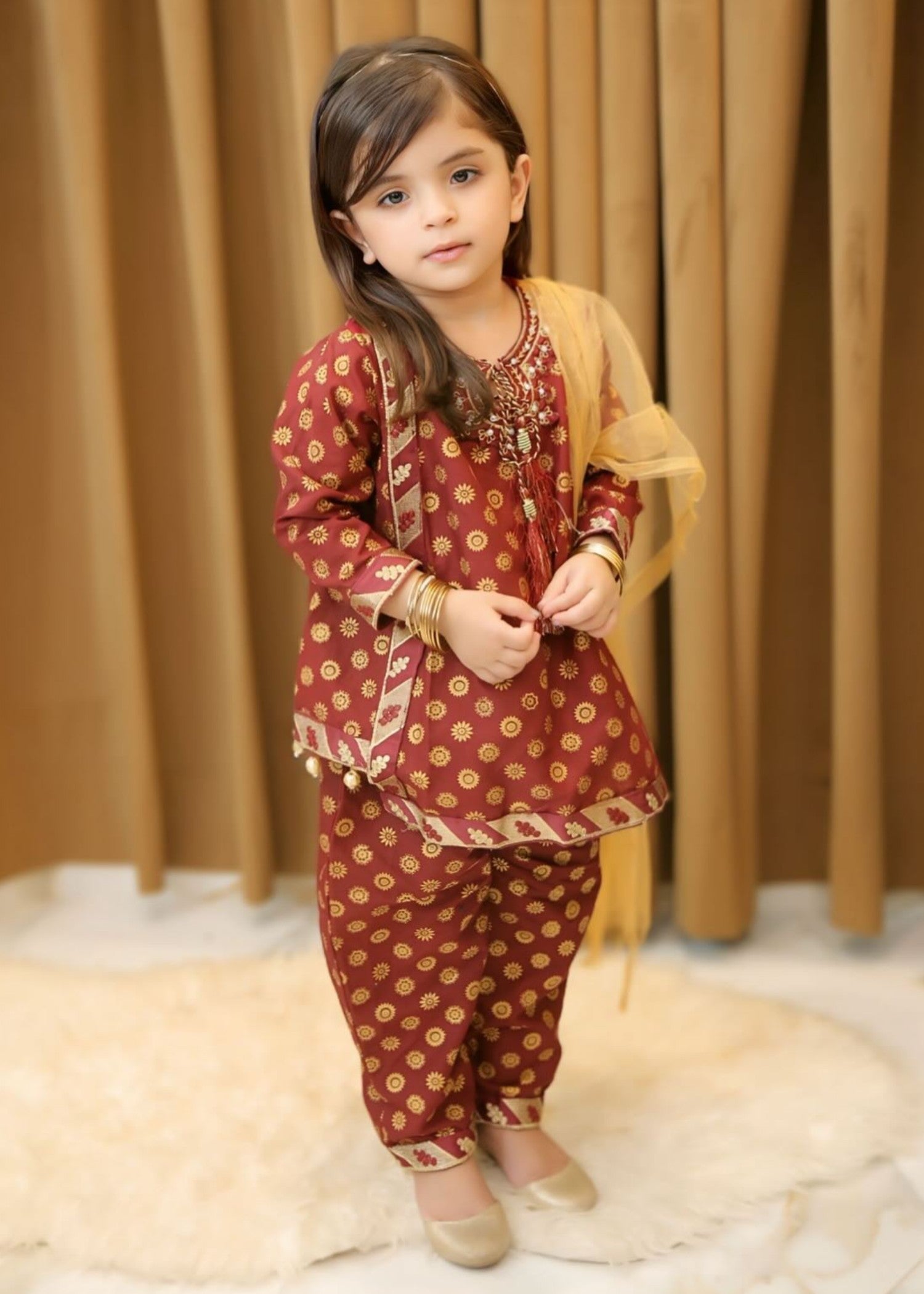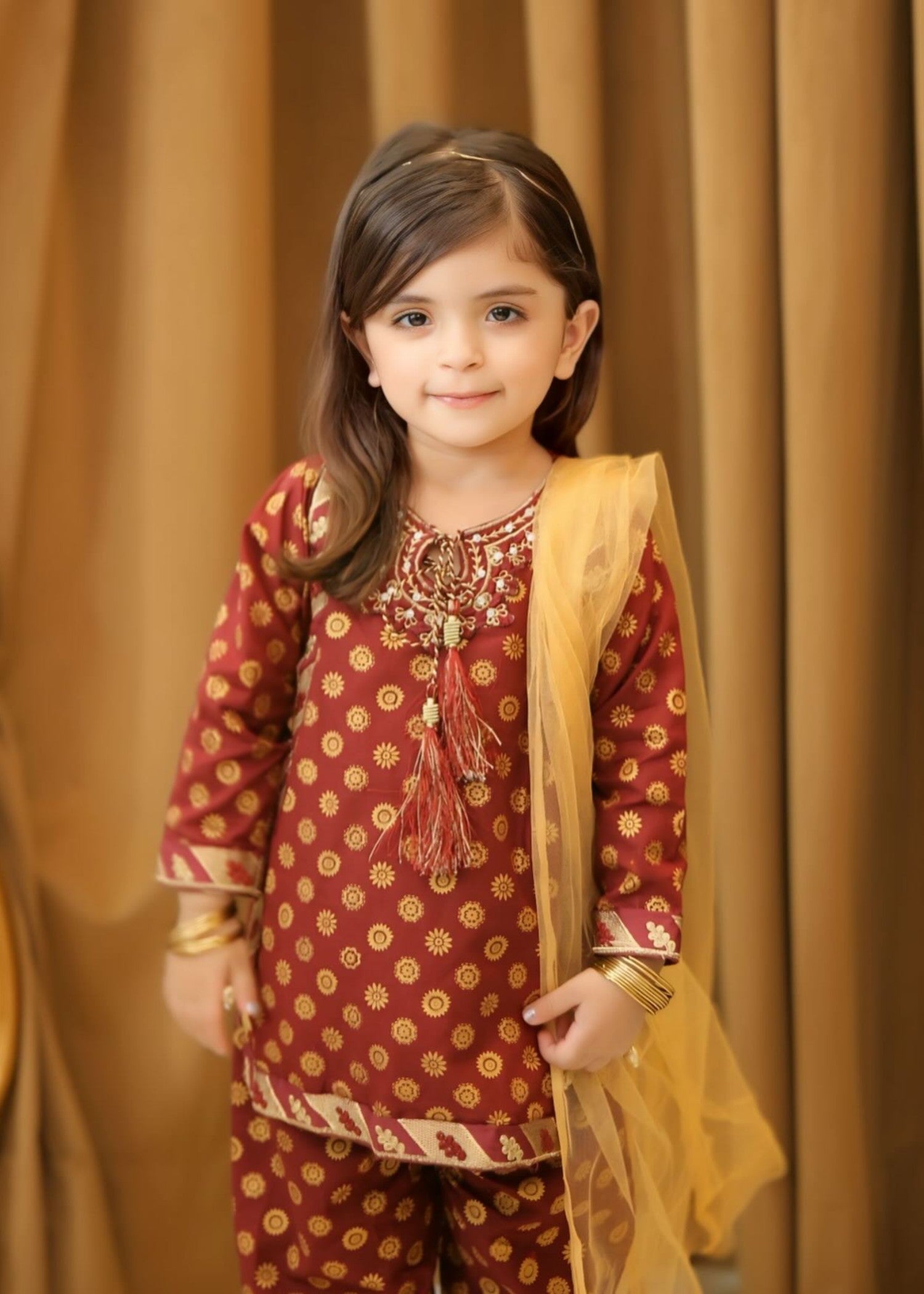 Fabric: Fine Soft Cotton Pattern: Printed and Embroided with Tassels. Color: brown Design/Cut: Shirt + Trouser + Dupatta Elevate your child's fashion game with Khanak's Embroided Stitched Cotton Shirt and Trouser set. Crafted specifically for kids, this sophisticated ensemble showcases high-quality cotton jacquard fabric, offering a perfect blend of style and comfort. Ideal for both casual and semi-formal events, it’s a must-have addition to their wardrobe.This product is designed for all seasons.
