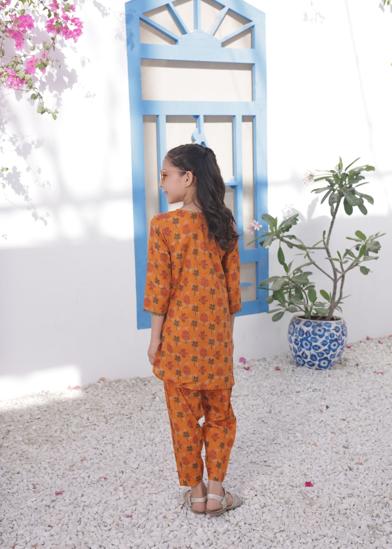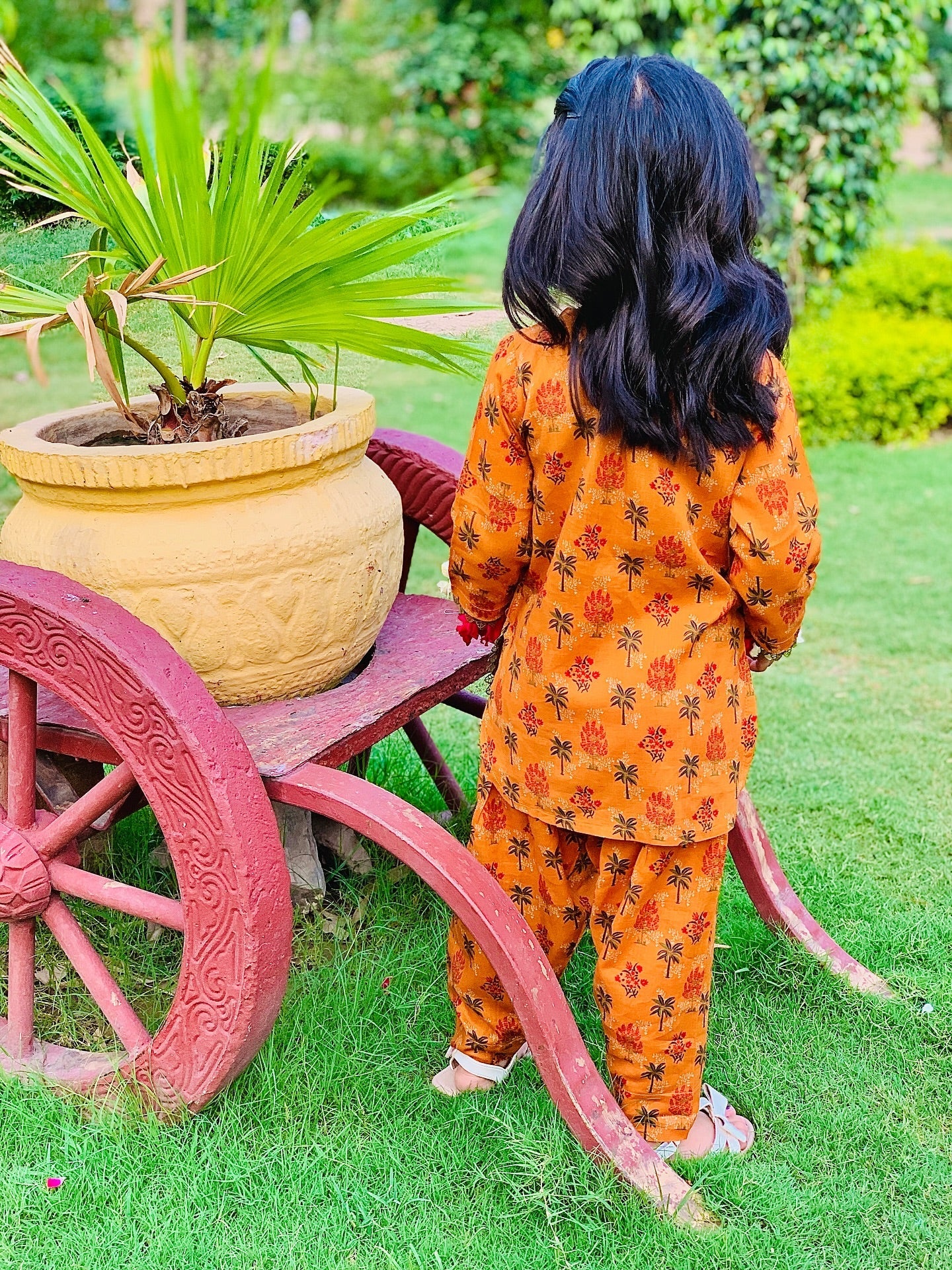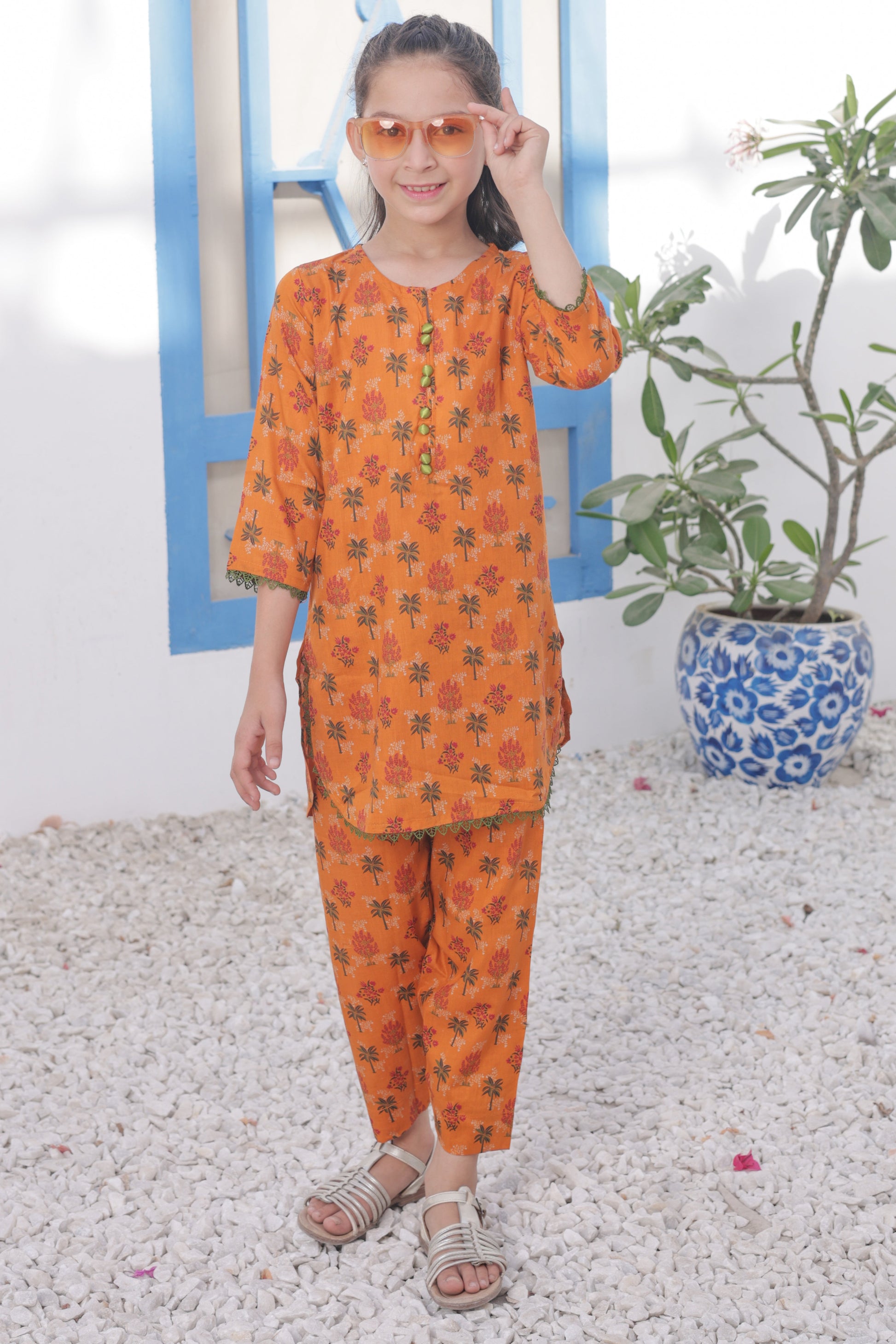 Fabric: Premium Lawn Pattern: Digital print. Color: Burnt Orange Design/Cut: Farshi Shalwar kameez. Enhance your child's wardrobe this summer with Khanak's Printed Lawn Stitched 2-Piece set wirh farshi shalwar. This stylish ensemble includes a digitally printed shirt and cozy trousers, making it the ideal choice for casual outings or fun-filled adventures.