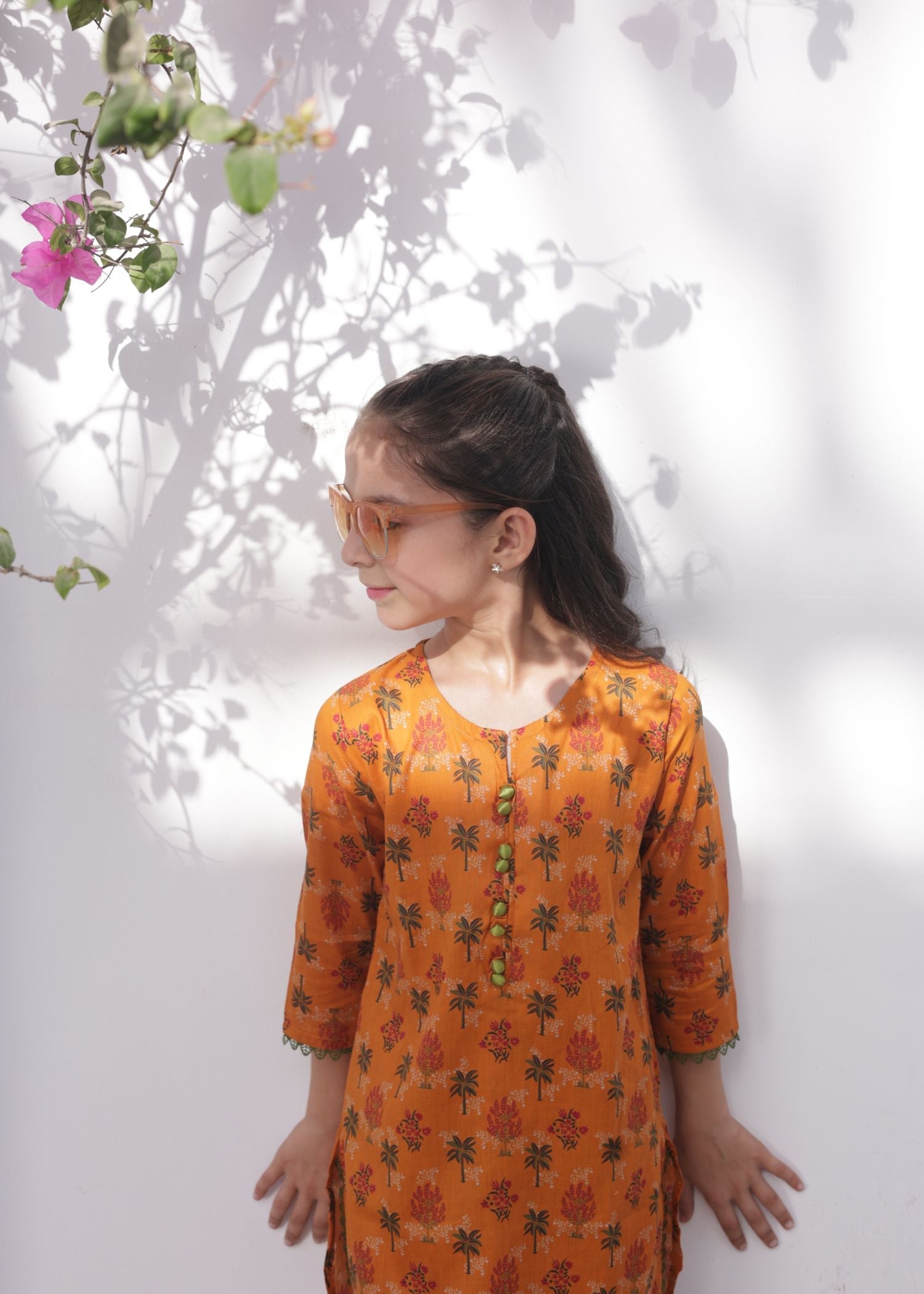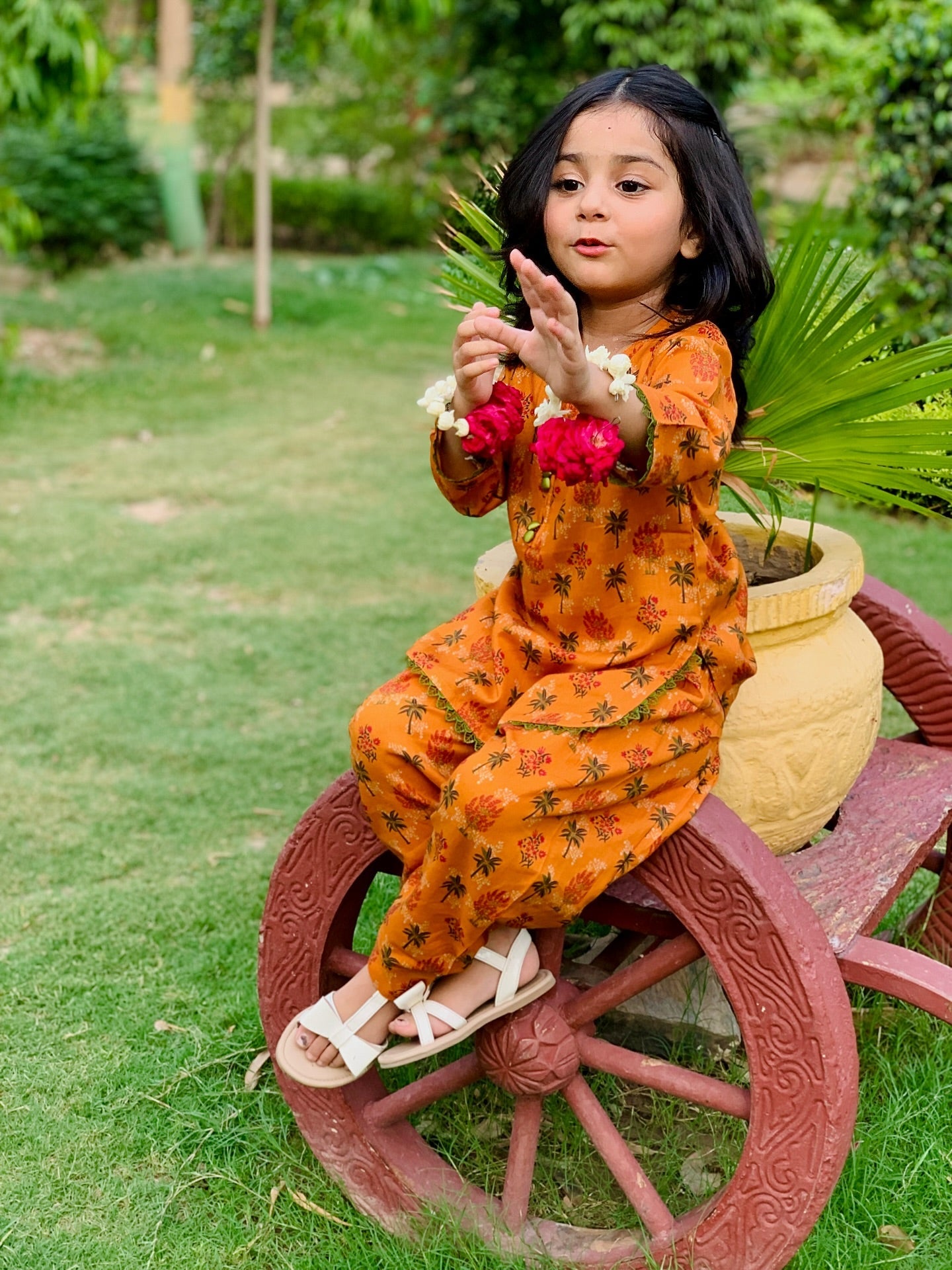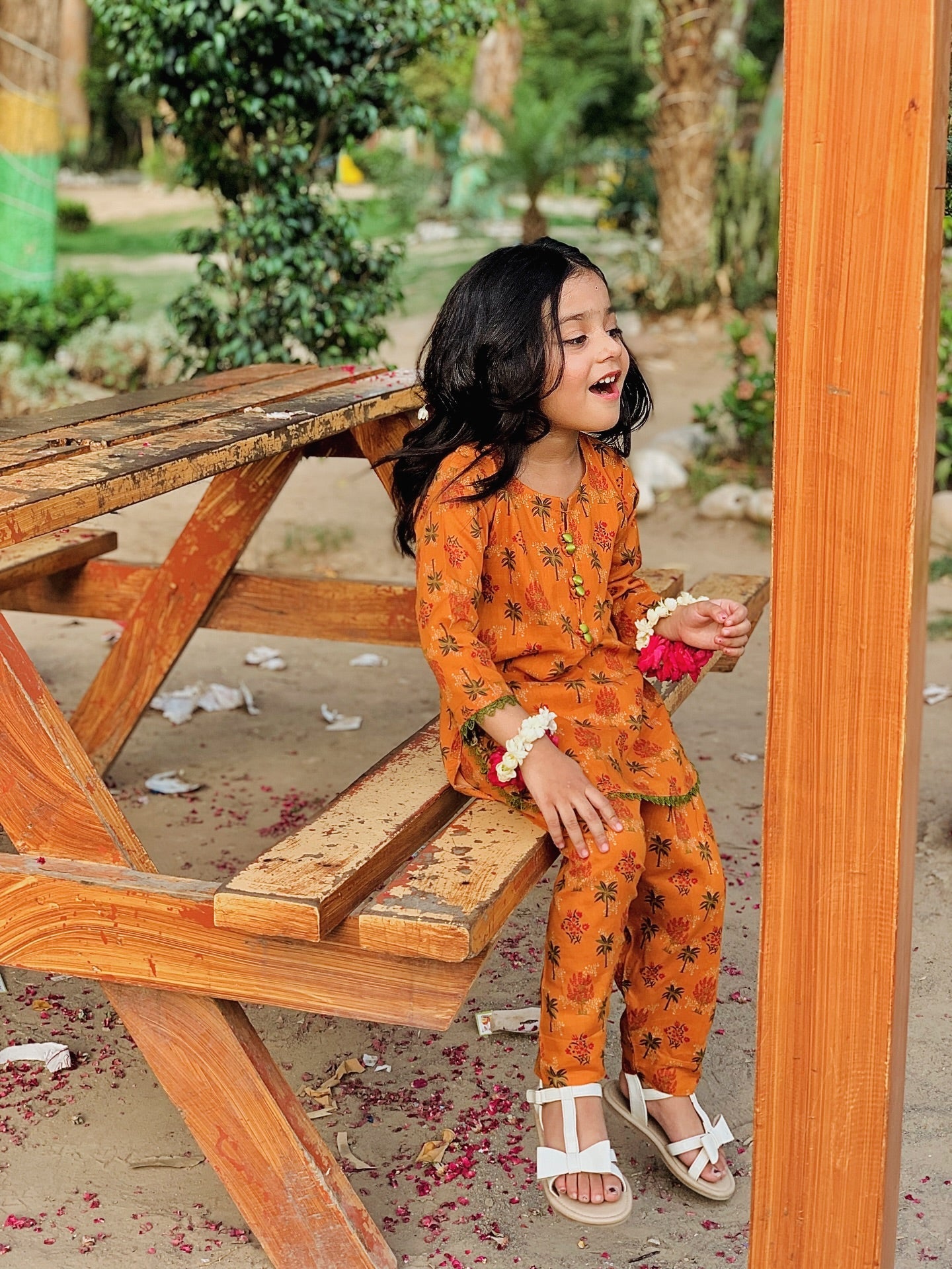 Fabric: Premium Lawn Pattern: Digital print. Color: Burnt Orange Design/Cut: Farshi Shalwar kameez. Enhance your child's wardrobe this summer with Khanak's Printed Lawn Stitched 2-Piece set wirh farshi shalwar. This stylish ensemble includes a digitally printed shirt and cozy trousers, making it the ideal choice for casual outings or fun-filled adventures.