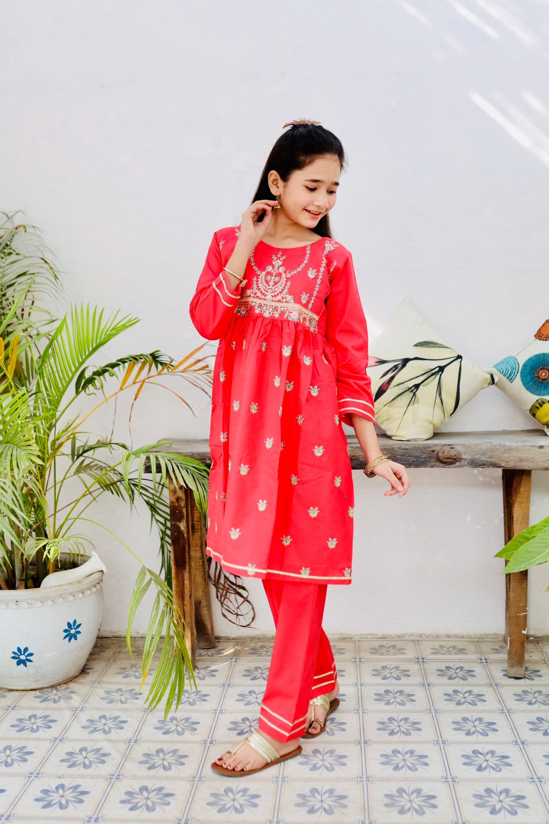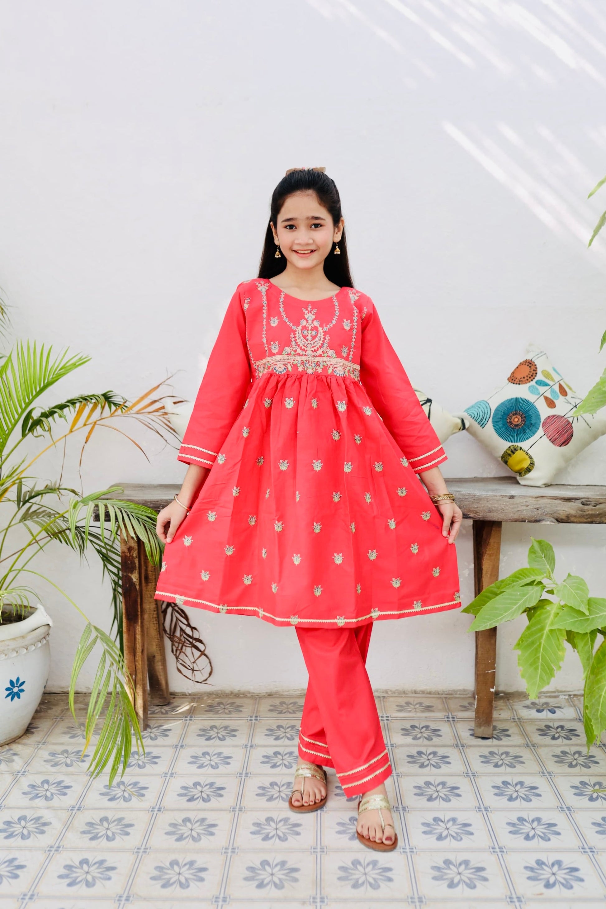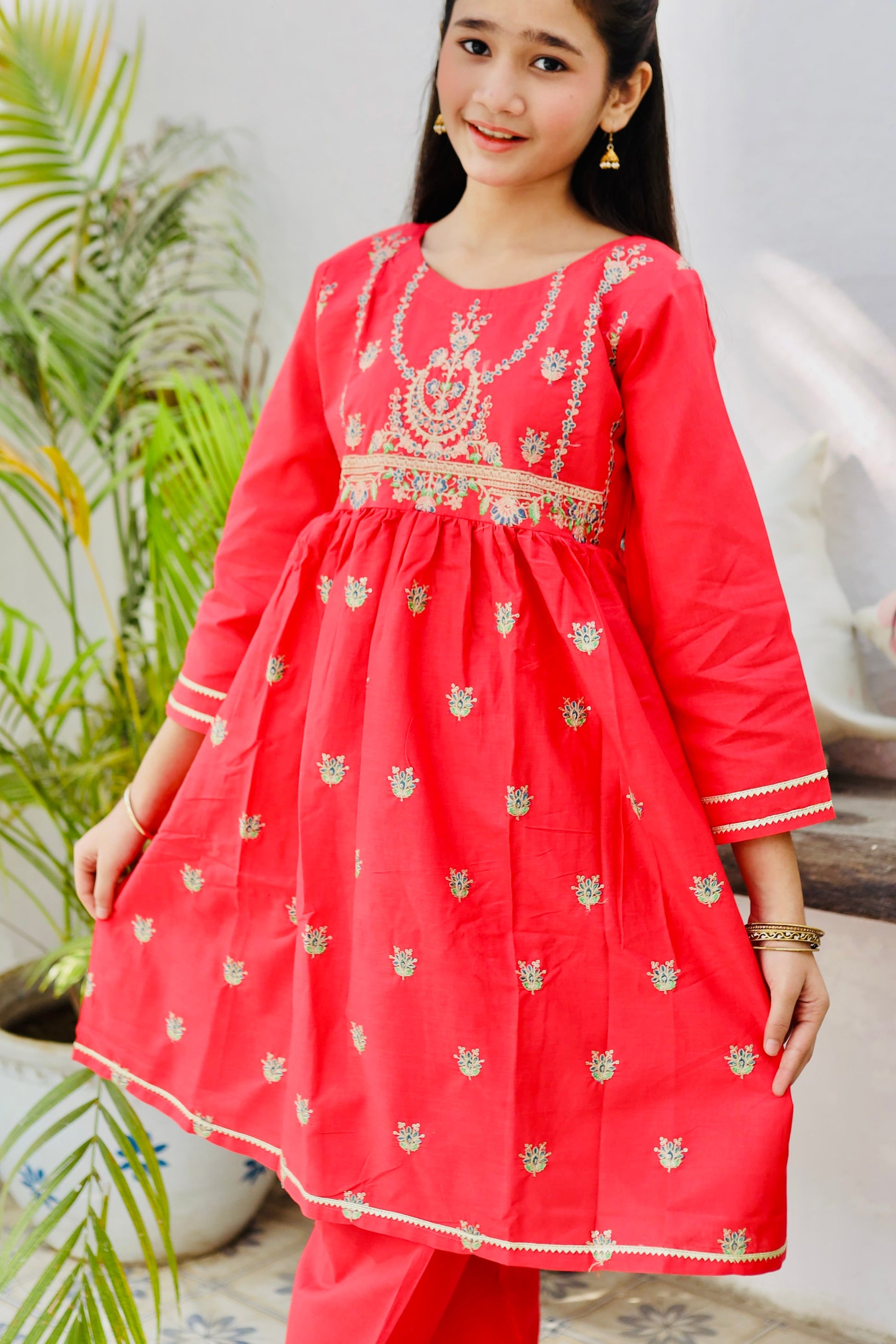 Fabric: Cotton Pattern:embroidered Color: Poppy Red Design/Cut: Short Frock and Trouser This product is designed for all seasons.