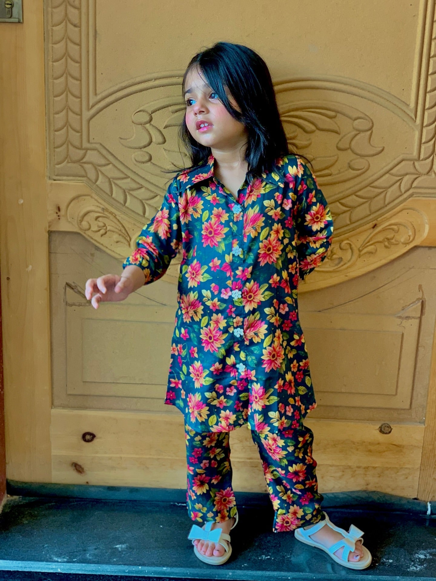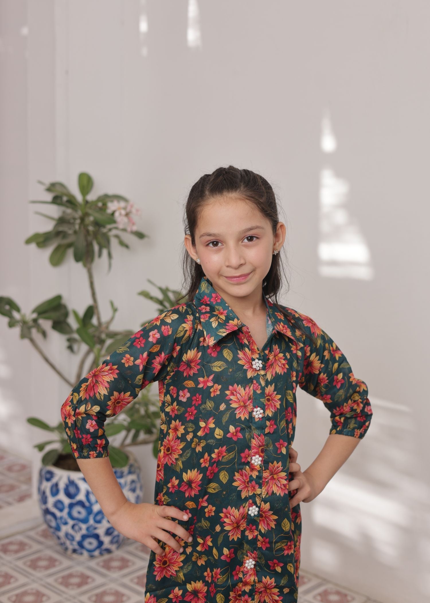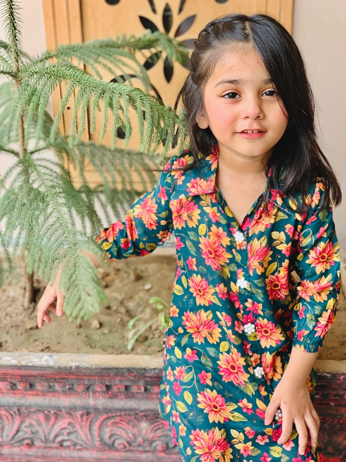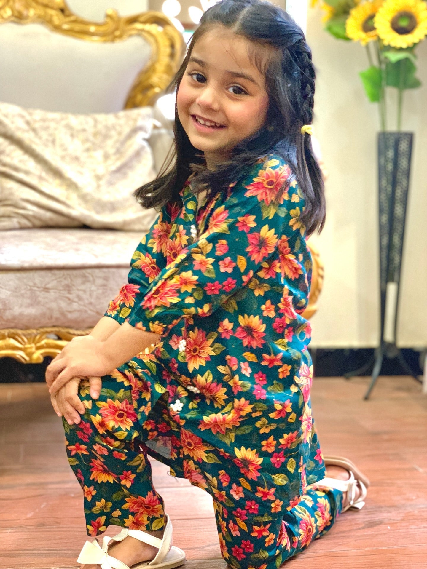 Fabric: Premium Lawn Pattern: Floral Digital Print Color: Shamrock Green Design/Cut: Co-Ord Sets Enhance your child's wardrobe this summers with Khanak's Printed Lawn Stitched 2-Piece Co-ord set. This stylish ensemble includes a digitally printed shirt and cozy trousers, making it the ideal choice for casual outings or fun-filled adventures