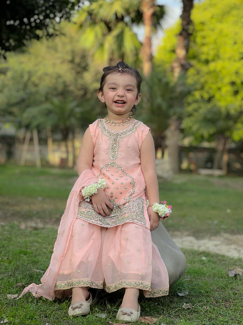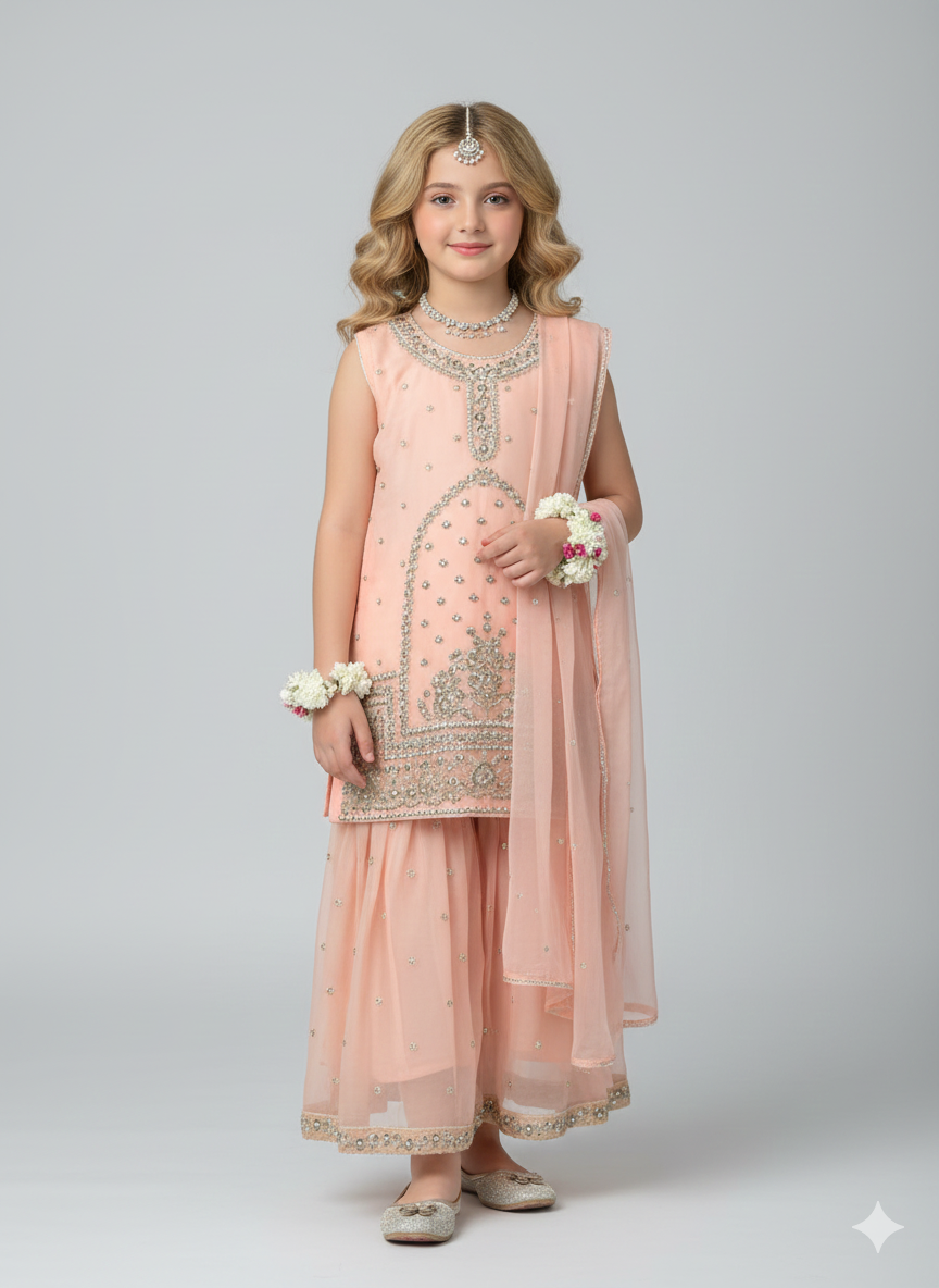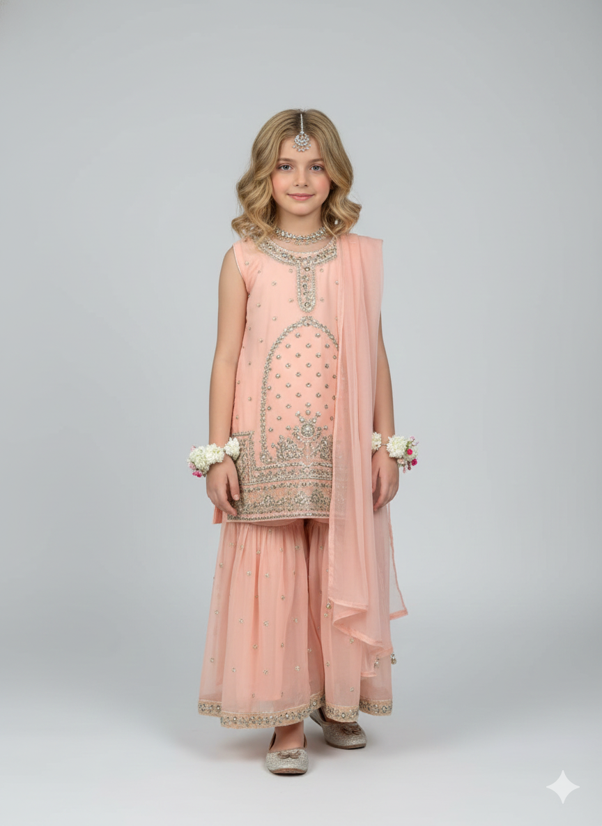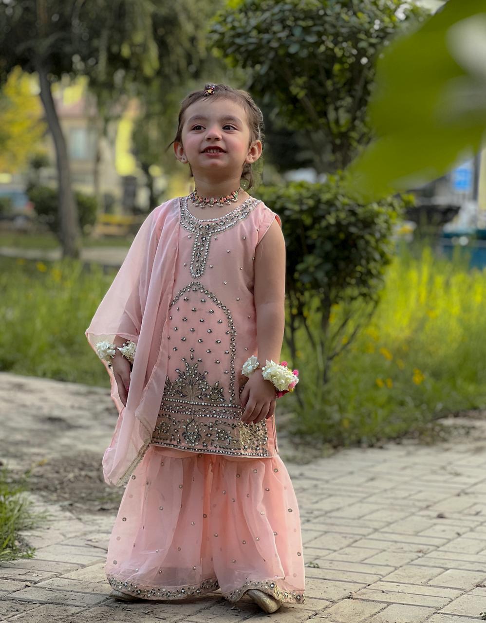 Design Cut: Shirt + Gharara + Dupatta (Dupatta Included) Chiffon Embroided Shirt crafted specially for kids is adorned with exquisite sequence embroided Gharara is a testament to craftsmanship.