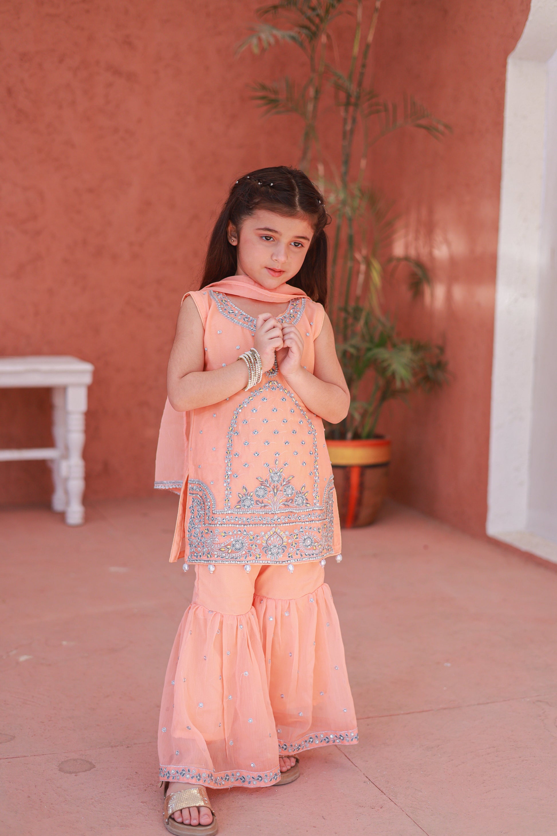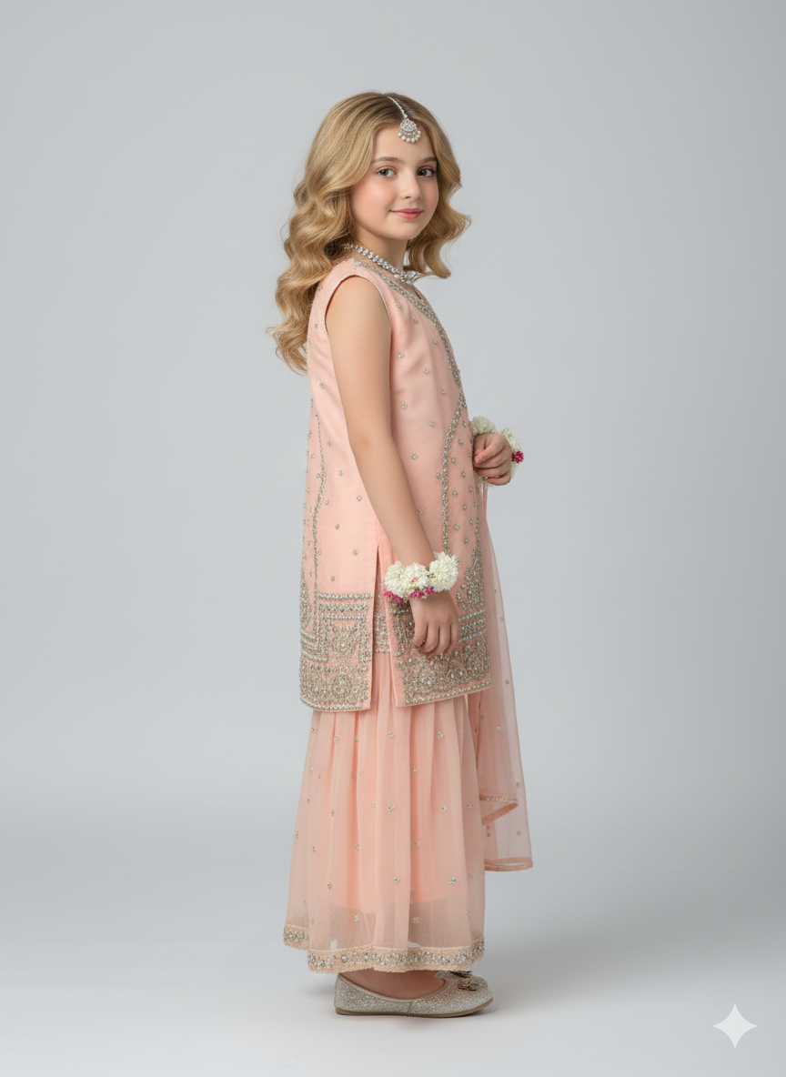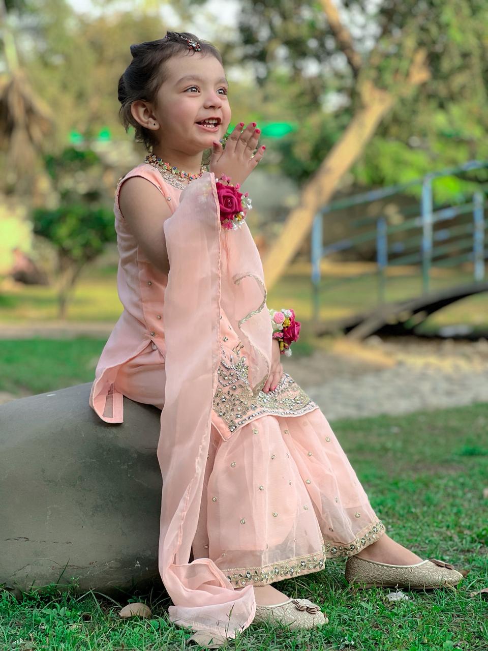 Design Cut: Shirt + Gharara + Dupatta (Dupatta Included) Chiffon Embroided Shirt crafted specially for kids is adorned with exquisite sequence embroided Gharara is a testament to craftsmanship.
