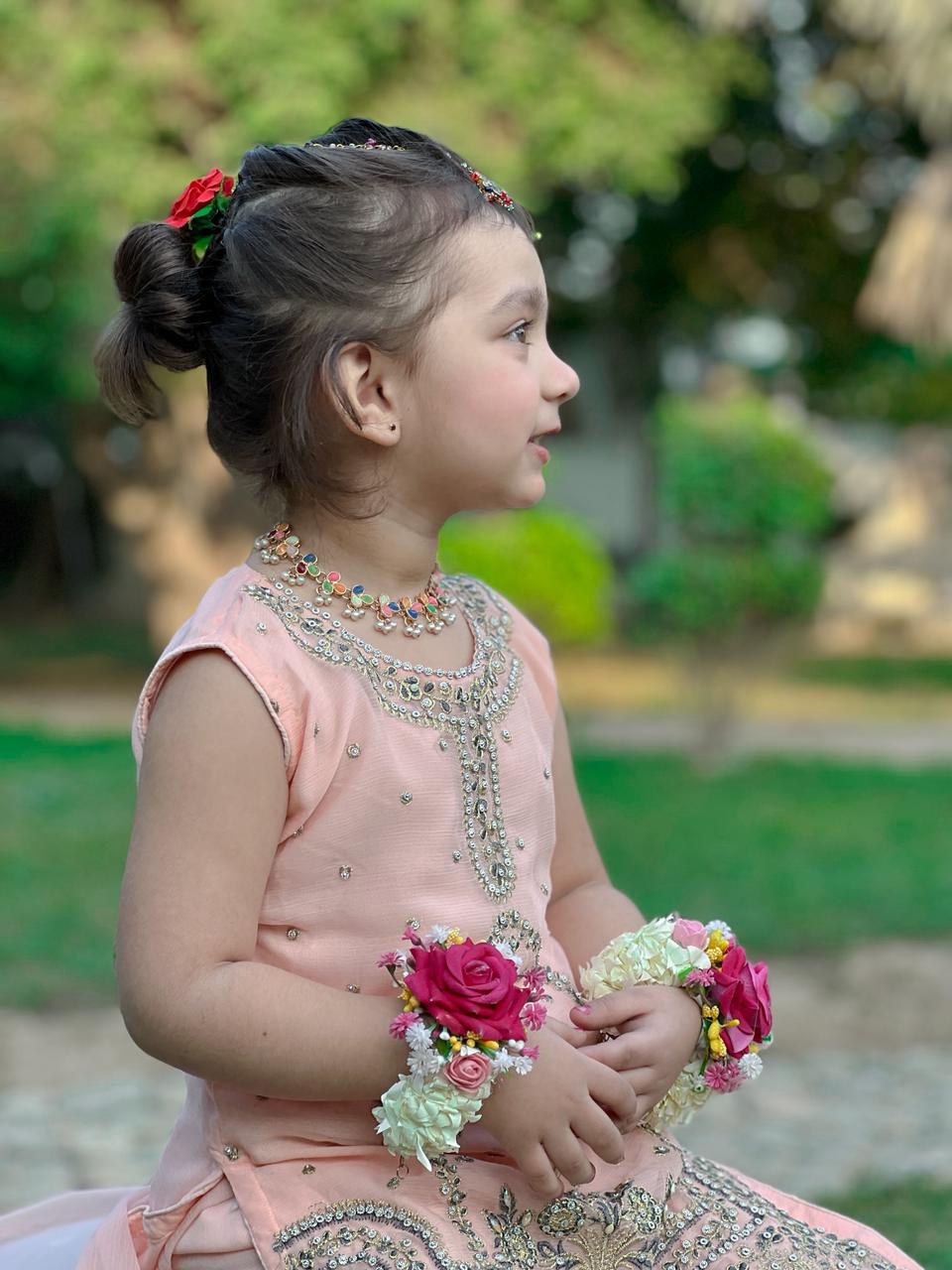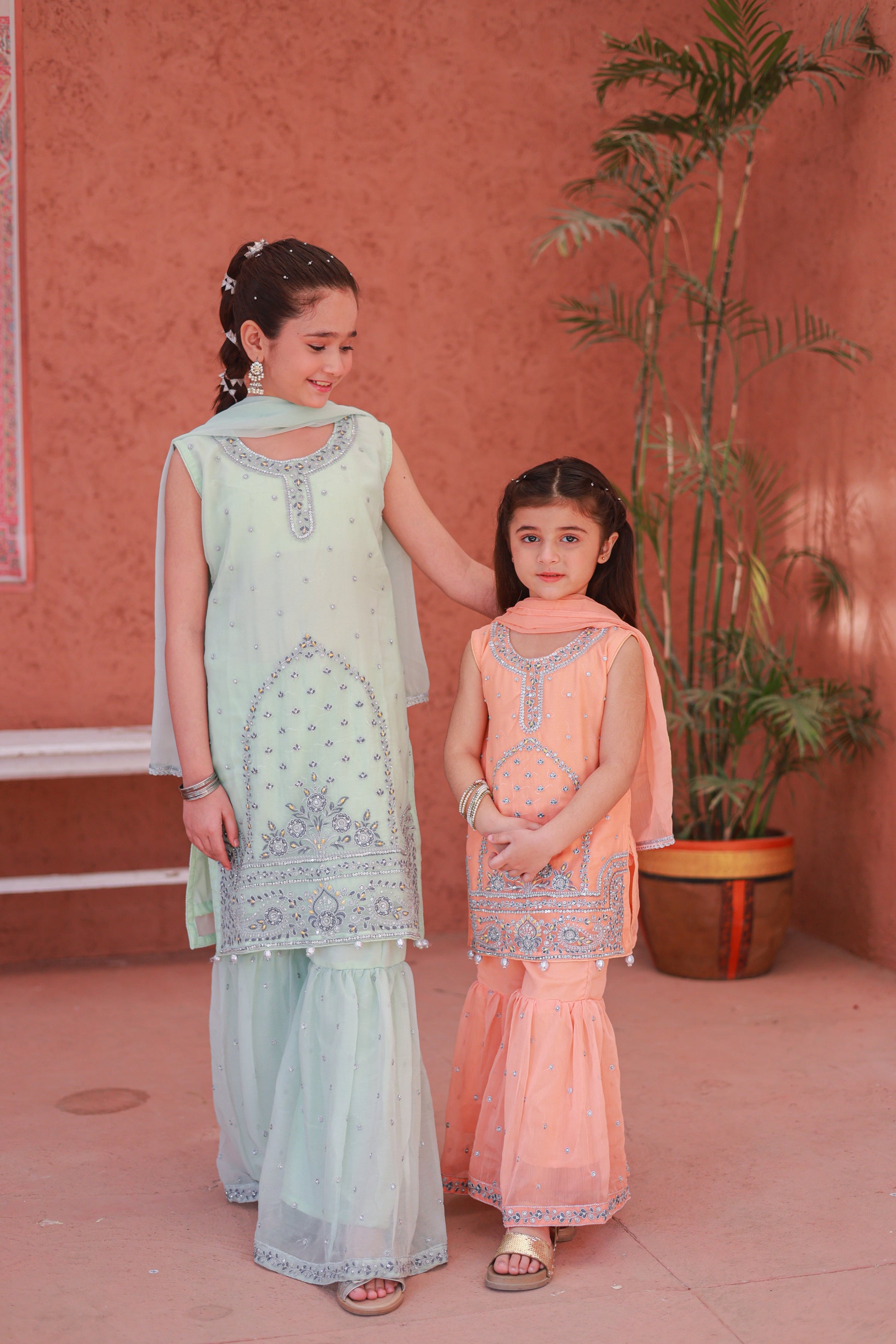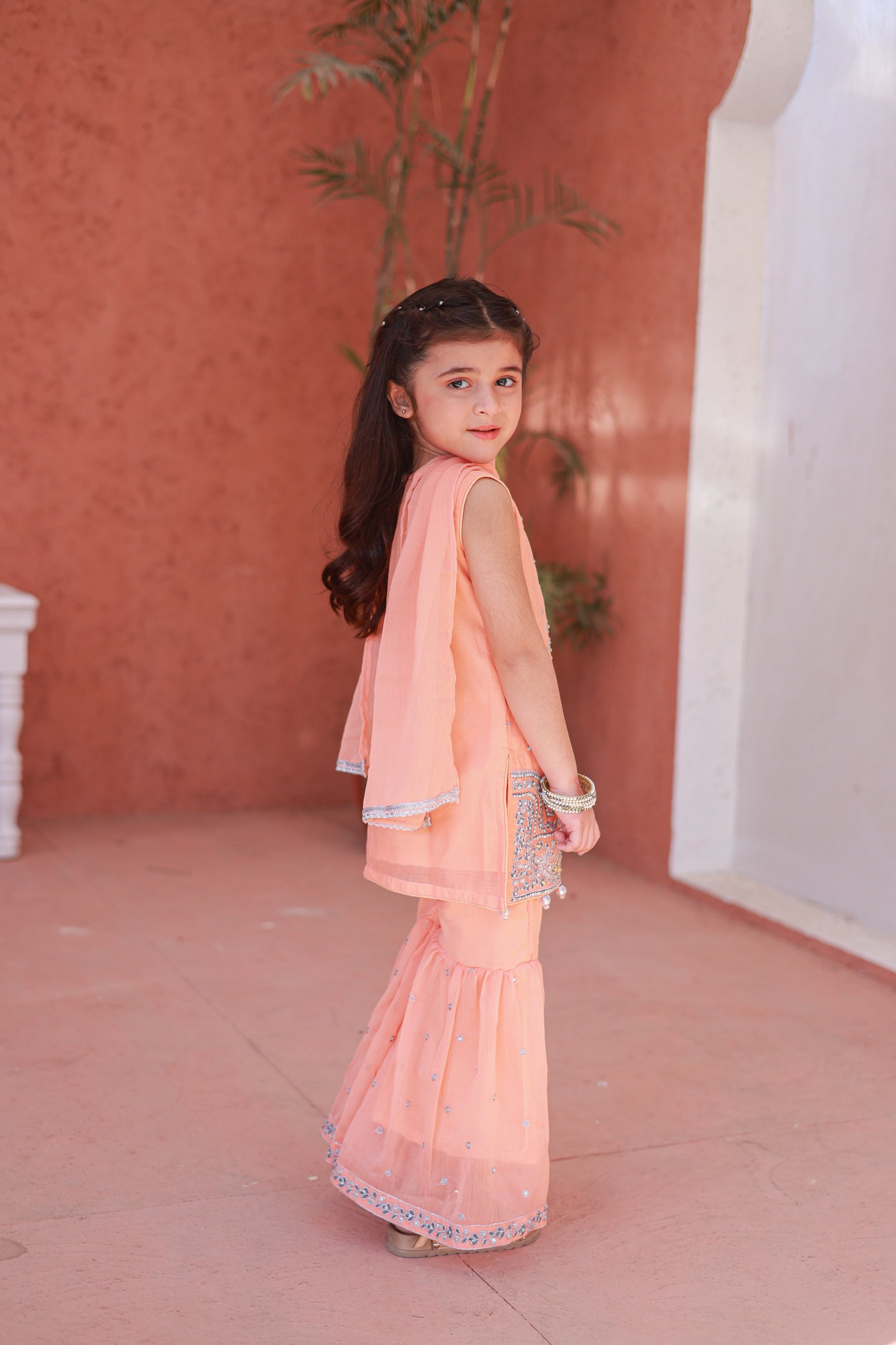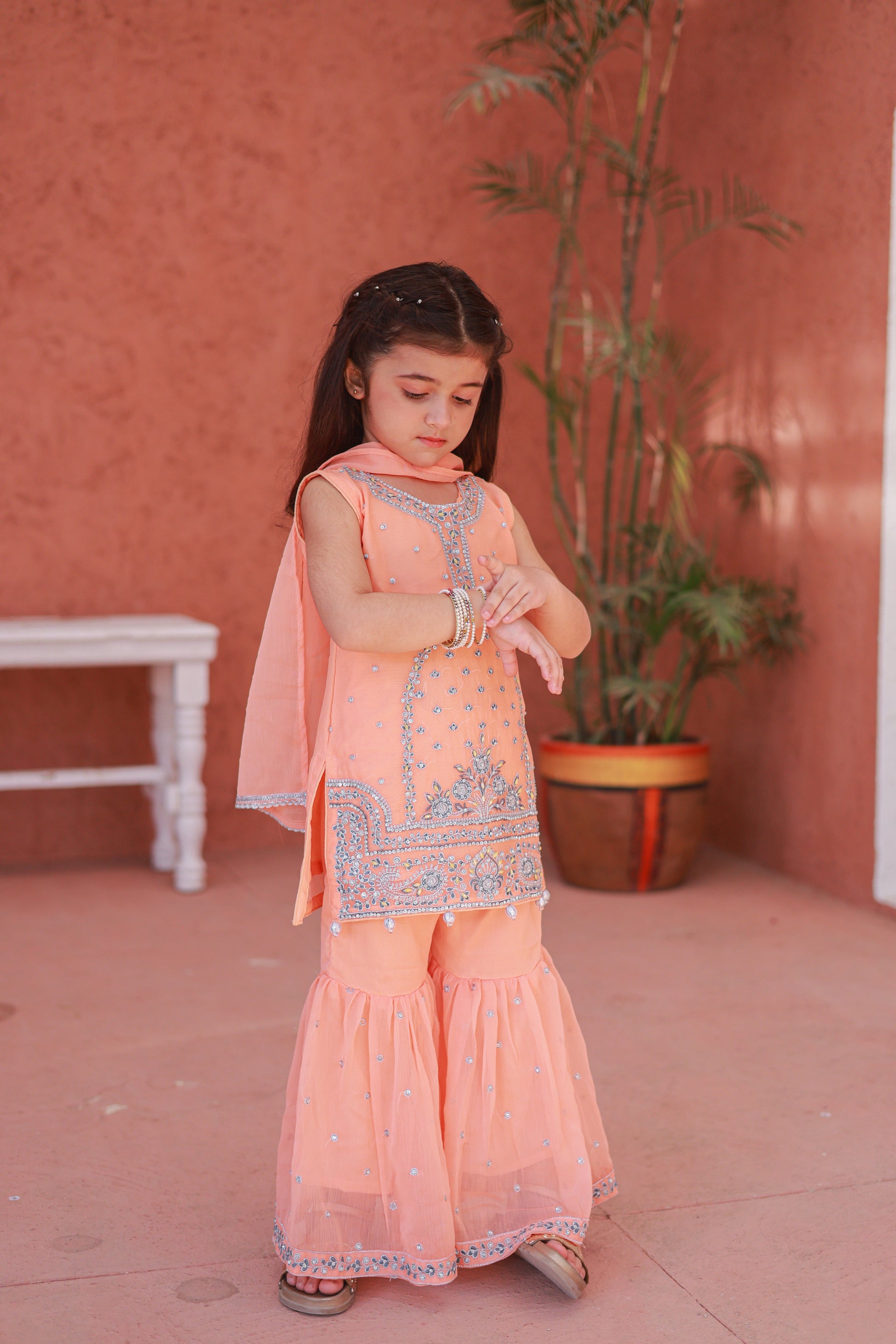 Design Cut: Shirt + Gharara + Dupatta (Dupatta Included) Chiffon Embroided Shirt crafted specially for kids is adorned with exquisite sequence embroided Gharara is a testament to craftsmanship.