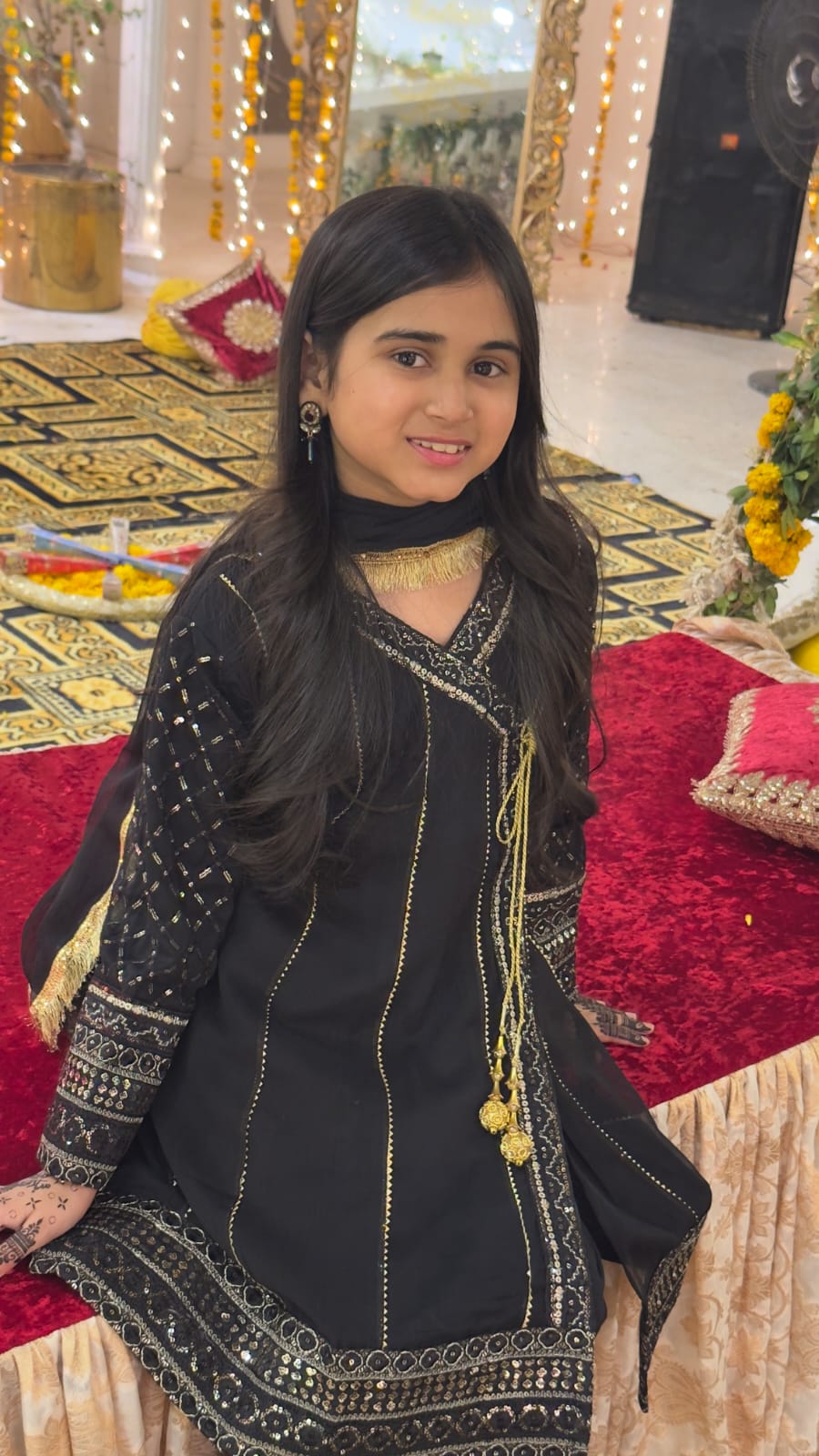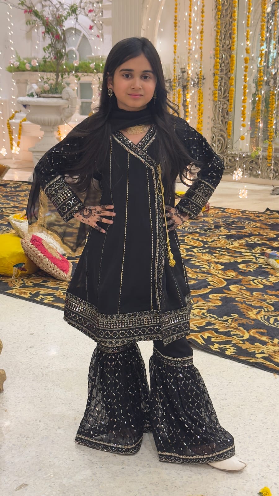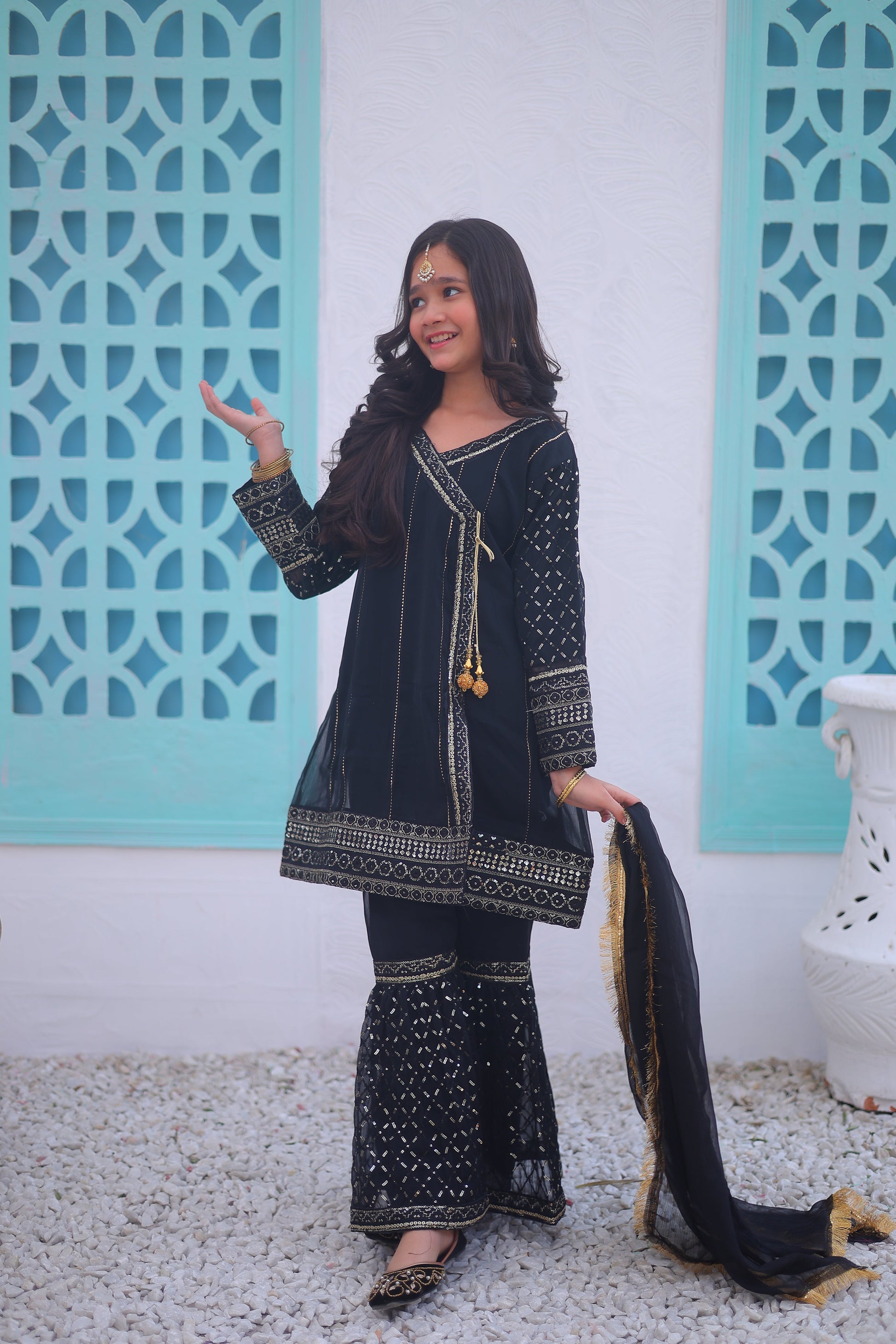 Fabric: Chiffon Pattern: Fancy Sequence Embroidery Color: Black Design Cut: Angrakha and Gharara. (Dupatta Included) Chiffon Angrakha Style Shirt is adorned with exquisite sequence embroided Gharara is a testament to craftsmanship.