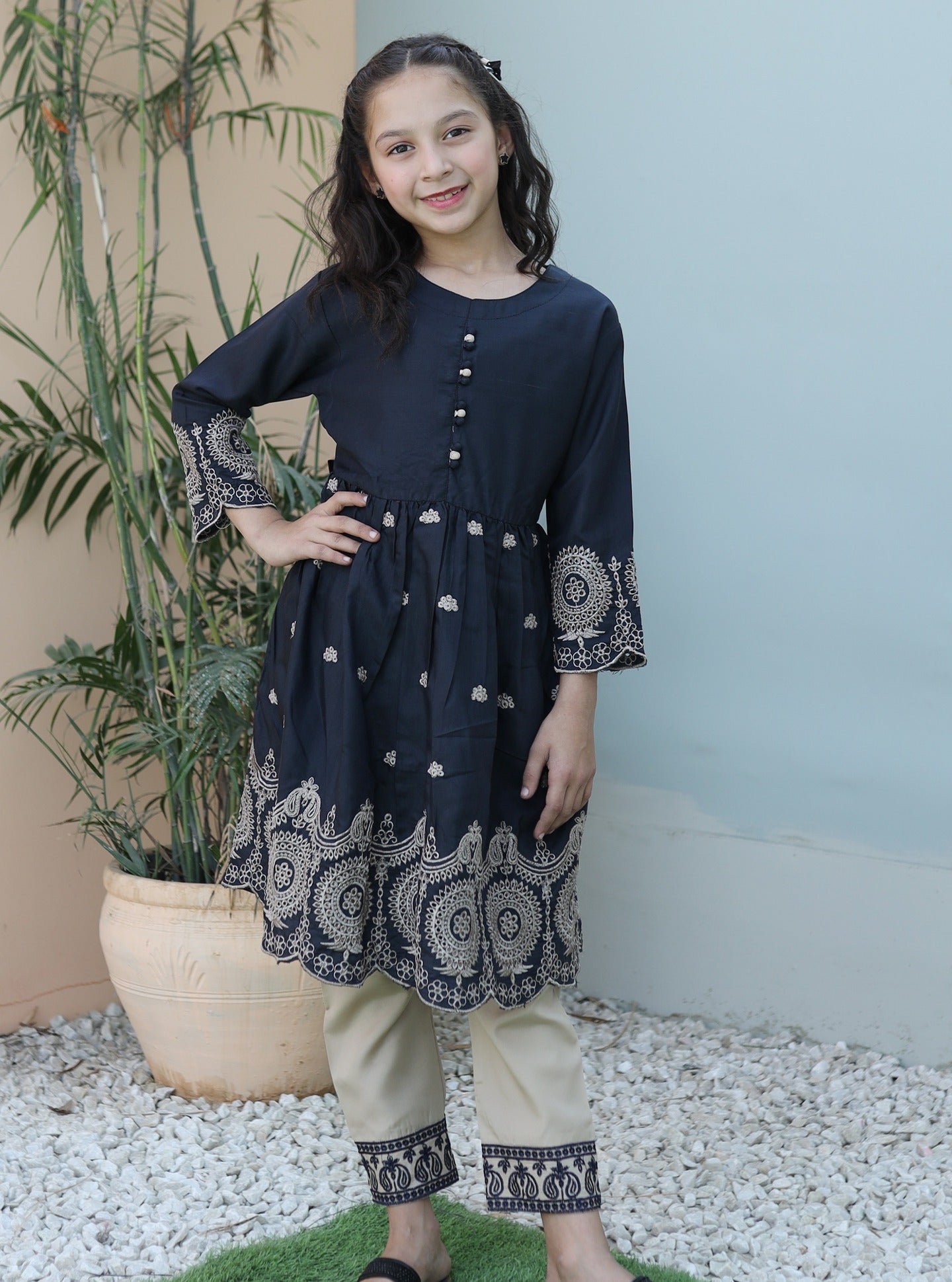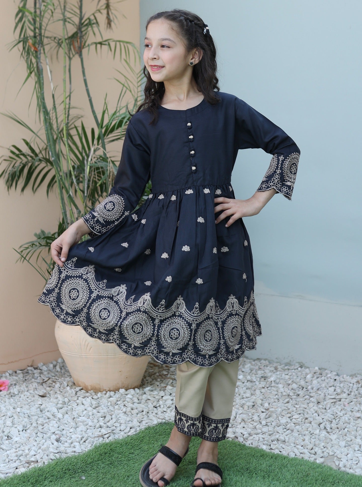Design/Cut: Frock + Trouser Elevate your child's fashion game with Khanak's Stitched Cotton Frock and Trouser set. Crafted specifically for kids, this sophisticated ensemble showcases high-quality cotton jacquard fabric, offering a perfect blend of style and comfort. Ideal for both casual and semi-formal events, it’s a must-have addition to their wardrobe. This product is designed for all seasons.