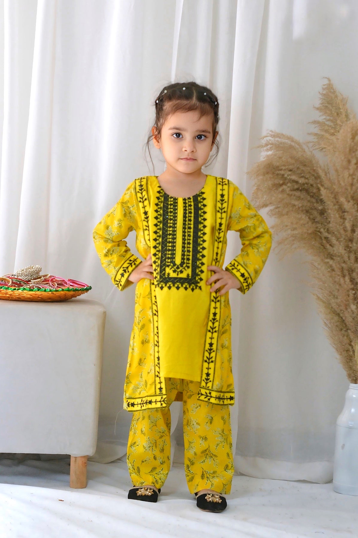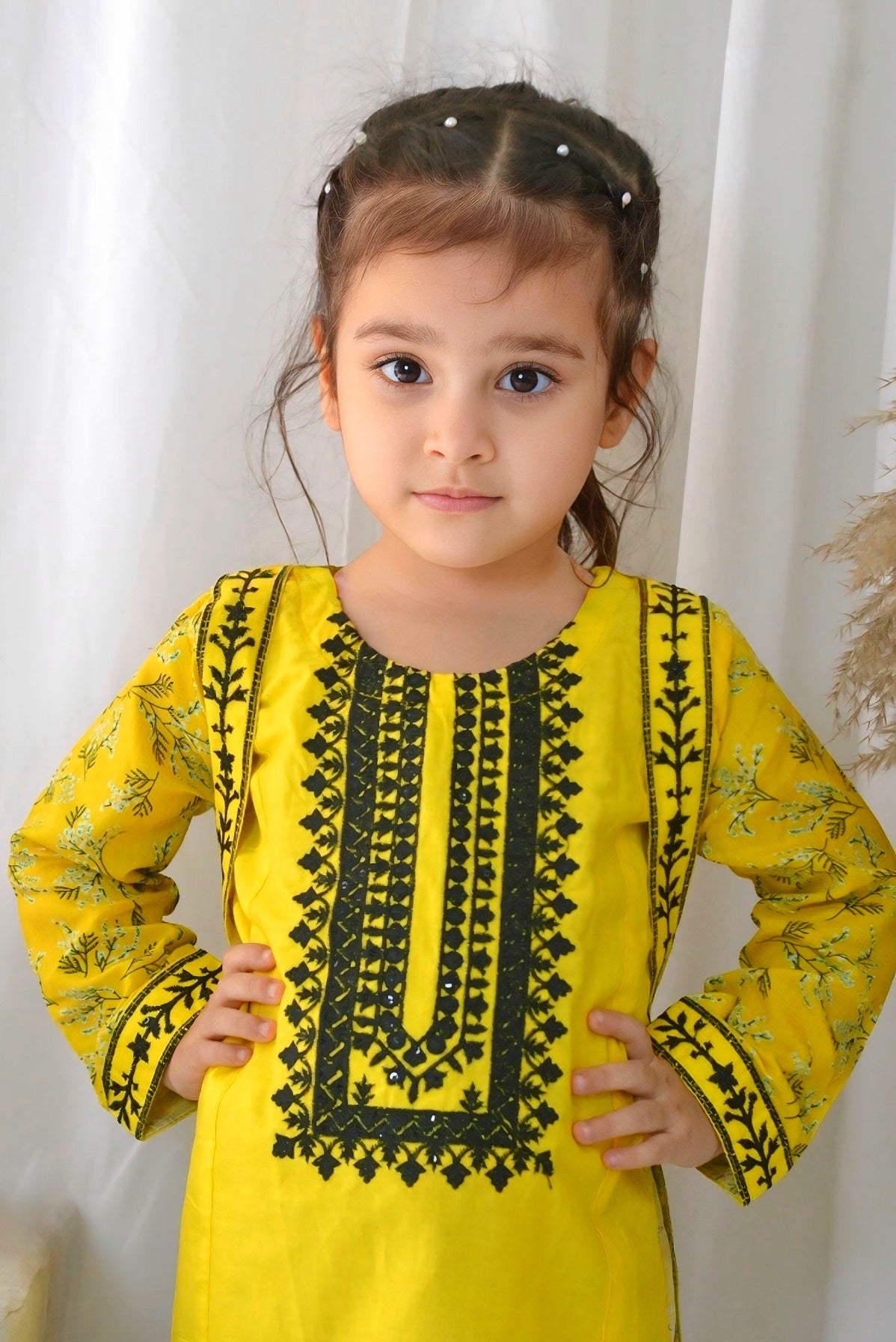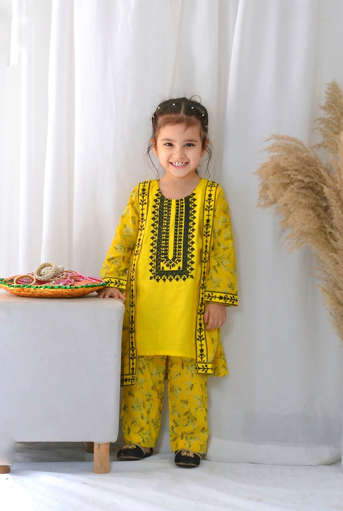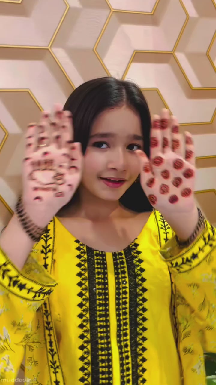 Fabric: Premium Lawn Pattern: Embroided and Digital printed. Color: Classic Yellow Design/Cut: Coat Style Enhance your child's wardrobe this summer with Khanak's Printed Lawn Stitched 2-Piece set with Coat Style.This stylish ensemble includes a digitally printed shirt and cozy trousers, making it the ideal choice for casual outings or fun-filled adventures. this fabric is designed for all seasons Coat Style Embroided