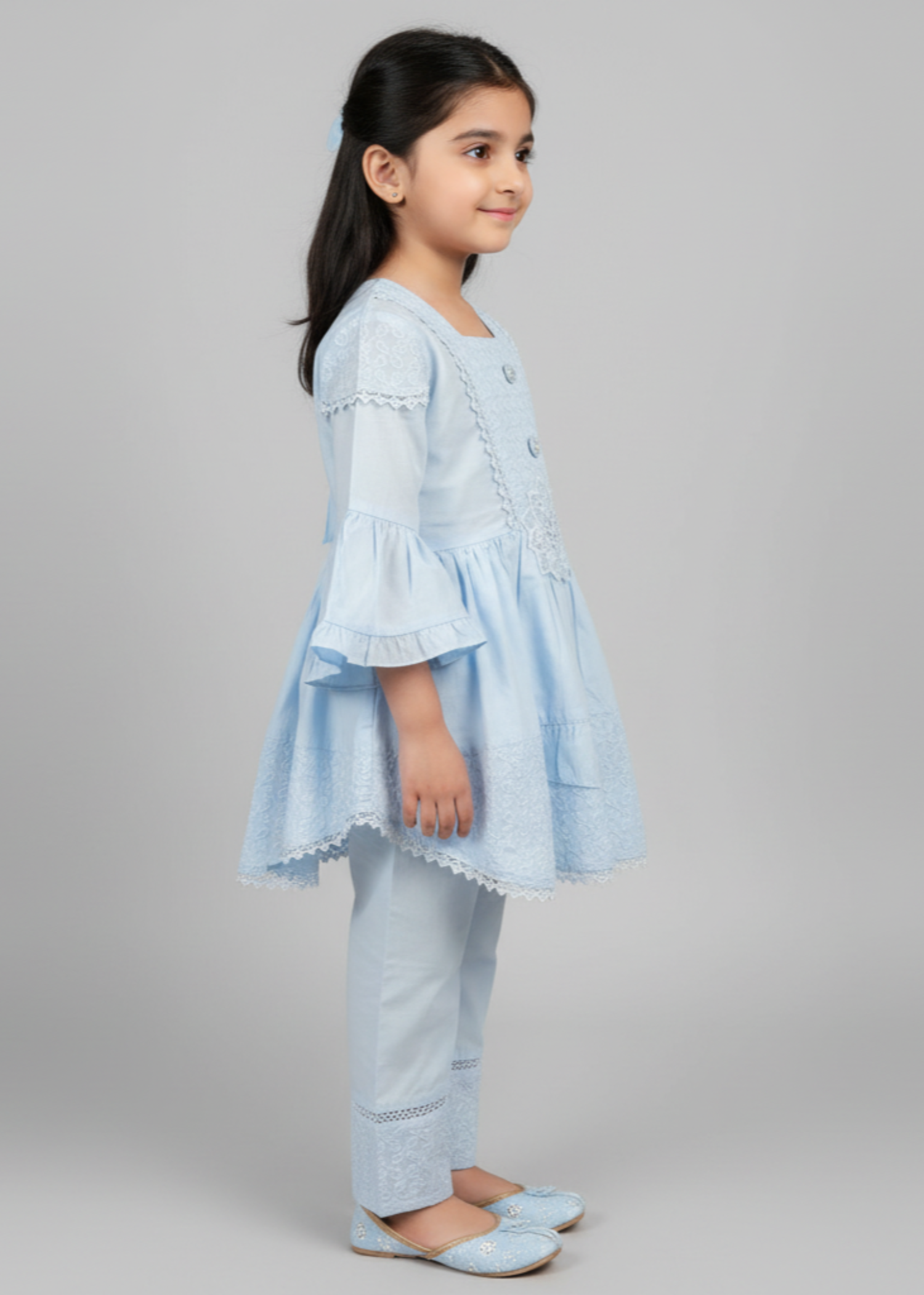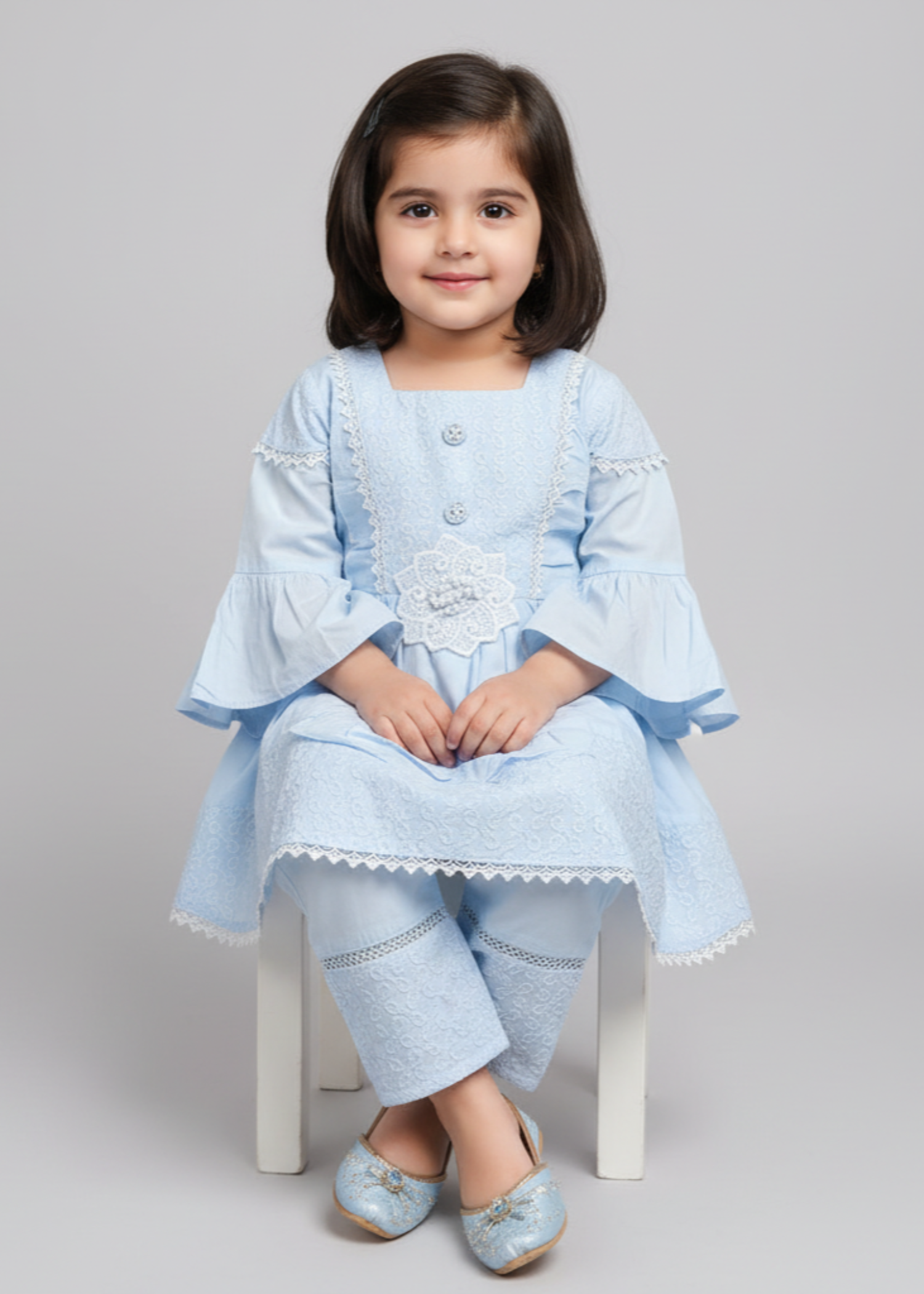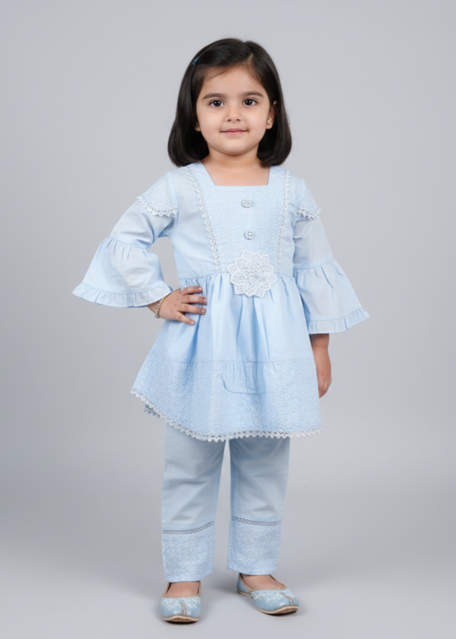Fabric: Fine Cotton Pattern: Hand Embroided Color: ice blue Design/Cut: Frock + Trouser