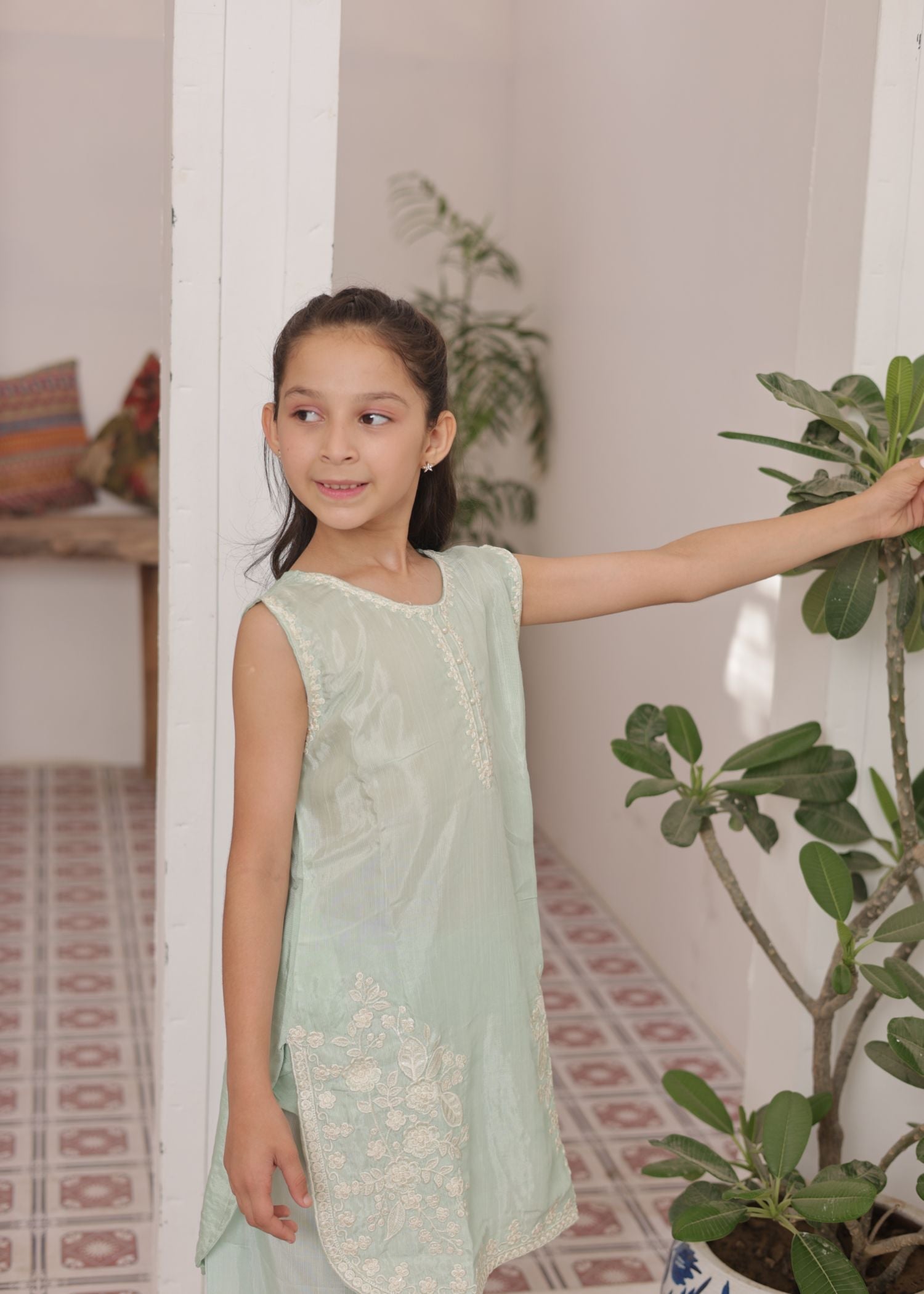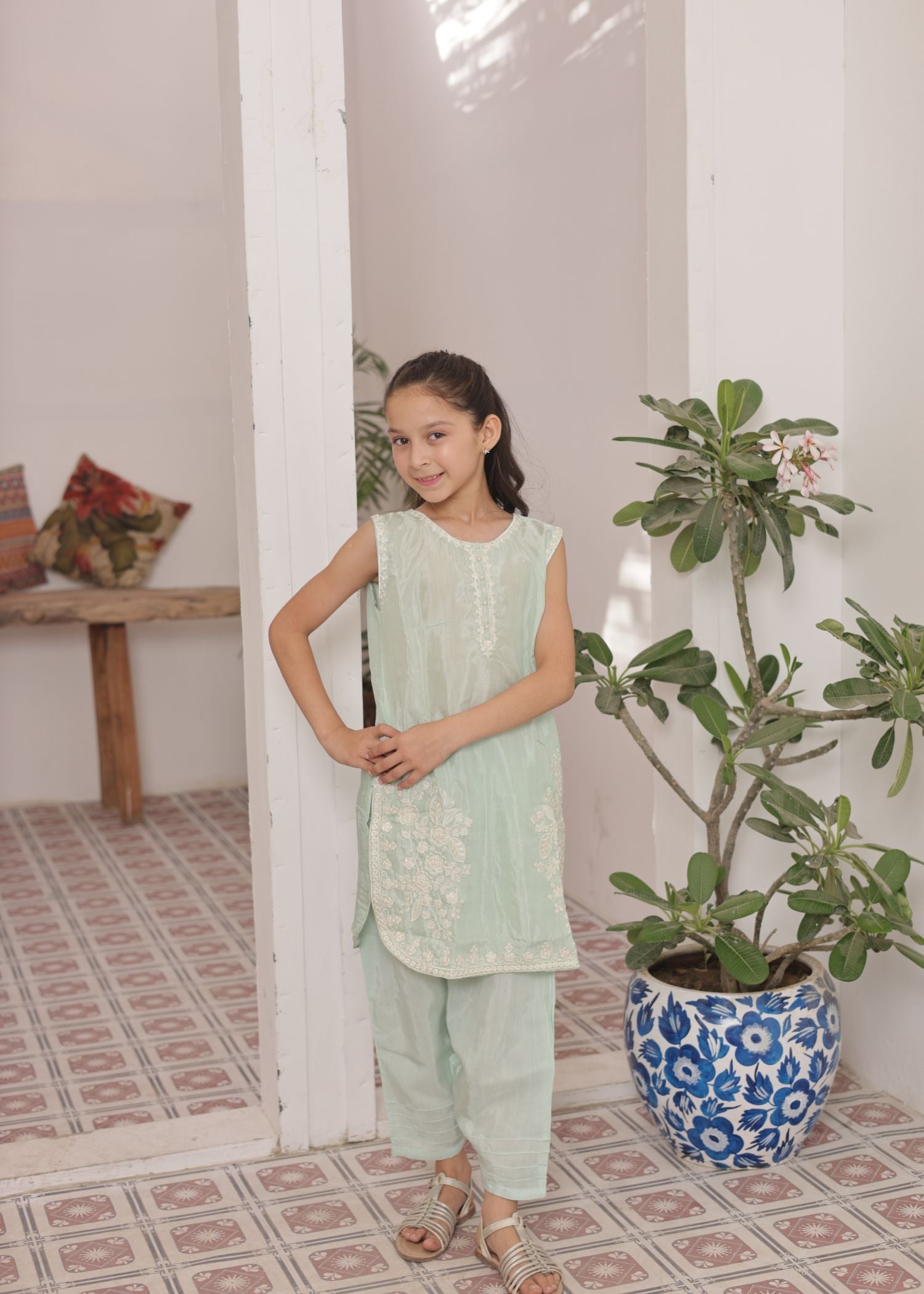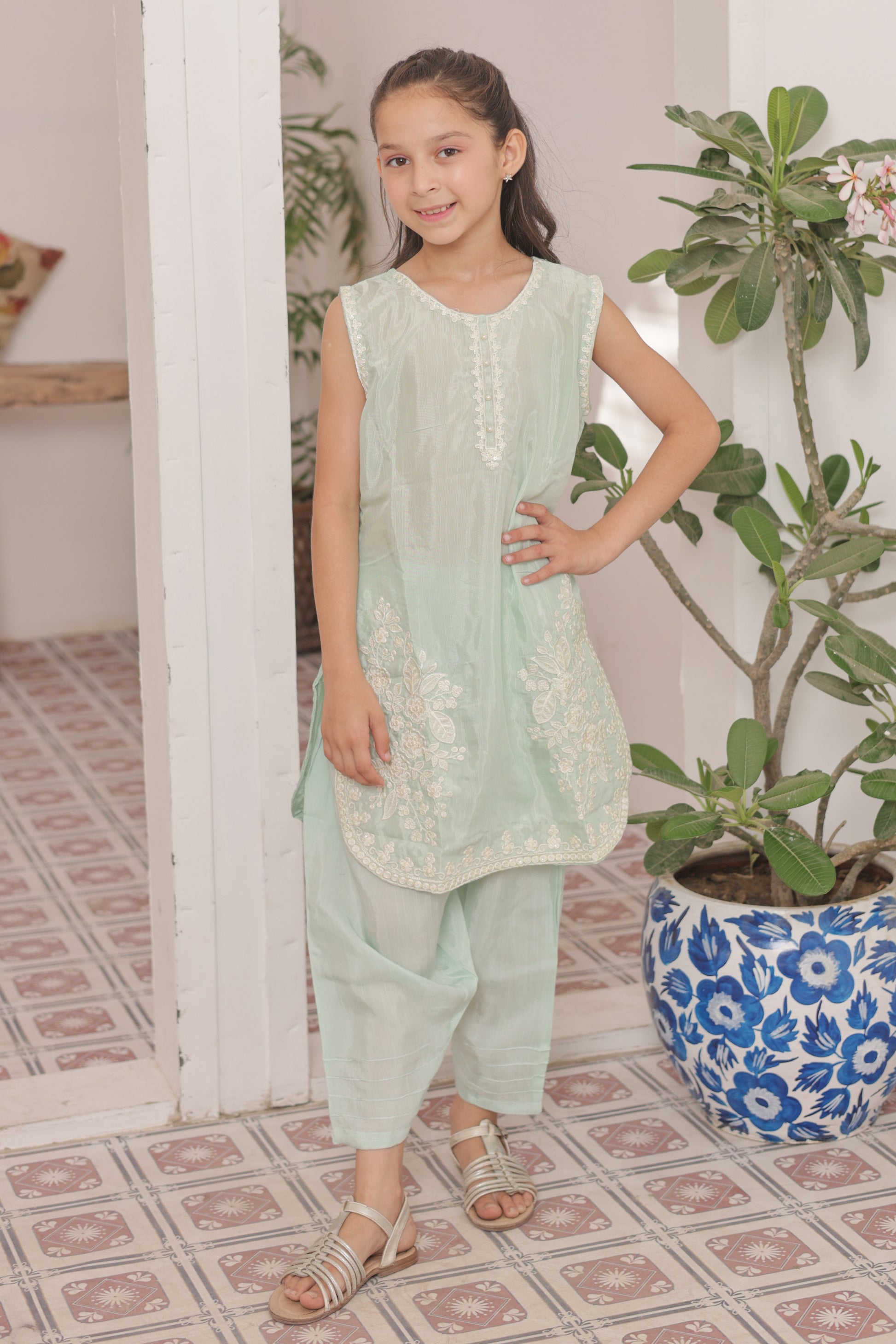 Fabric: Raw Silk Pattern: Embroided Color: Ice Green Design/Cut: Embroided Shirt with Farshi shalwar.