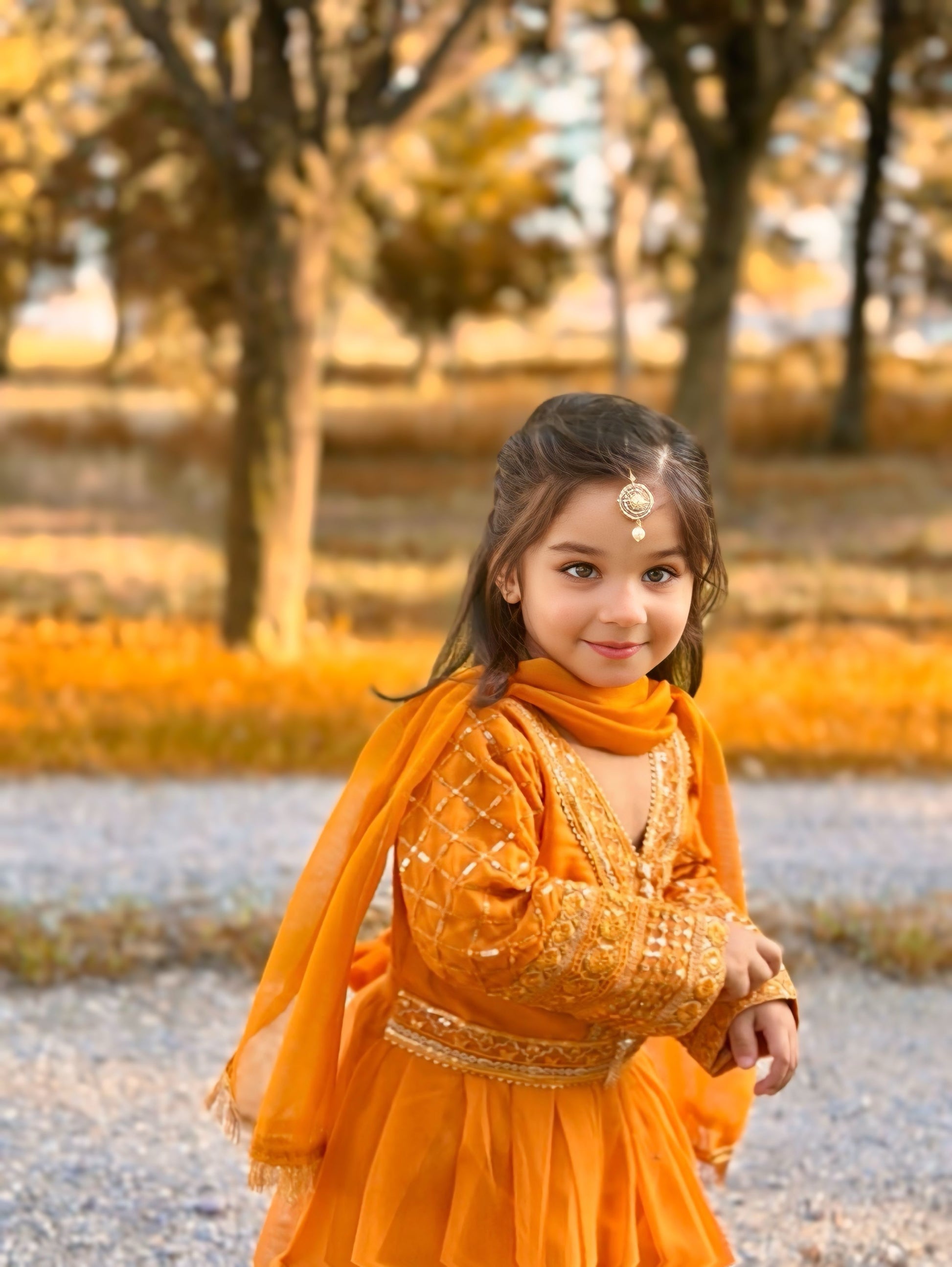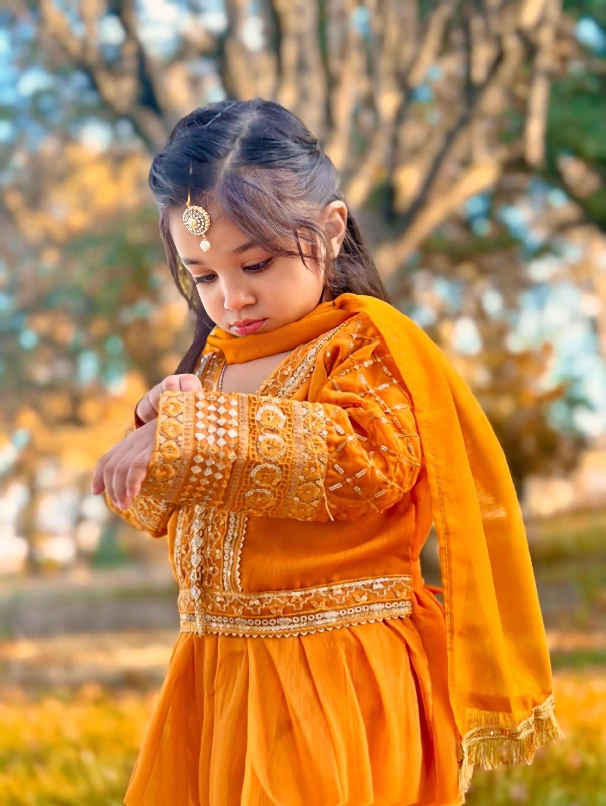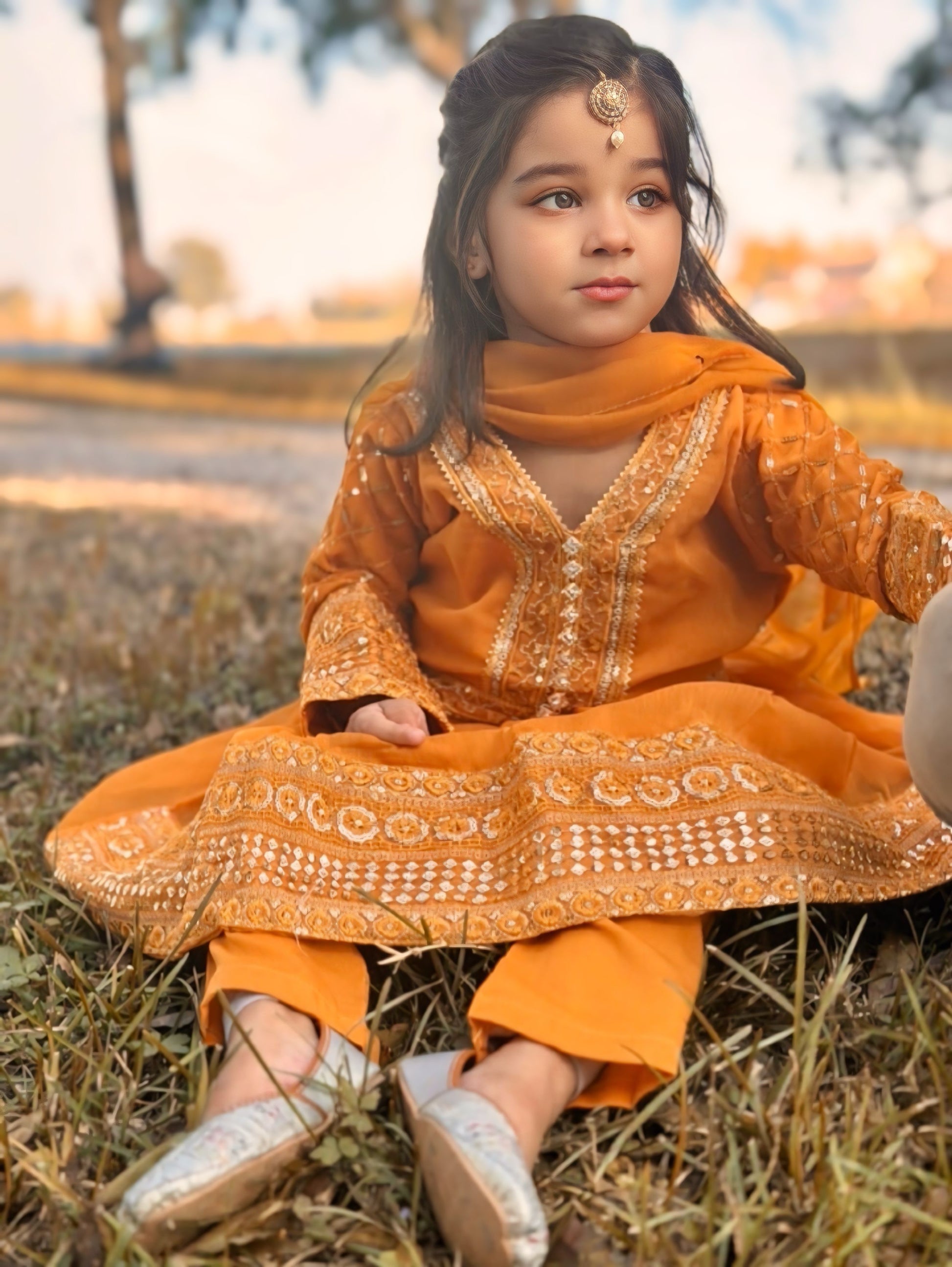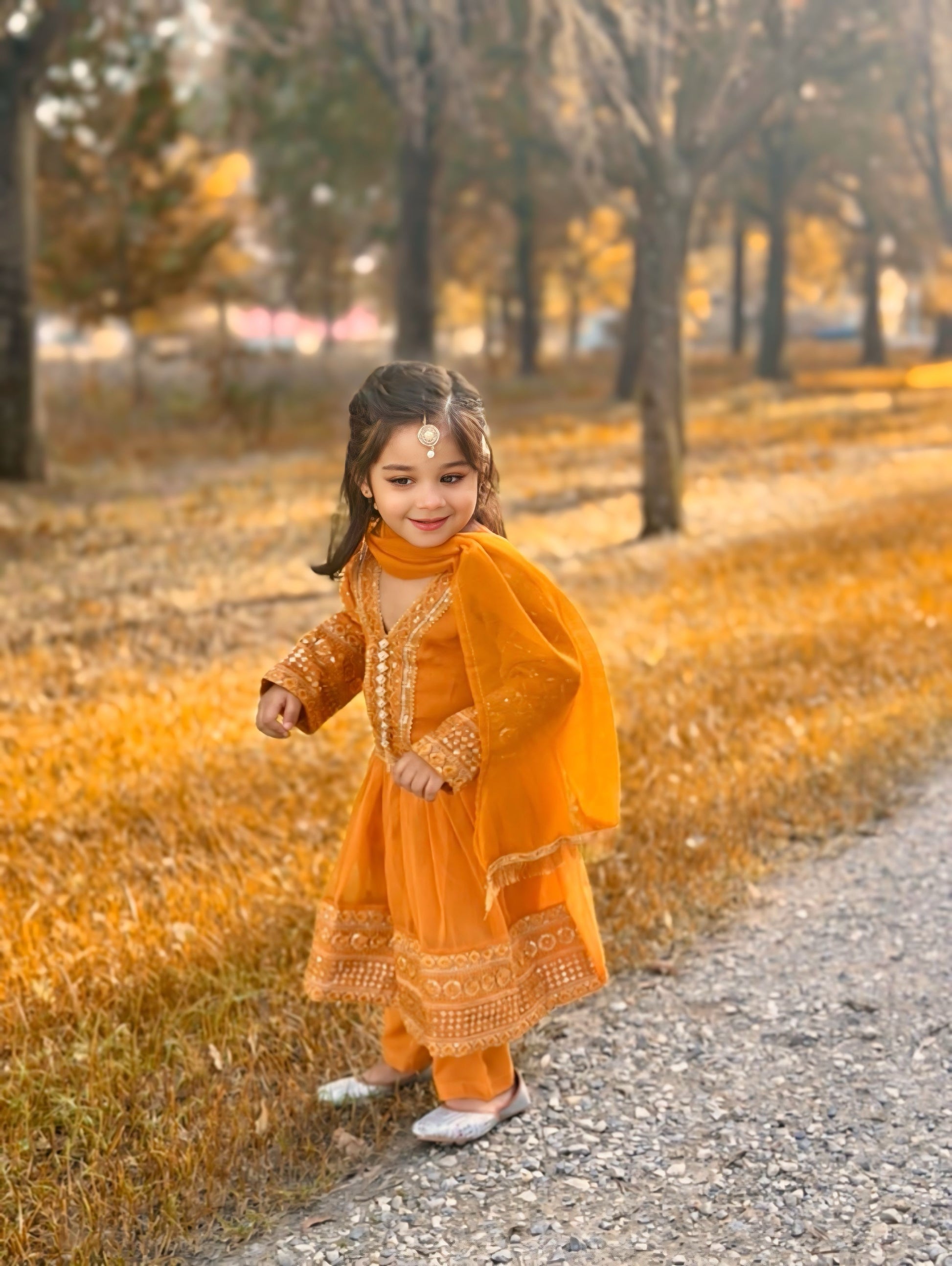 Fabric: chiffon Pattern: Fancy Embroidery Color: Orange Design Cut: Frock + Trouser+ Dupatta (Dupatta Included) Shiffon Embroided Frock crafted specially for kids is adorned with exquisite Trouser is a testament to craftsmanship. This product is designed for all seasons.