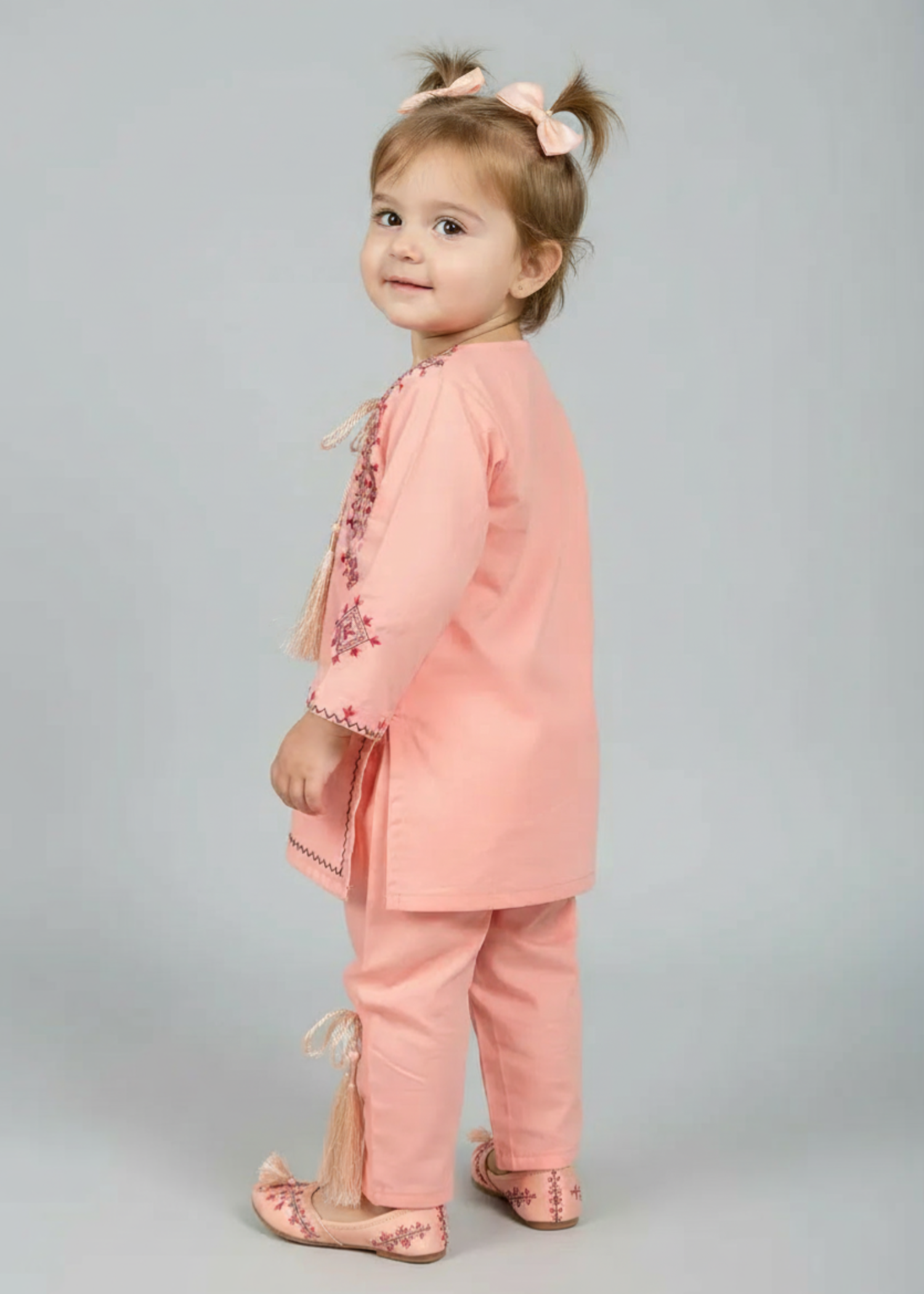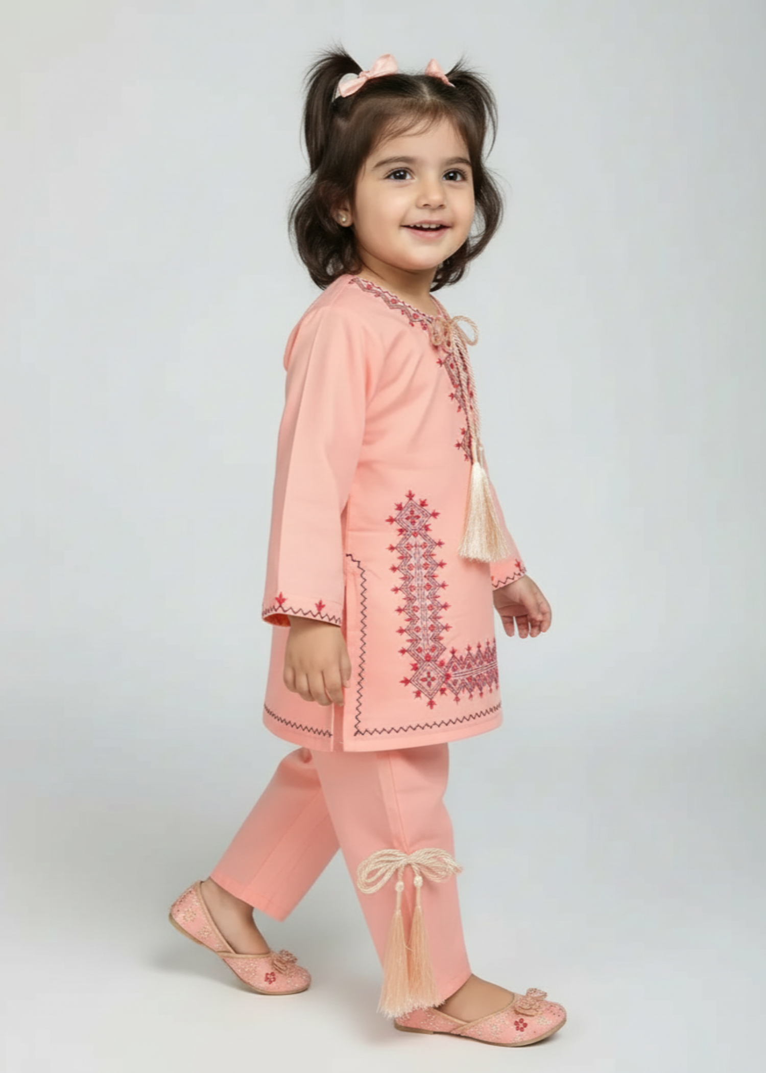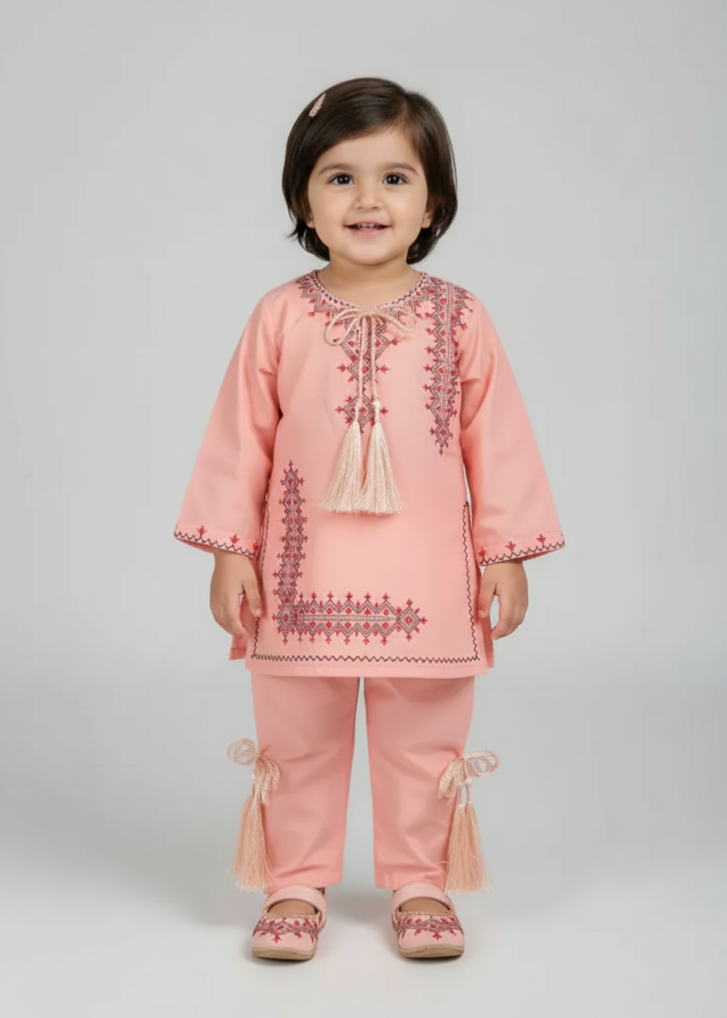 Fabric: Fine Soft Cotton Pattern: Embroided Color: peach pink Design/Cut: 2pcs Straight Shirt + Trouser Elevate your child's fashion game with Khanak's Stitched Cotton Jacquard Shirt and Trouser set. Crafted specifically for kids, this sophisticated ensemble showcases high-quality cotton jacquard fabric, offering a perfect blend of style and comfort. Ideal for both casual and semi-formal events, it’s a must-have addition to their wardrobe.
