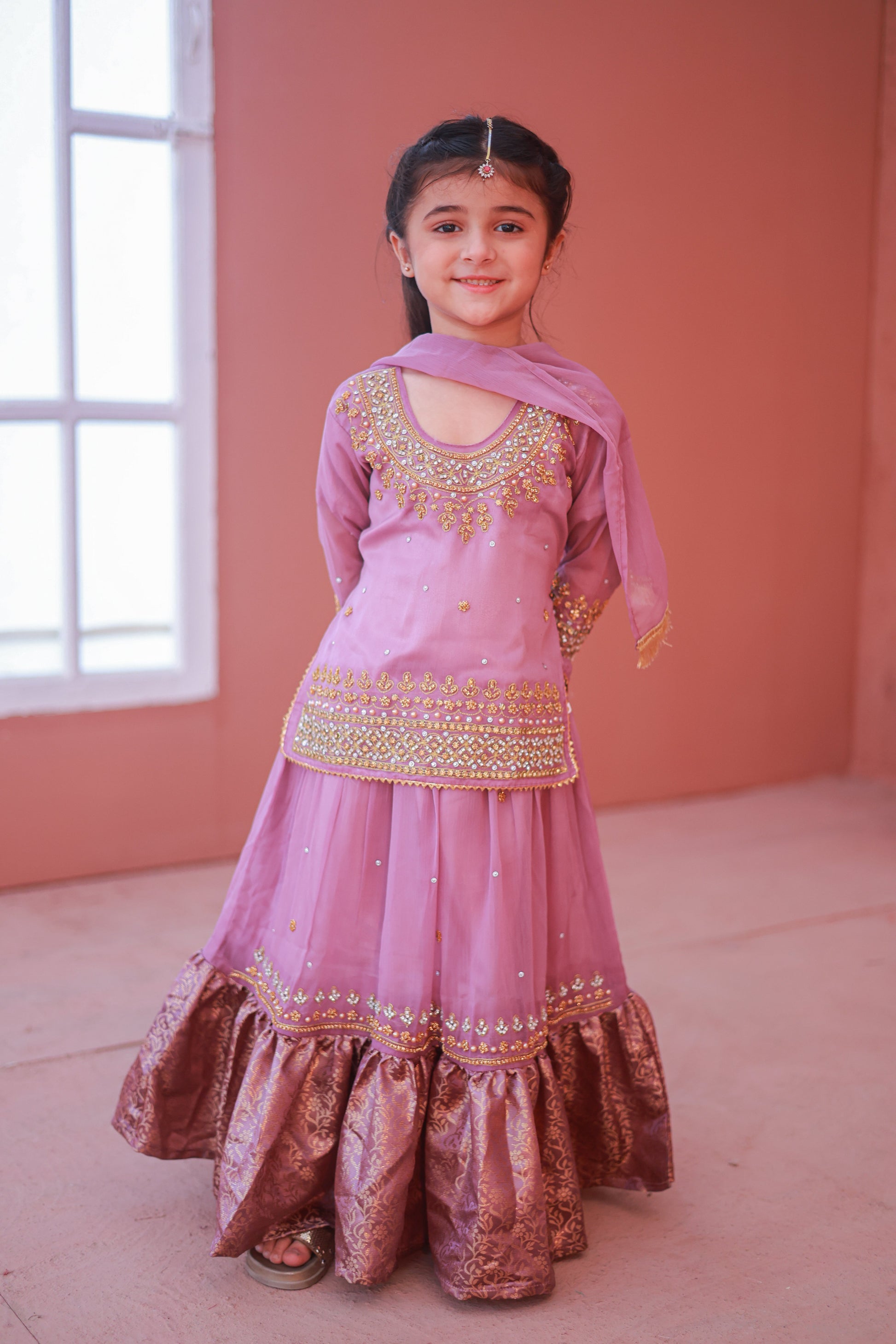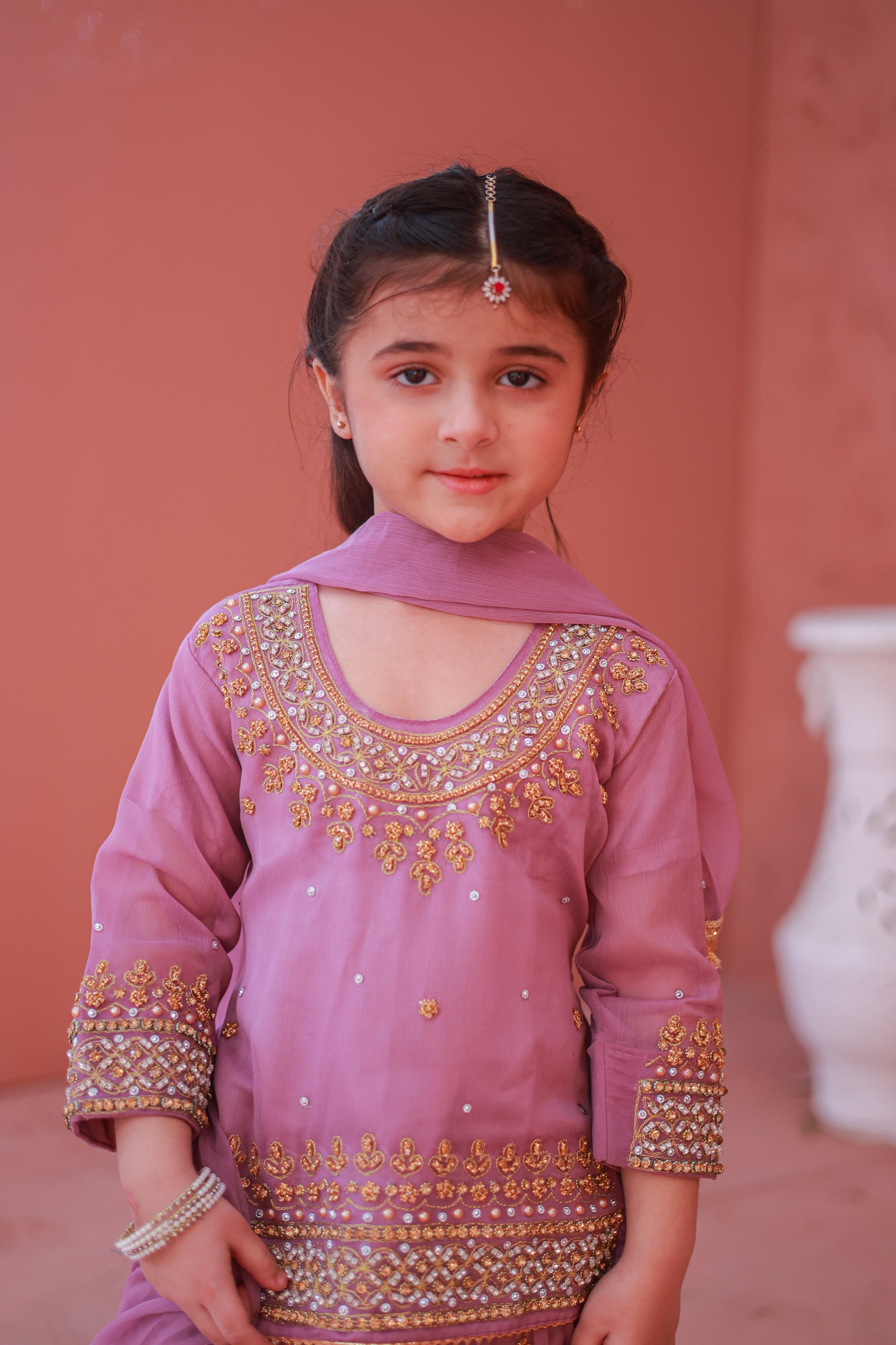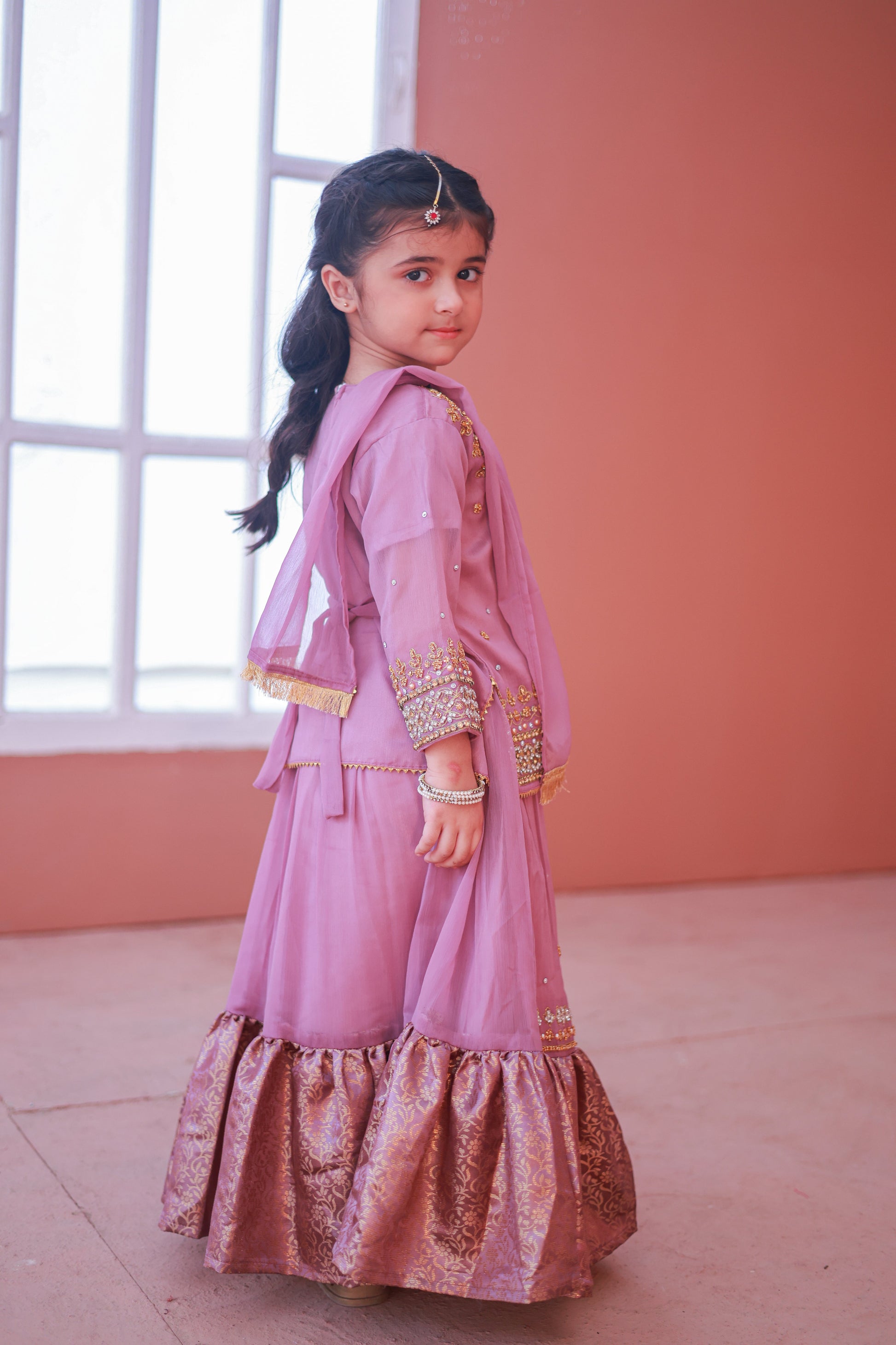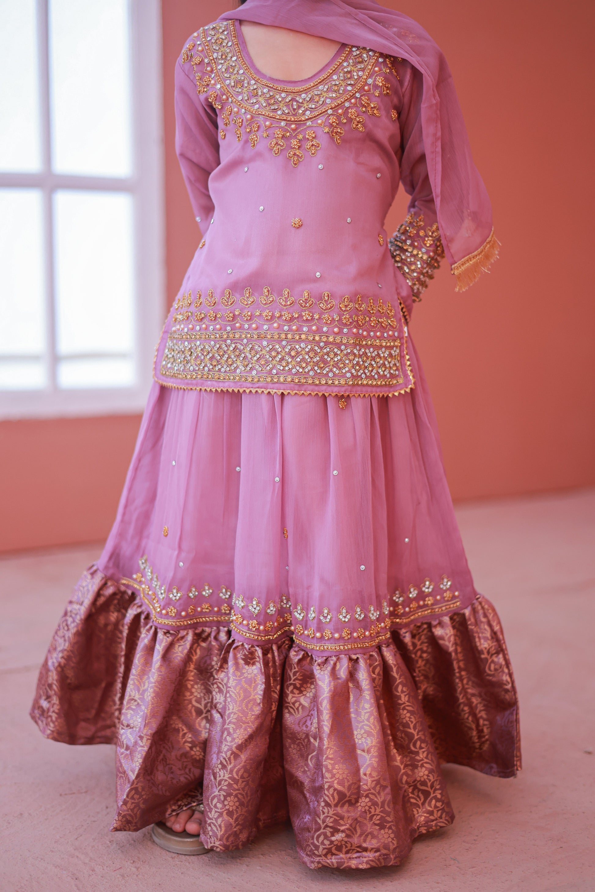Fabric: chiffon Pattern: Handwork Color: muave Pink Design Cut: kurti + Lehnga + Dupatta Premium chiffon kurti is adorned with exquisite hand work Banarsi Style embroided Lehnga is a testament to craftsmanship.