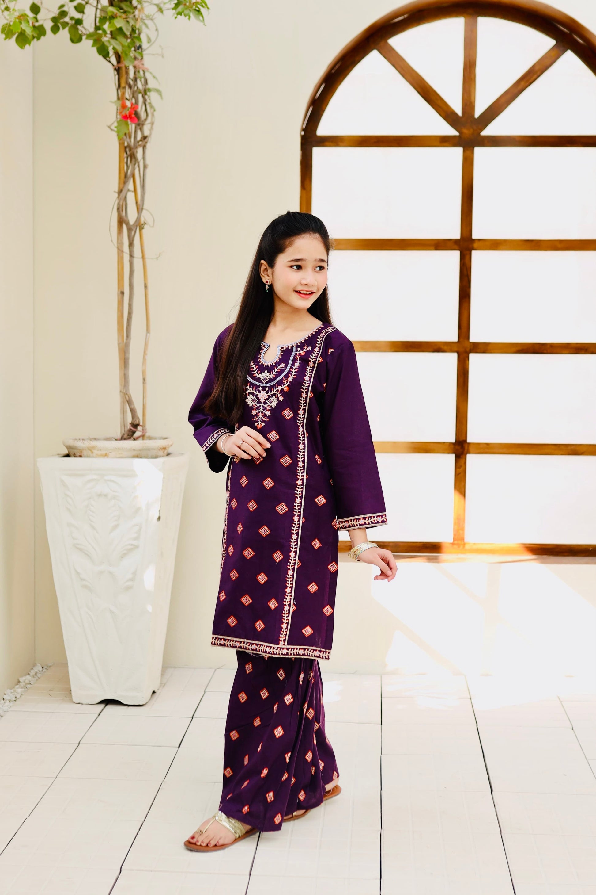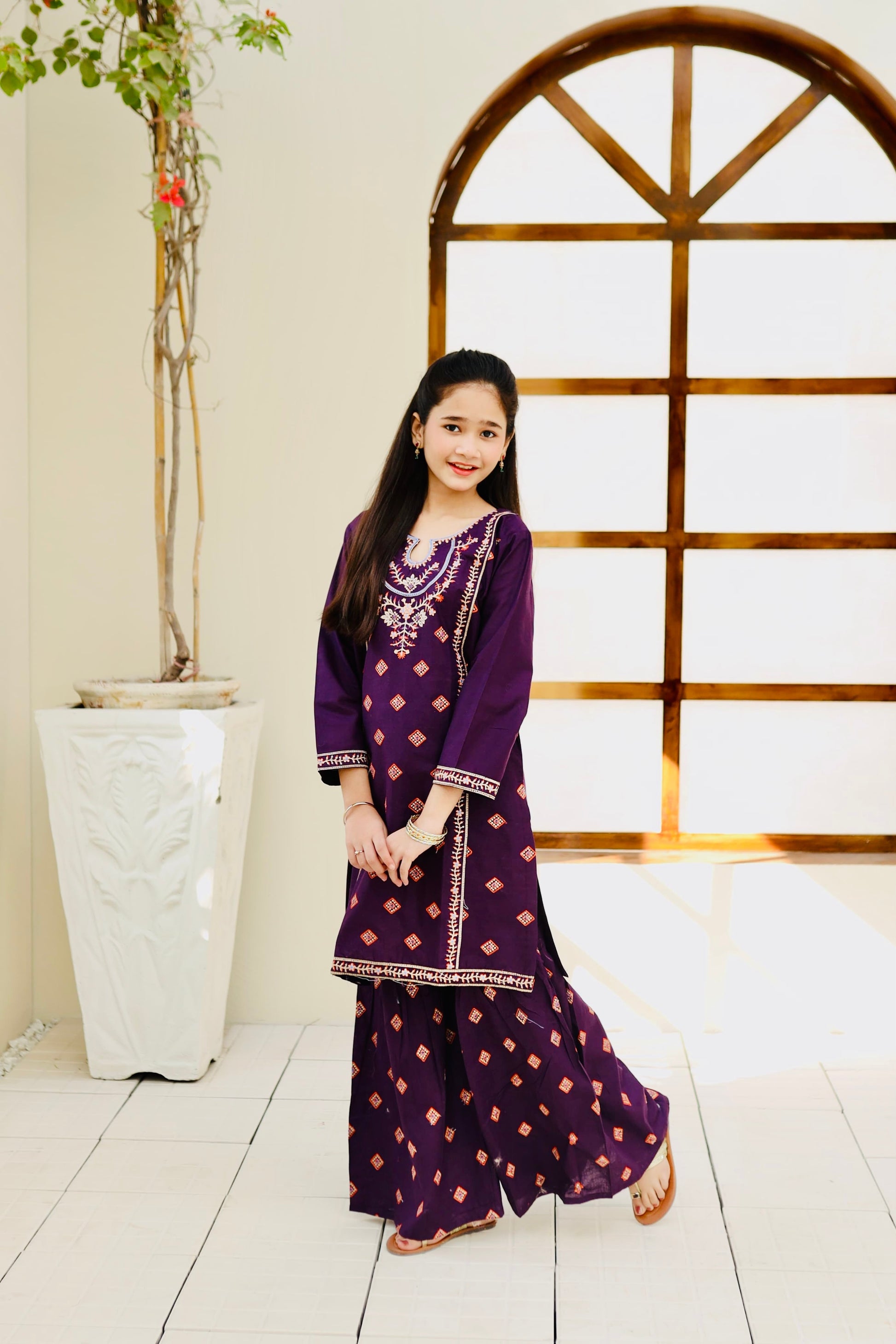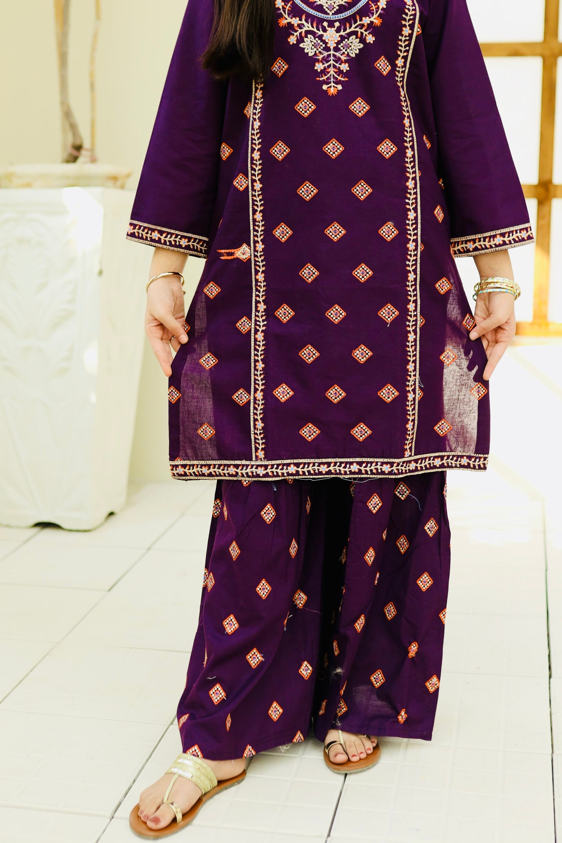 Fabric: Cotton Pattern:embroidered Color: Purple Design/Cut: 2-Pcs Straight Shirt and Gharara This product is designed for all seasons.