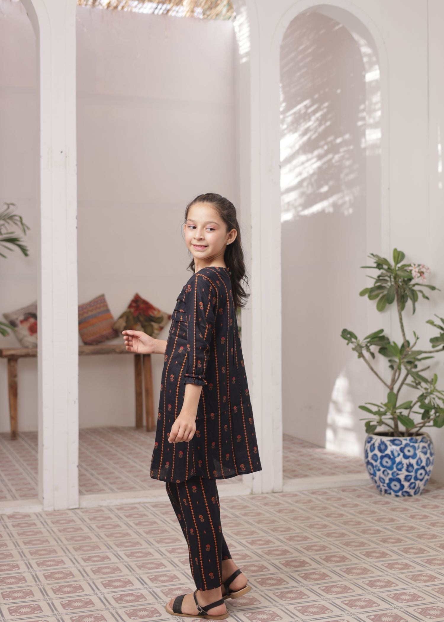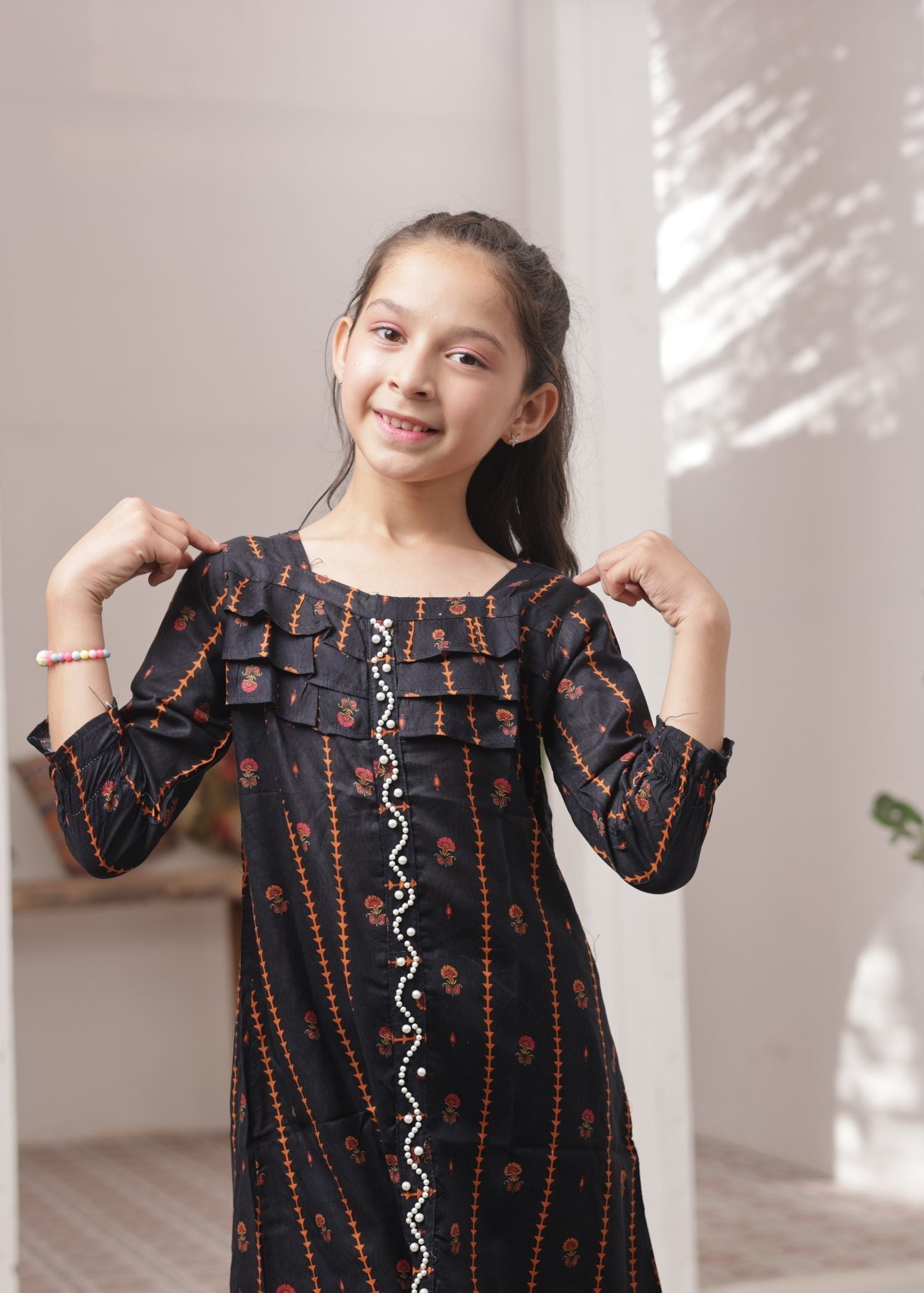 Fabric: Premium Lawn Pattern: Digital Print with Lace work and Beads. Color: Raven Black Design/Cut: 2 Pcs Frock style. Enhance your child's wardrobe this summers with Khanak's Printed Lawn Stitched 2-Piece set. This stylish ensemble includes a digitally printed shirt and cozy trousers, making it the ideal choice for casual outings or fun-filled adventures.
