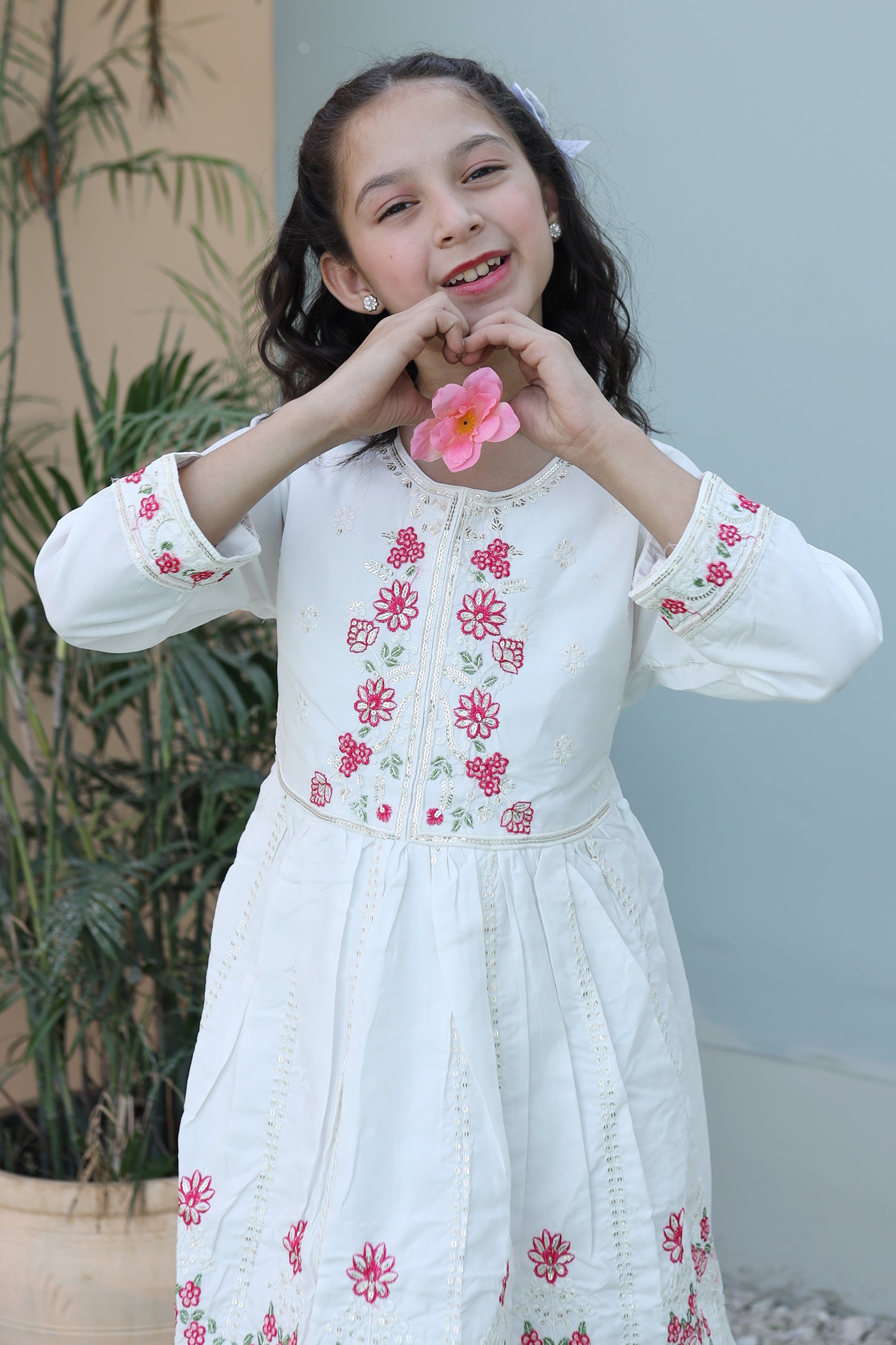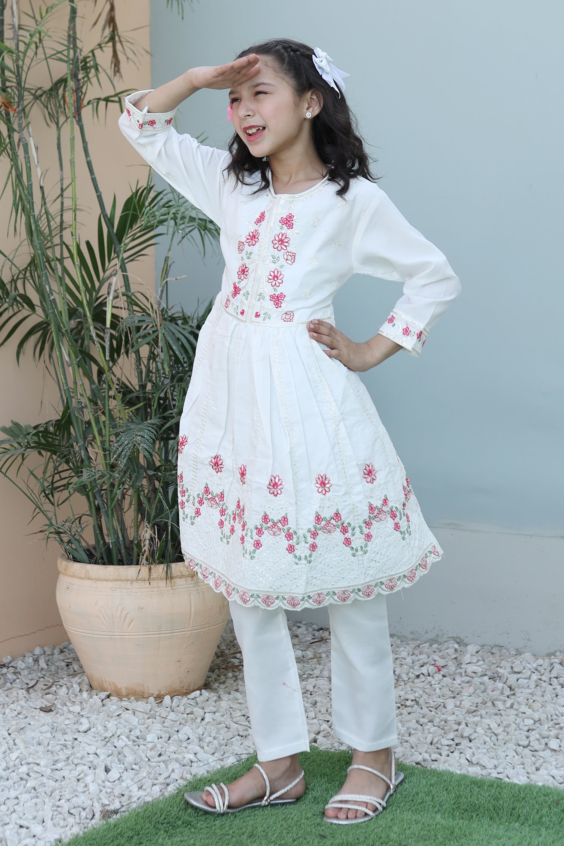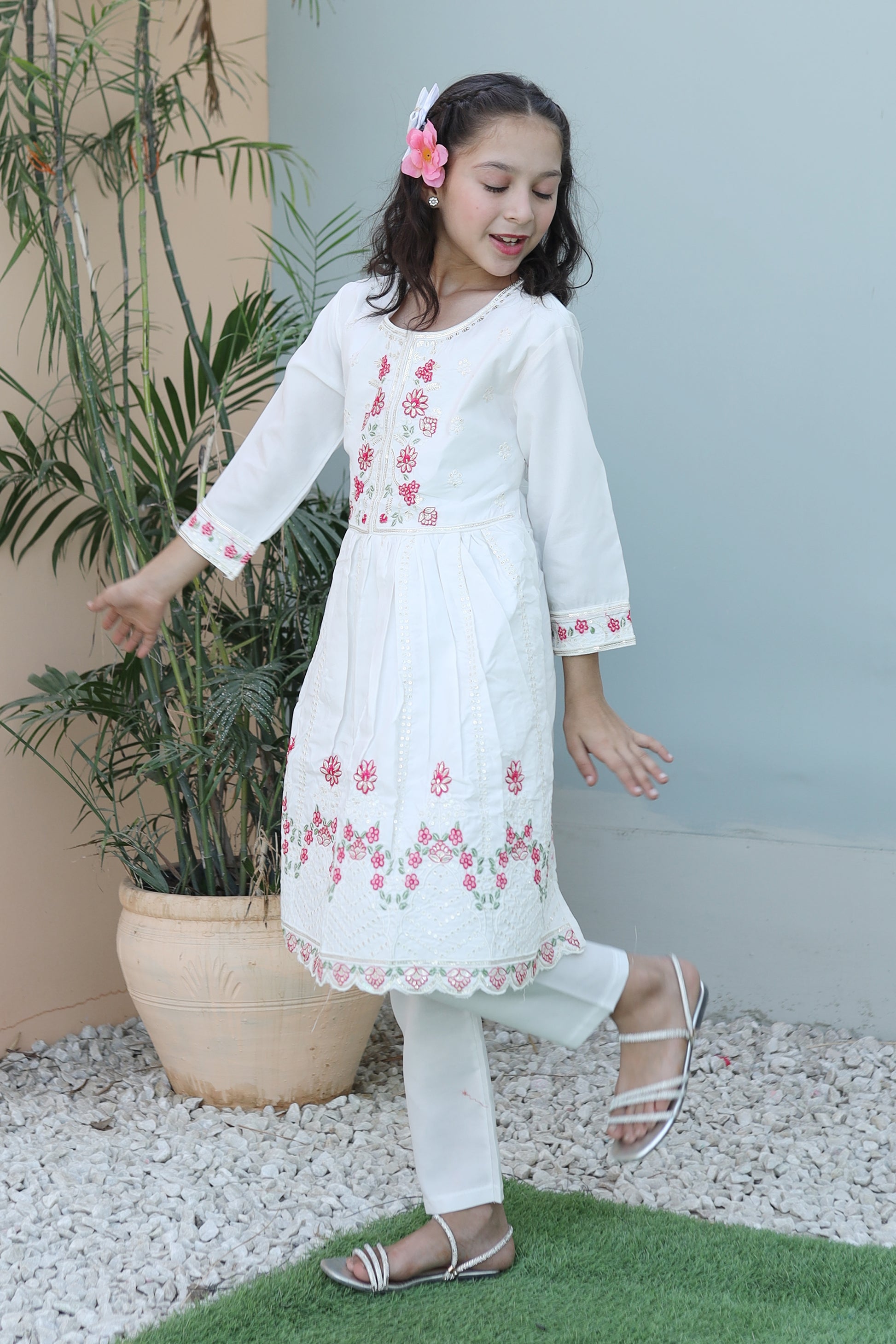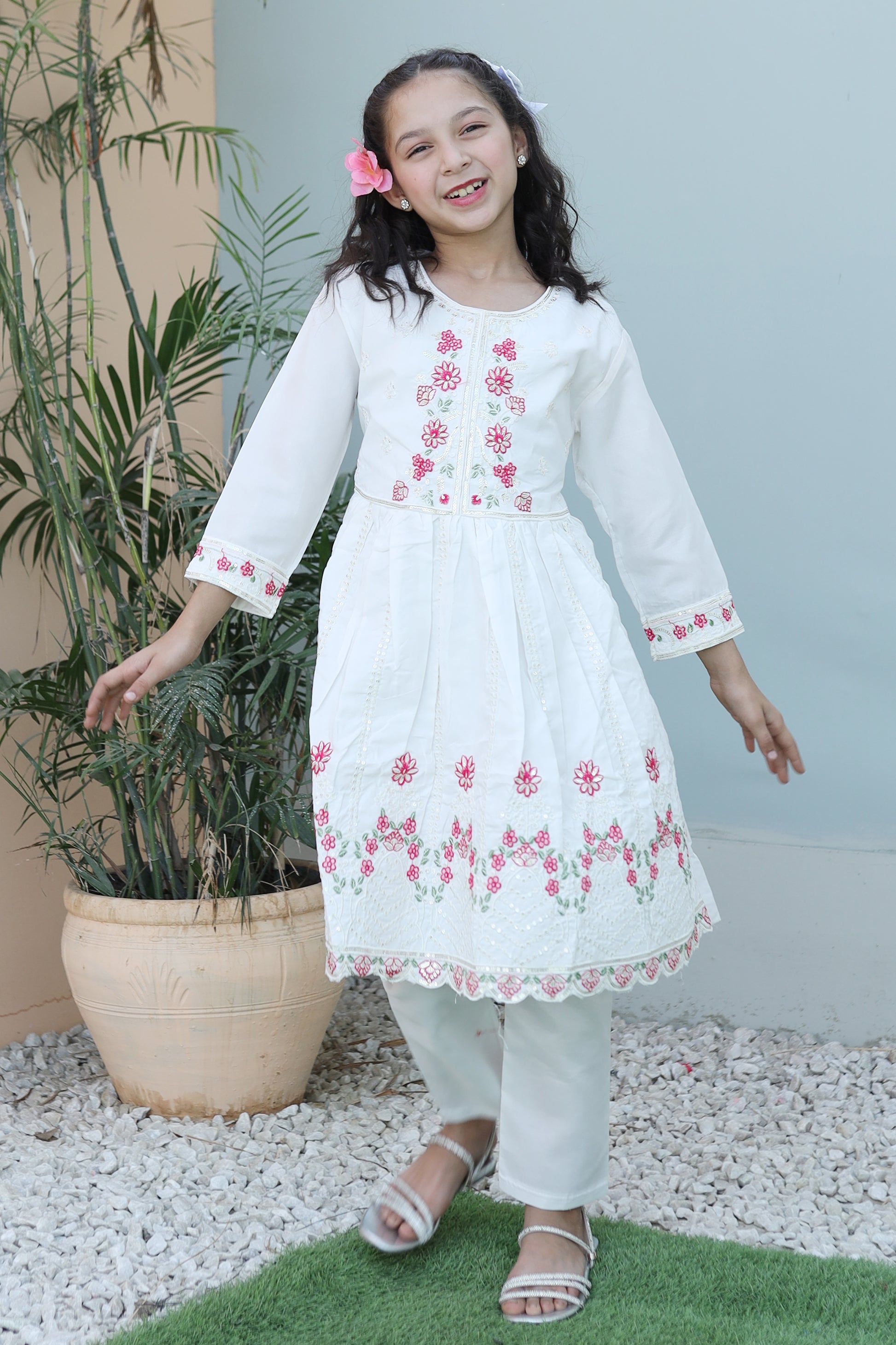 Elevate your child's fashion game with Khanak's Stitched Cotton Frock and Trouser set. Crafted specifically for kids, this sophisticated ensemble showcases high-quality cotton jacquard fabric, offering a perfect blend of style and comfort. Ideal for both casual and semi-formal events, it’s a must-have addition to their wardrobe. This product is designed for all seasons.