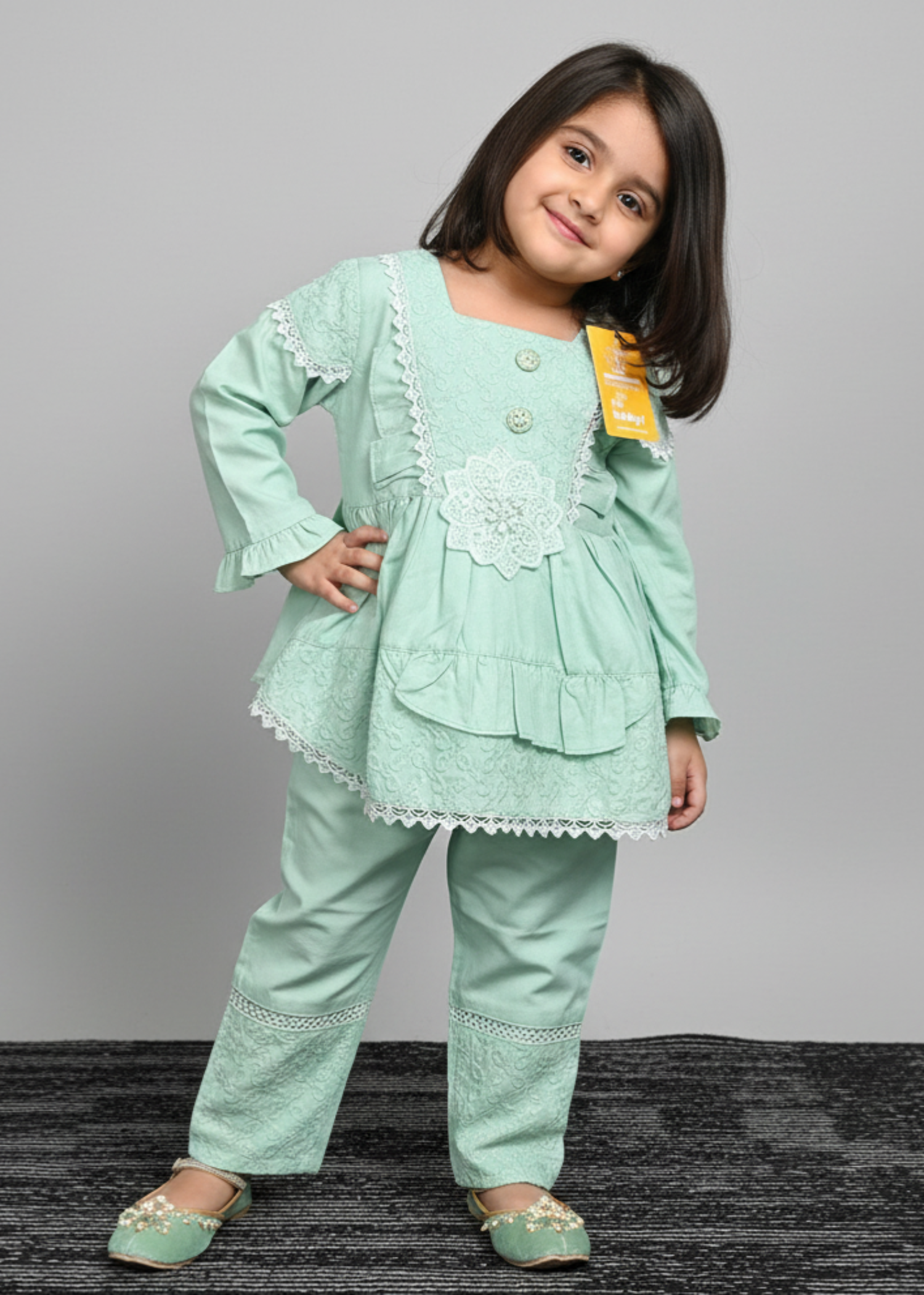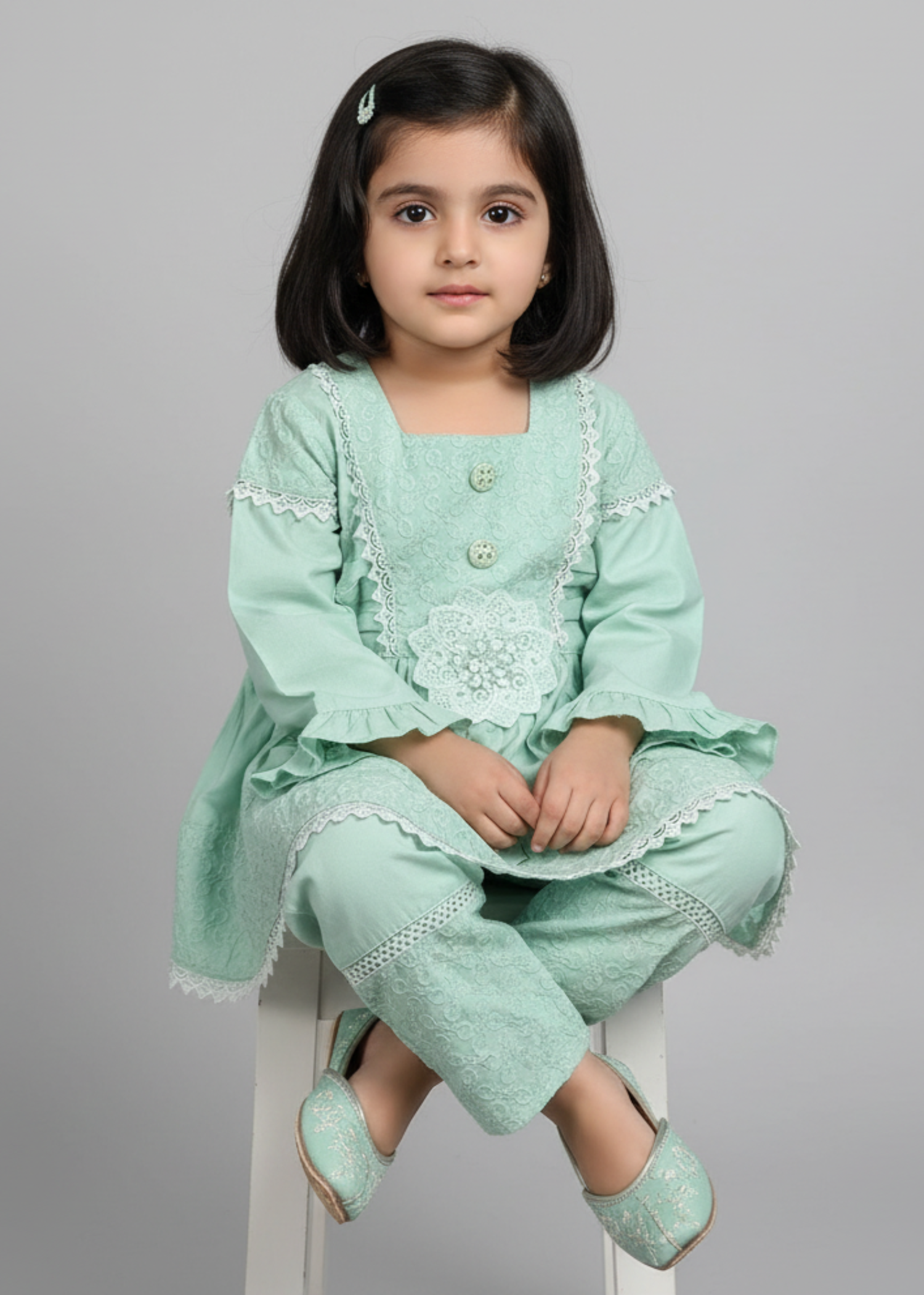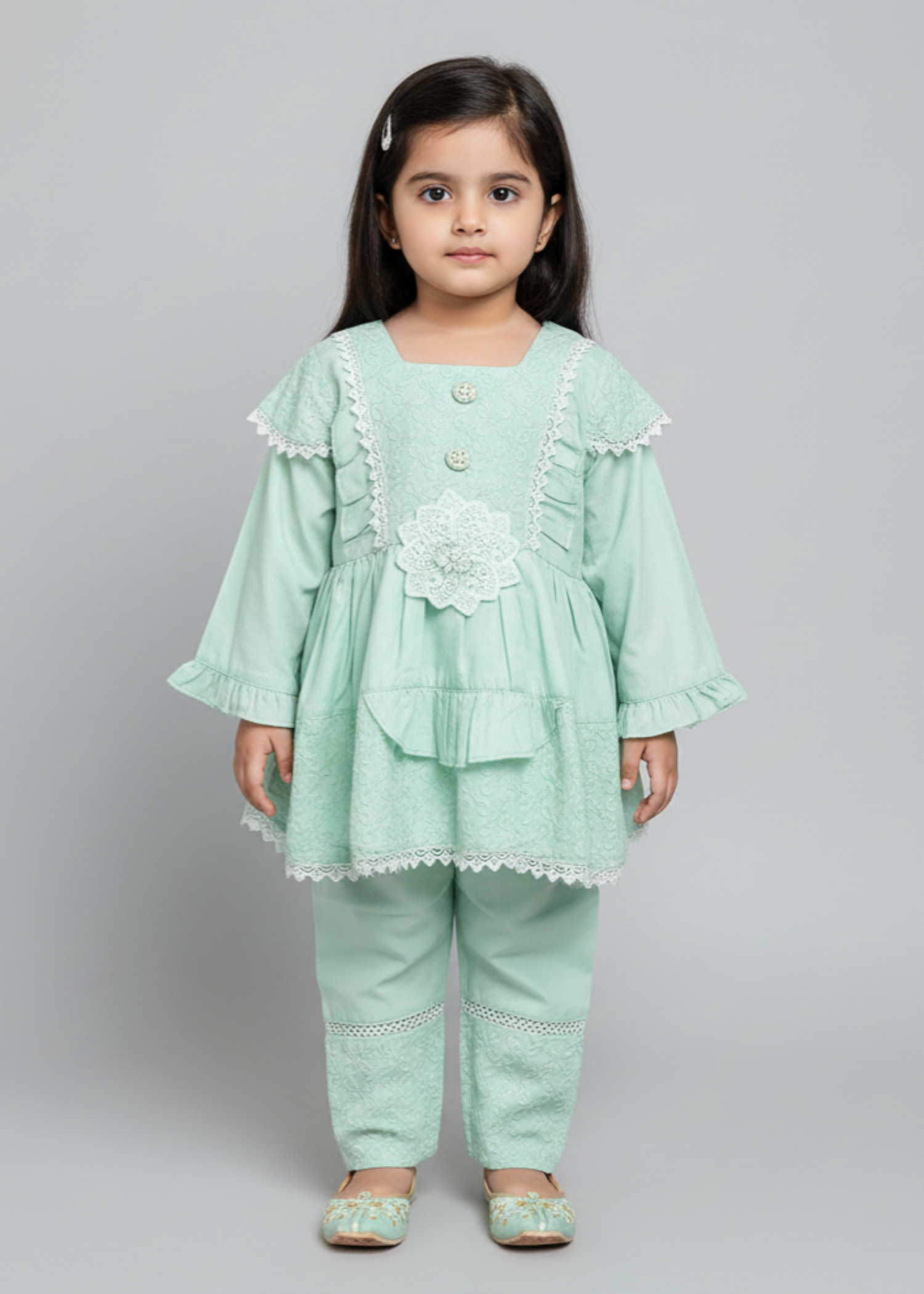 Design/Cut: Frock + Trouser Elevate your child's fashion game with Khanak's Stitched Cotton Frock and Trouser set. Crafted specifically for kids, this sophisticated ensemble showcases high-quality cotton jacquard fabric, offering a perfect blend of style and comfort. Ideal for both casual and semi-formal events, it’s a must-have addition to their wardrobe. This product is designed for all seasons.