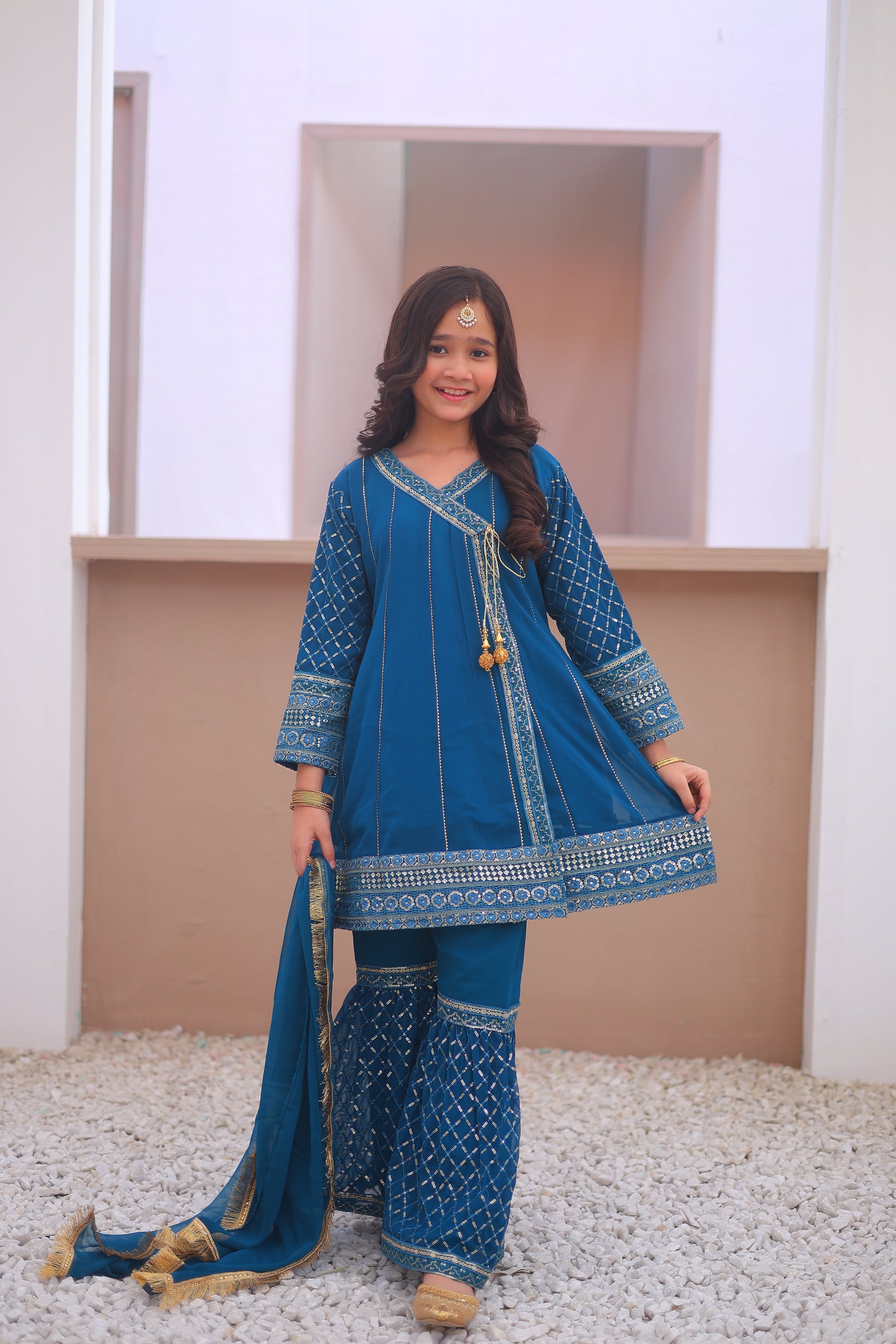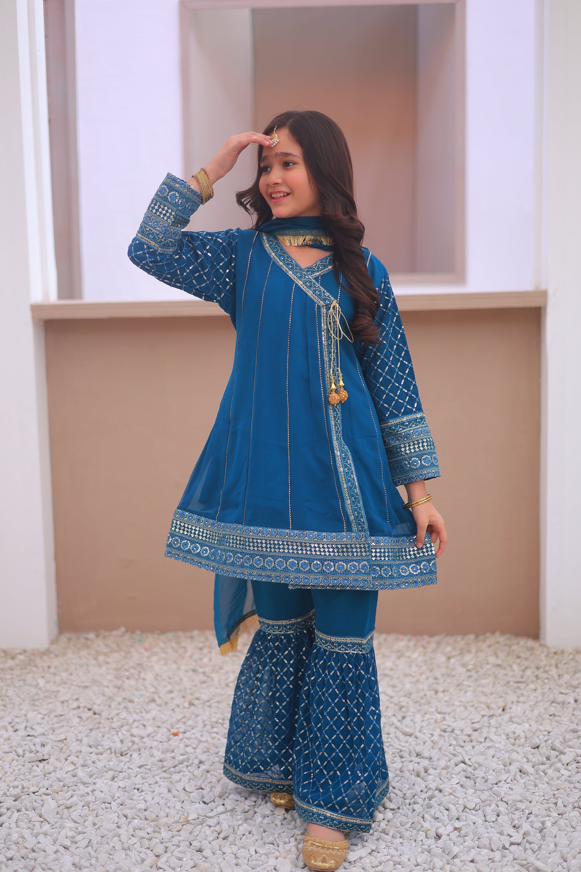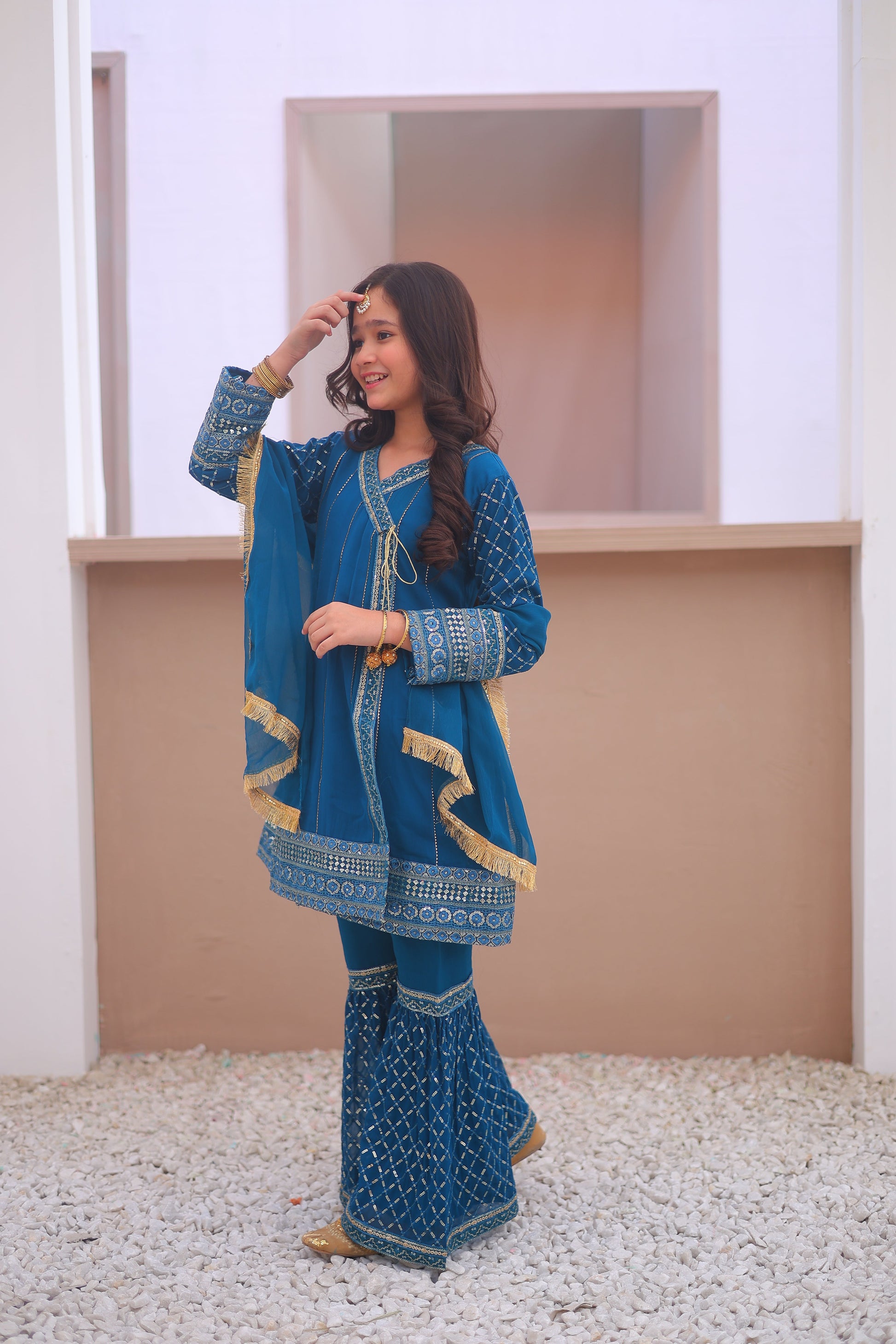 Fabric: Chiffon Pattern: Fancy Sequence Embroidery Color: Optional Design Cut: Angrakha and Gharara. (Dupatta Included) Chiffon Angrakha Style Shirt is adorned with exquisite sequence embroided Gharara is a testament to craftsmanship.Delivery Time