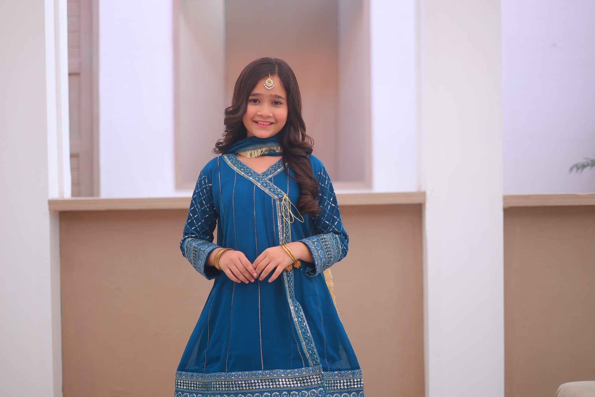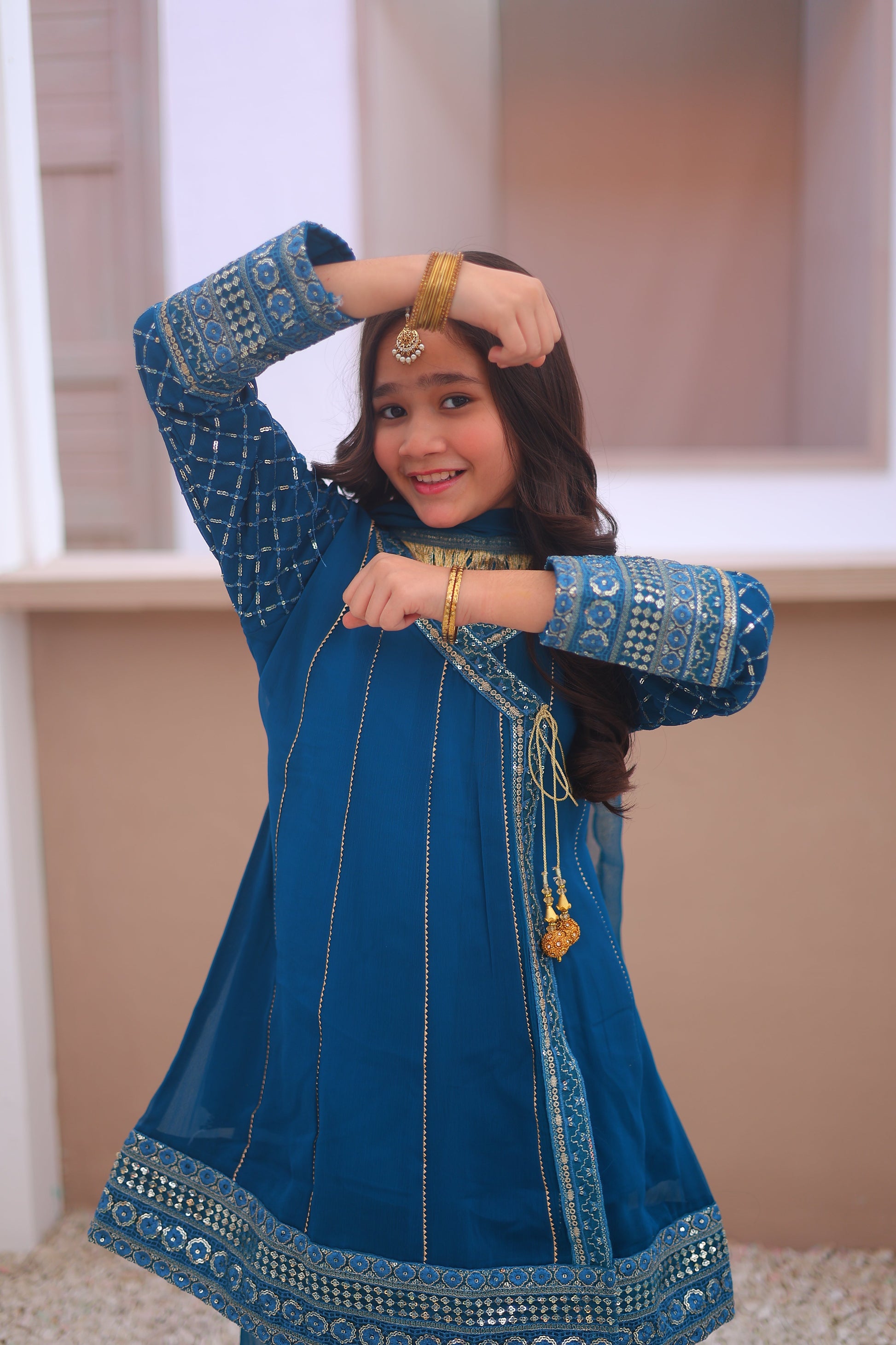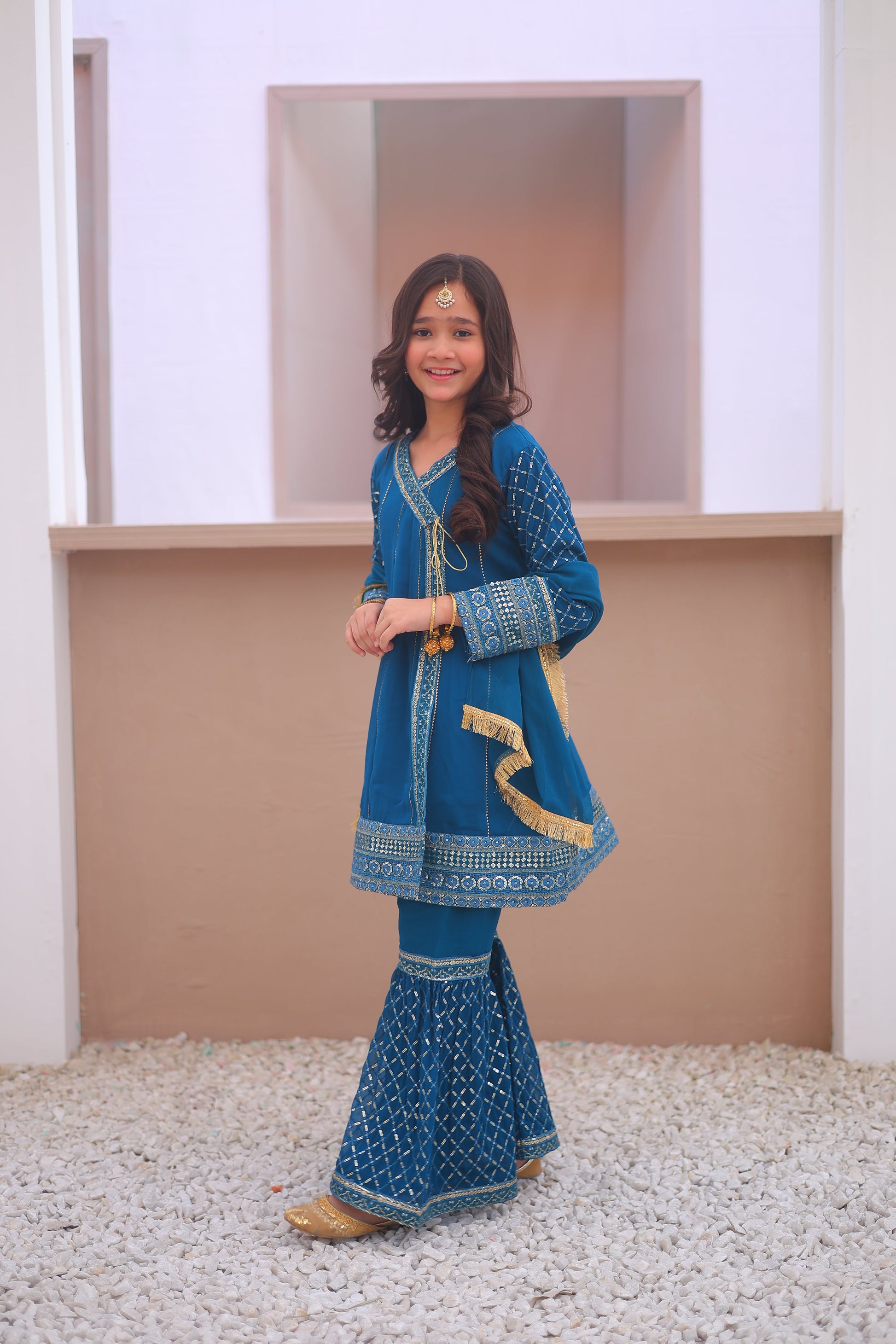 Fabric: Chiffon Pattern: Fancy Sequence Embroidery Color: Optional Design Cut: Angrakha and Gharara. (Dupatta Included) Chiffon Angrakha Style Shirt is adorned with exquisite sequence embroided Gharara is a testament to craftsmanship.Delivery Time