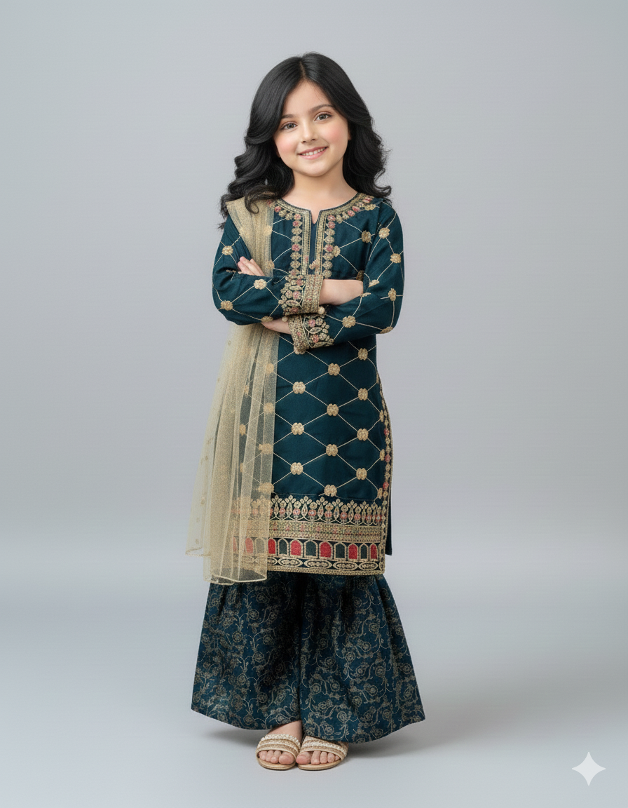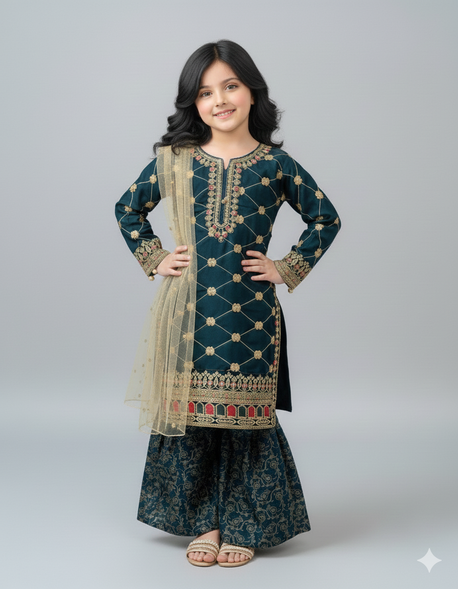 Design kurti + Gharara + Dupatta Elevate your child's fashion game with Khanak's Embroided Stitched raw silk kurti and Gharara set. Crafted specifically for kids, this sophisticated ensemble showcases high-quality raw silk fabric, offering a perfect blend of style and comfort. Ideal for both casual and wedding events, it’s a must-have addition to their wardrobe