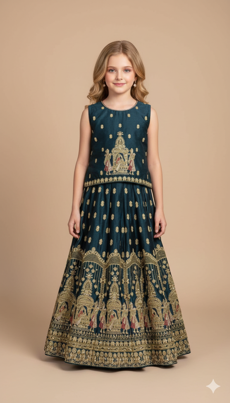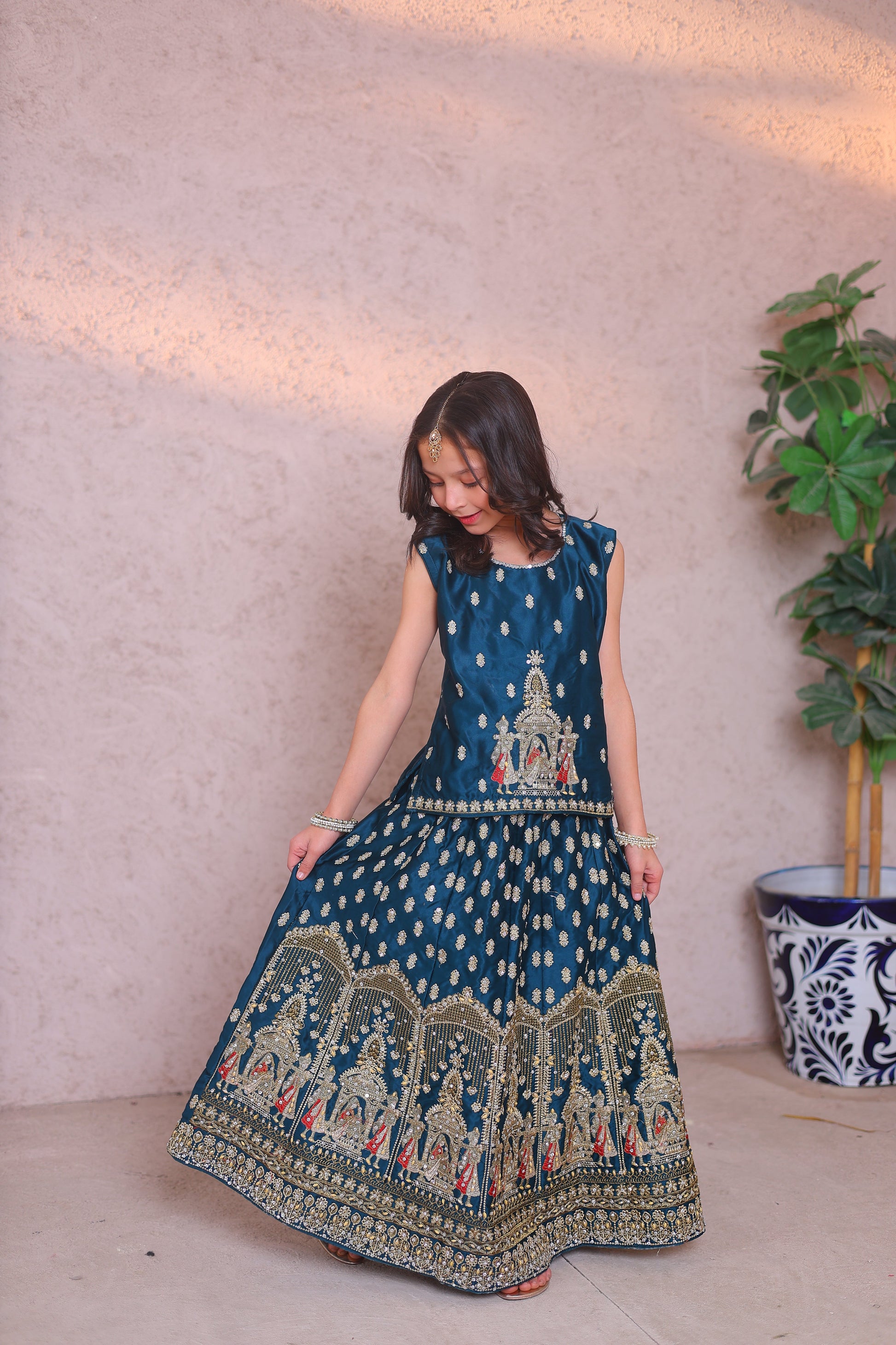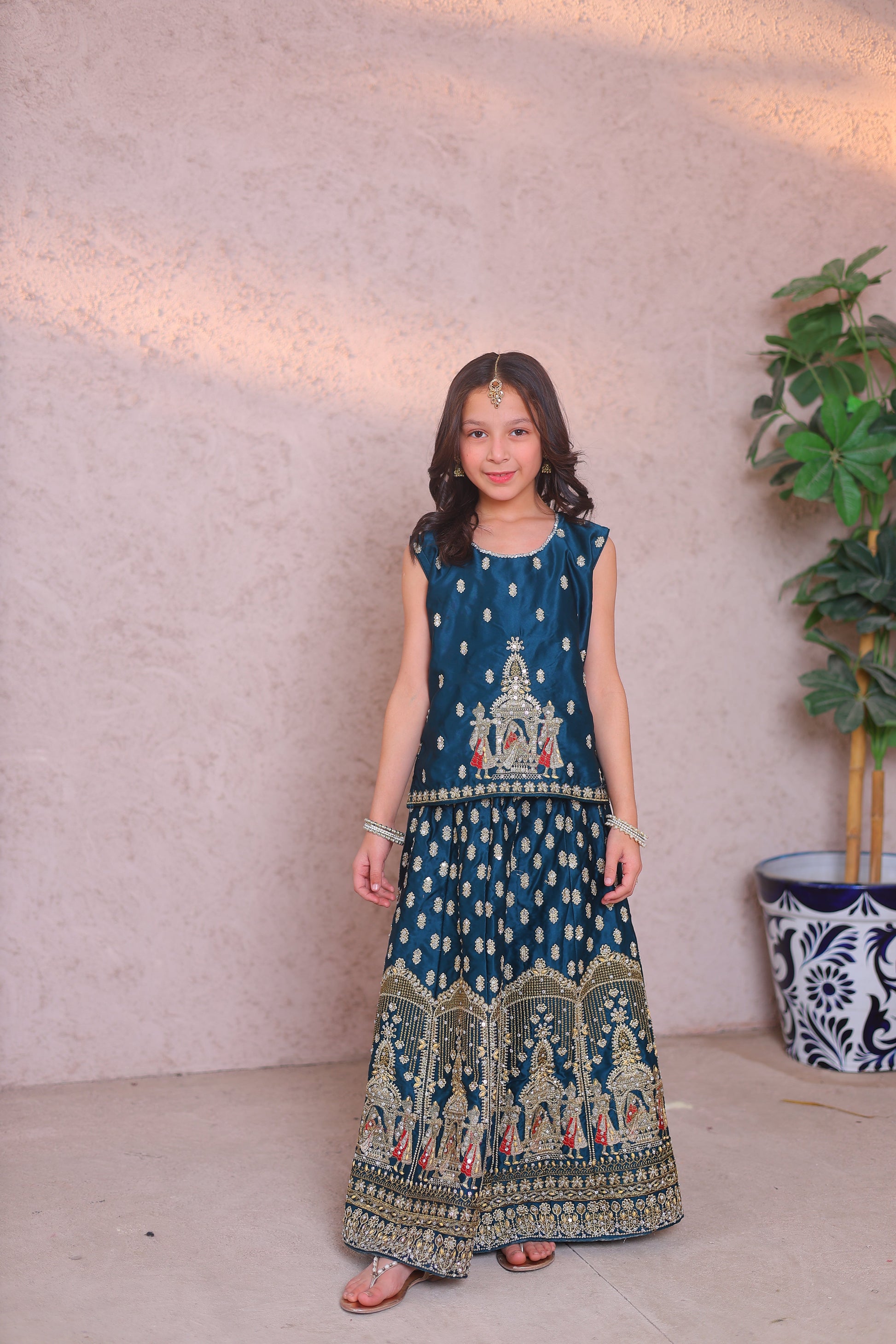 Fabric: Shamoz Silk Pattern: Fancy Embroidery Color:Peacock Design Cut: Lehnga Choli Shamroz Silk Choli is adorned with exquisite hand work embroided Lehnga is a testament to craftsmanship.